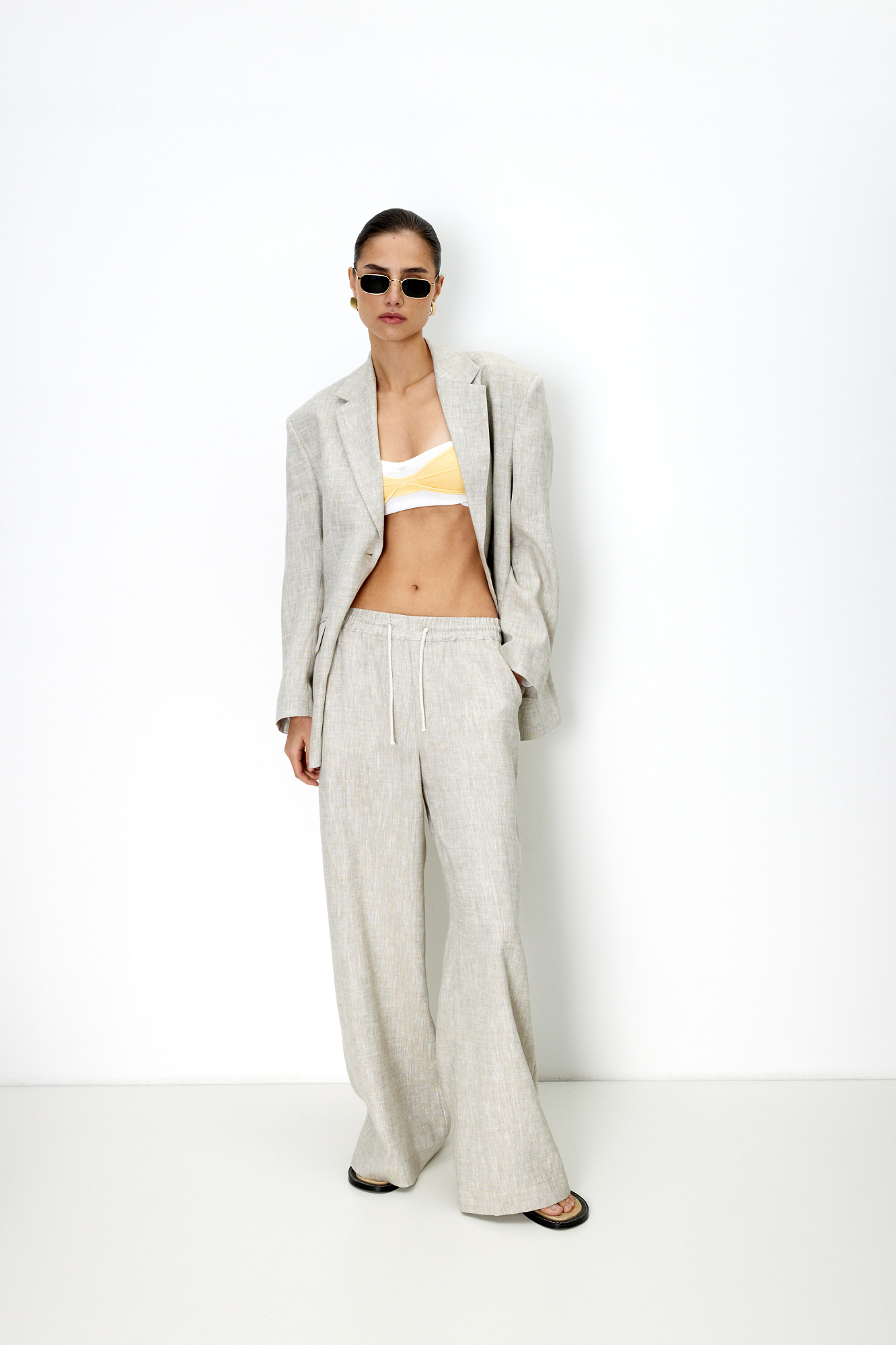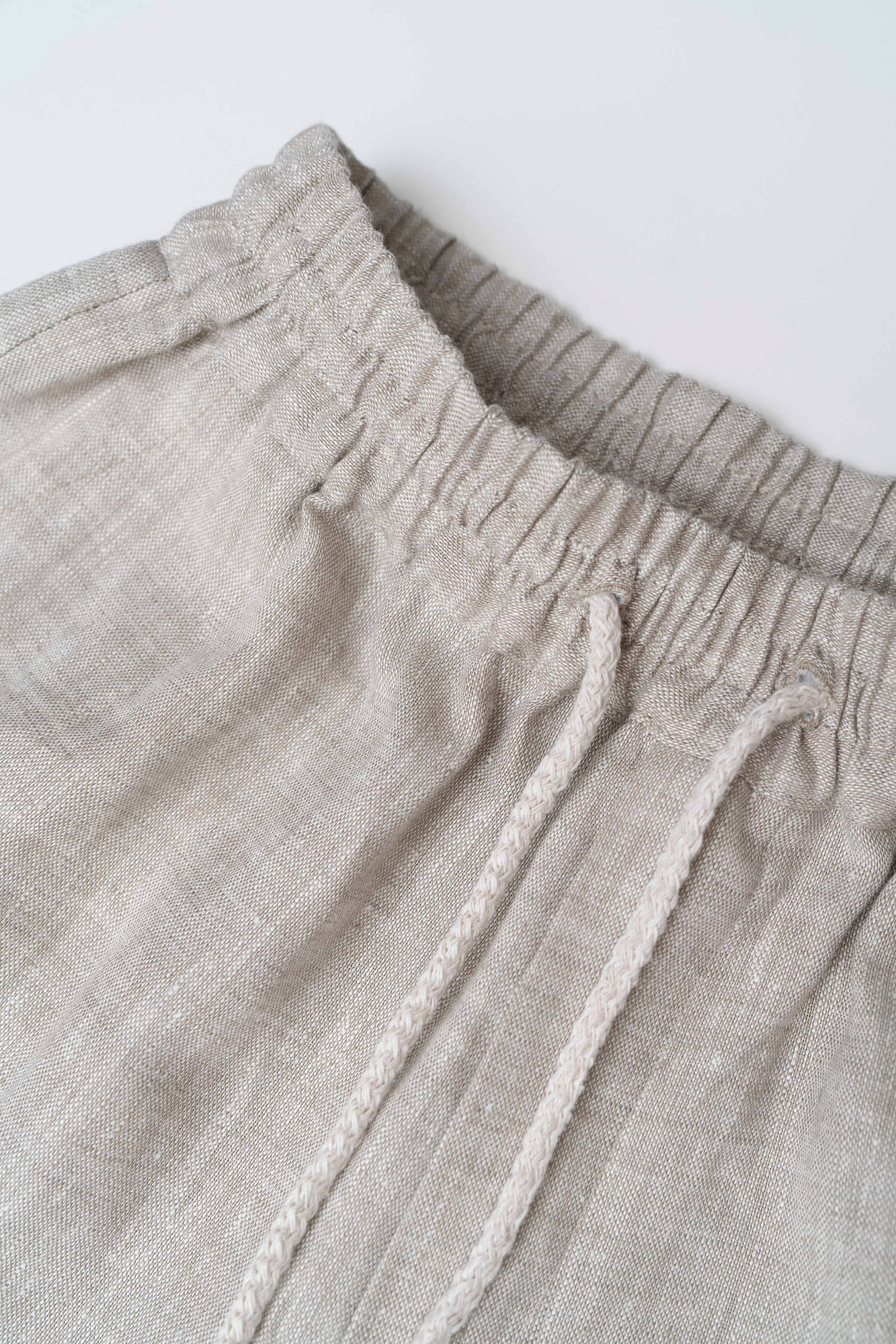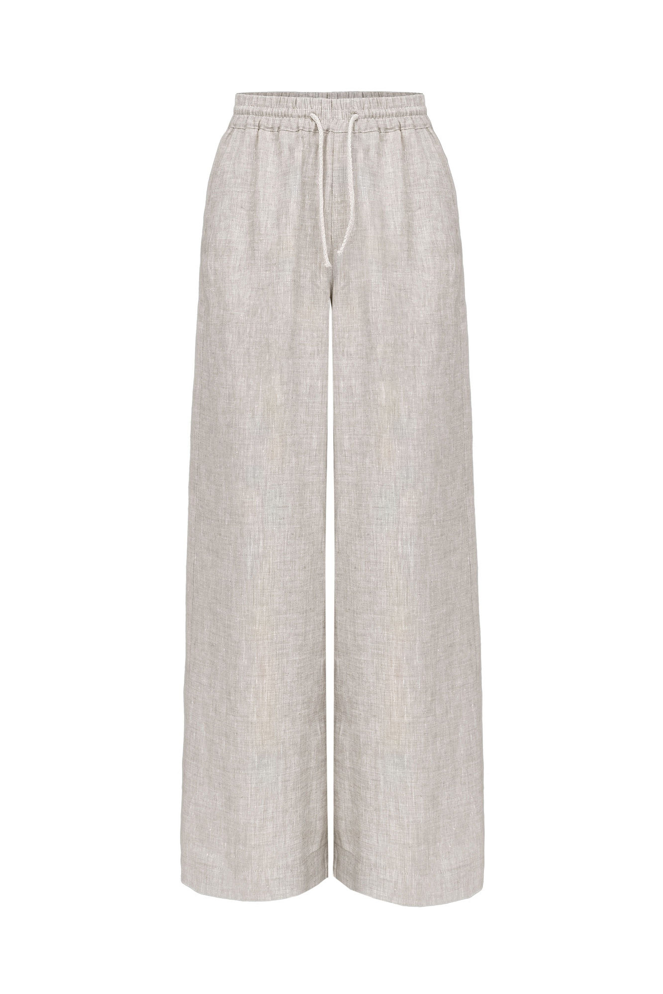 Широкие льняные брюки. Модель прямого силуэта с боковыми карманами и эластичным поясом на резинке с кулиской.