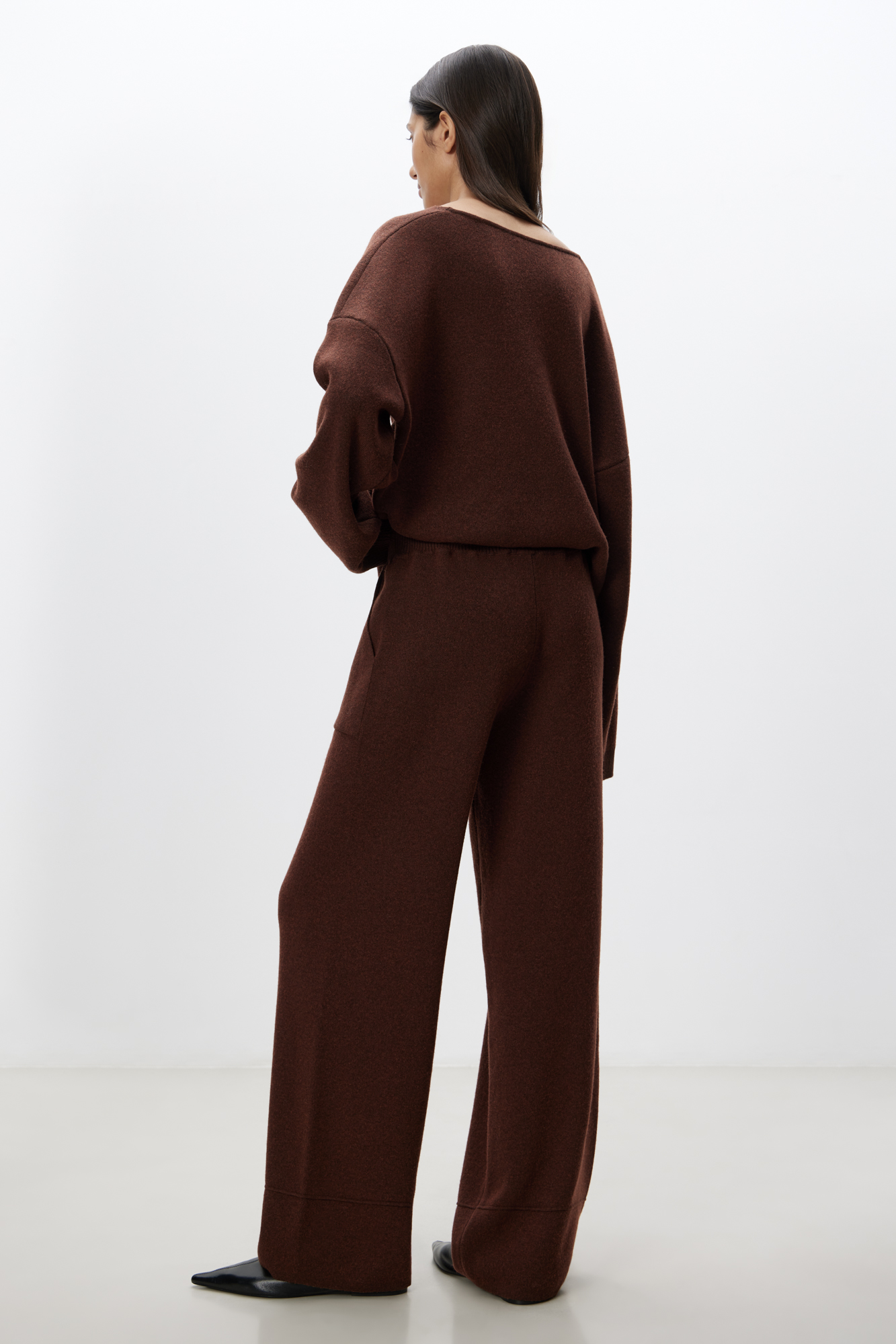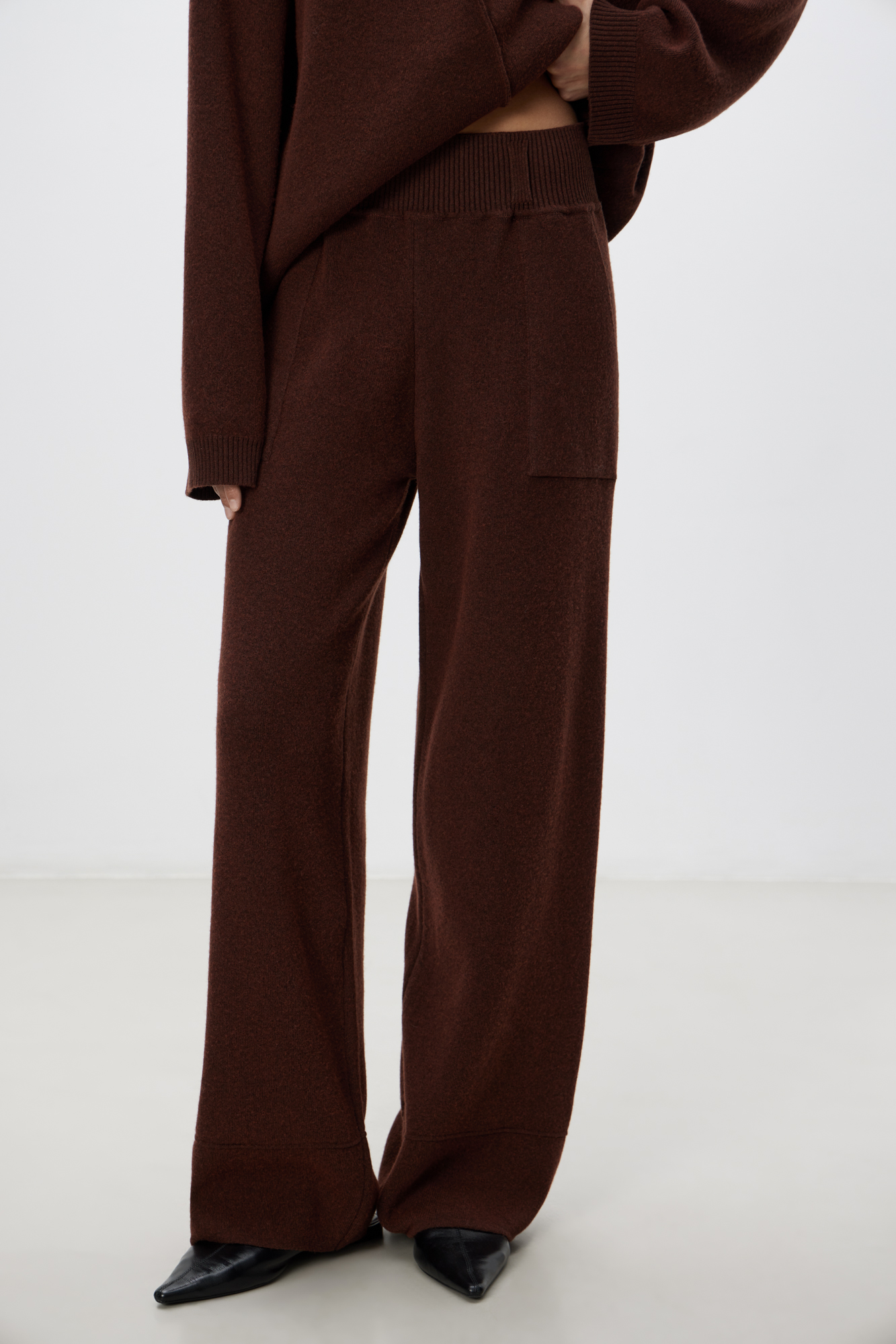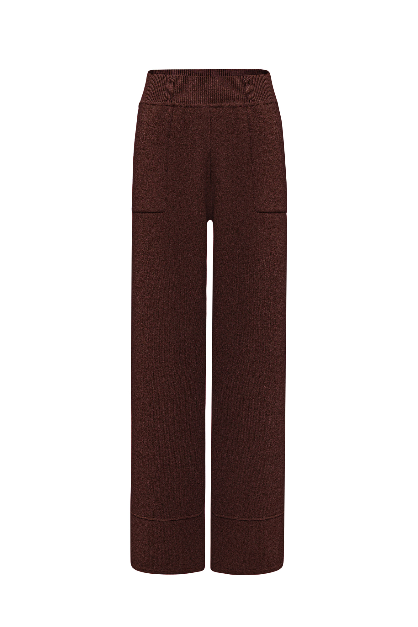 Прямые трикотажные брюки из смесовой шерсти с добавлением кашемира. Модель с накладными карманами и эластичным поясом в рубчик.
