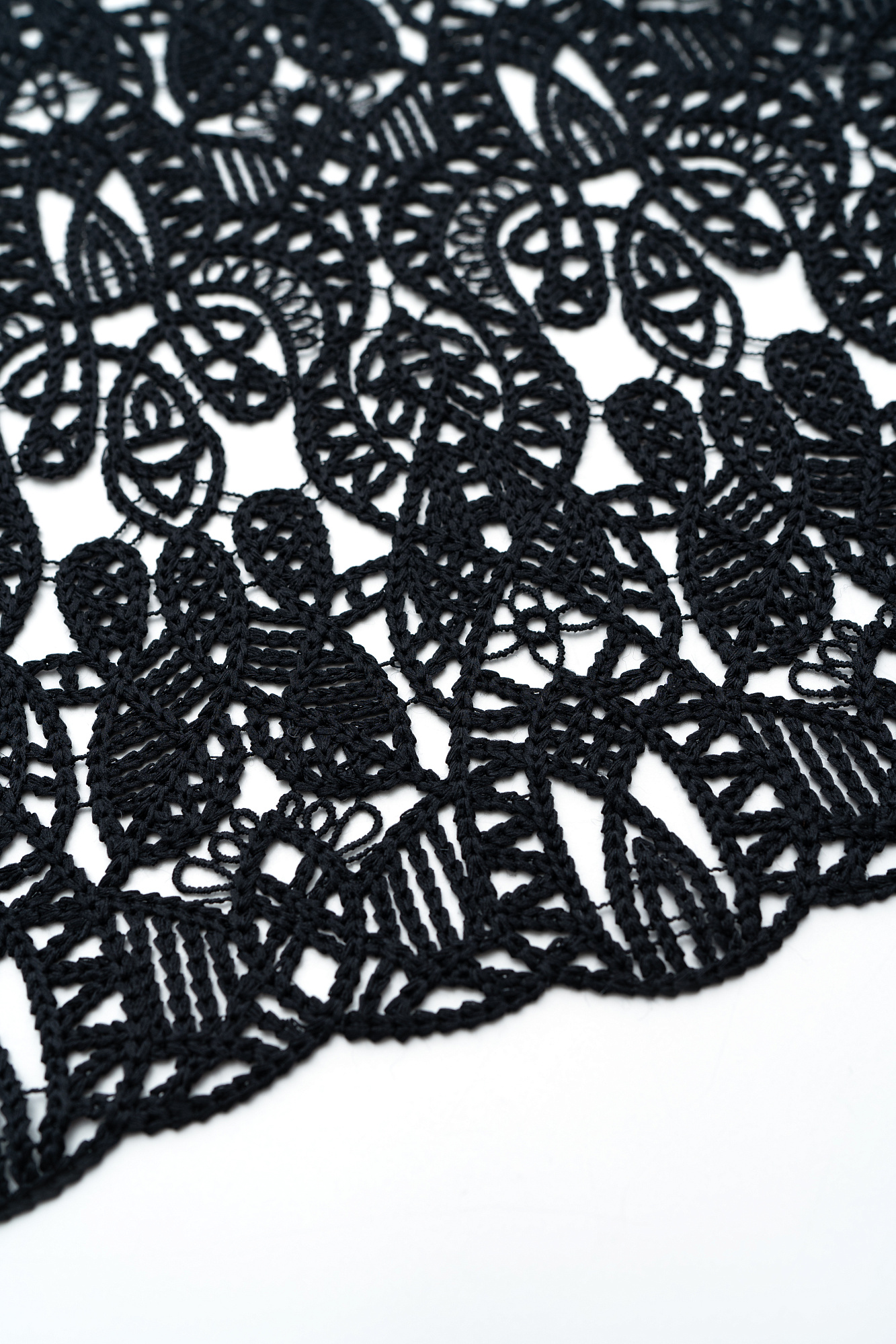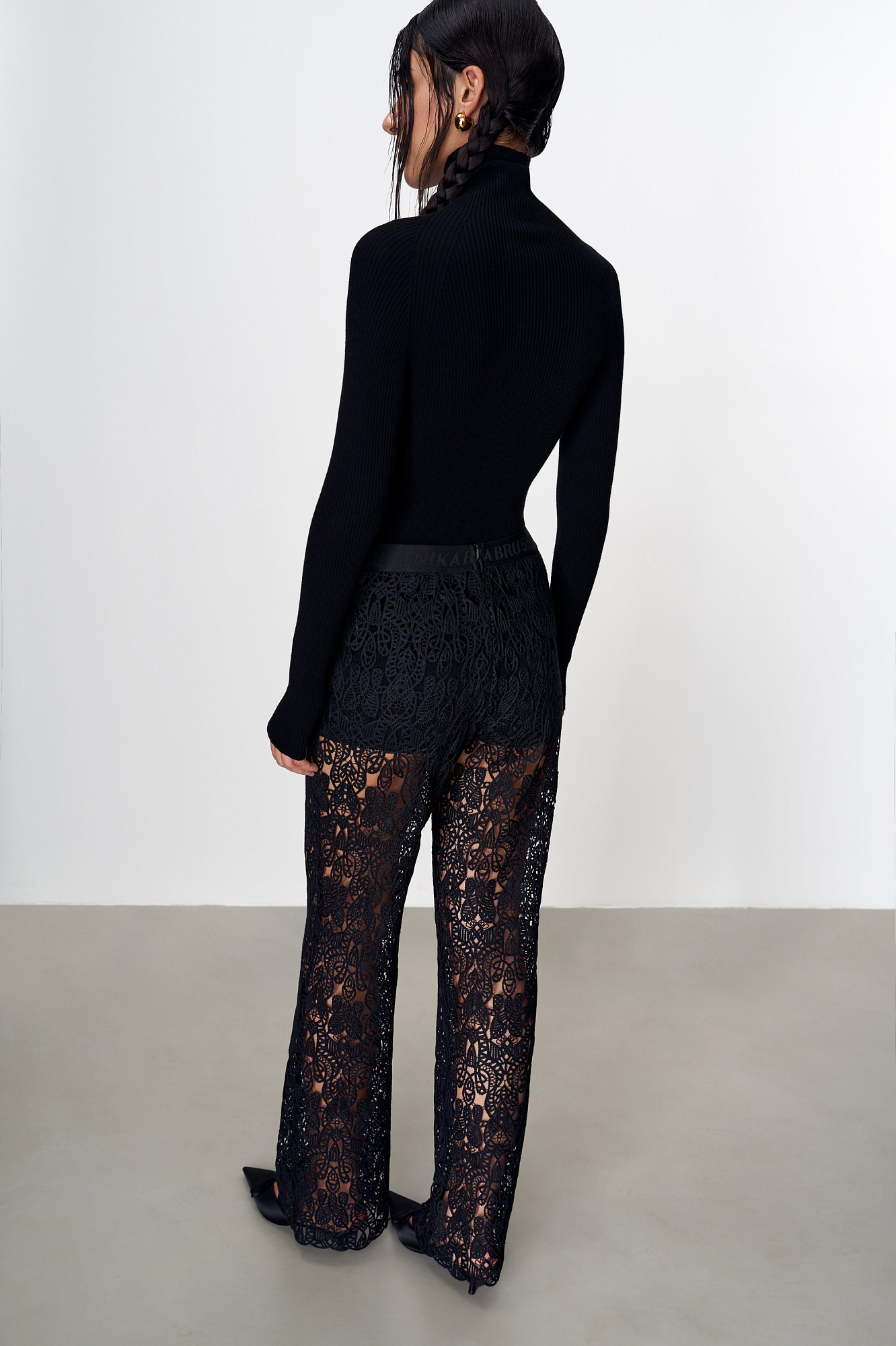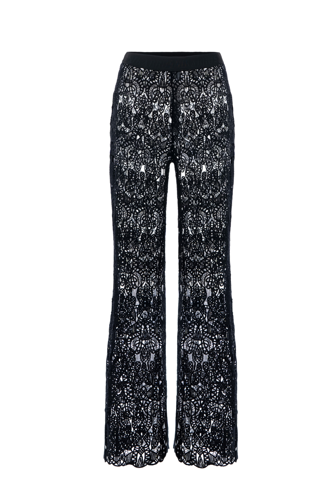 Полупрозрачные расклешенные брюки с эластичным поясом на резинке и молнией сзади. Выполнены из итальянского кружева. Образ можно дополнить кружевным укороченным топом с длинными рукавами.