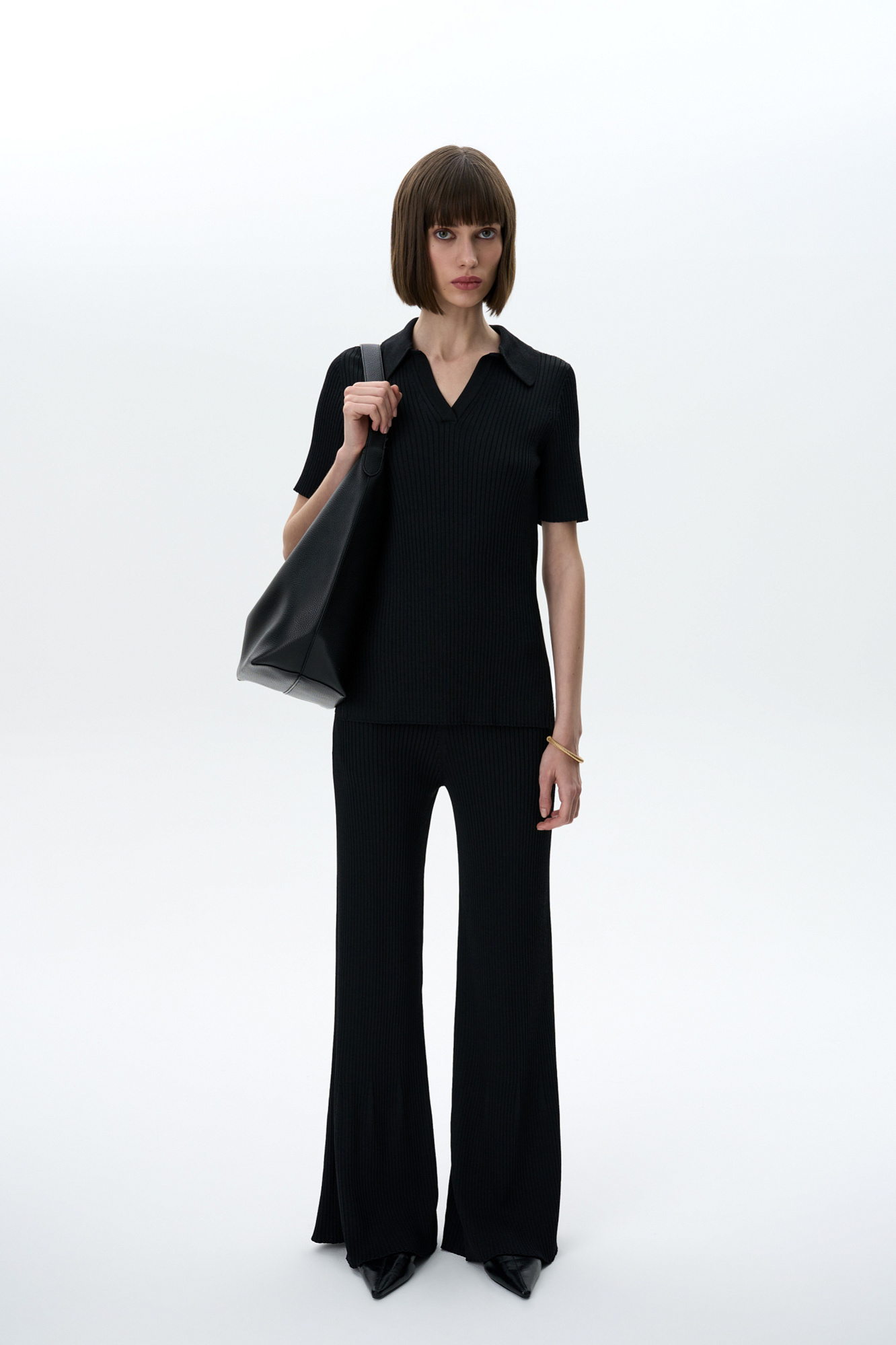 Трикотажные расклешенные брюки из вискозы. Модель приталенного силуэта с боковыми карманами и широким эластичным поясом. Дополнить образ можно футболкой-поло в таком же стиле.