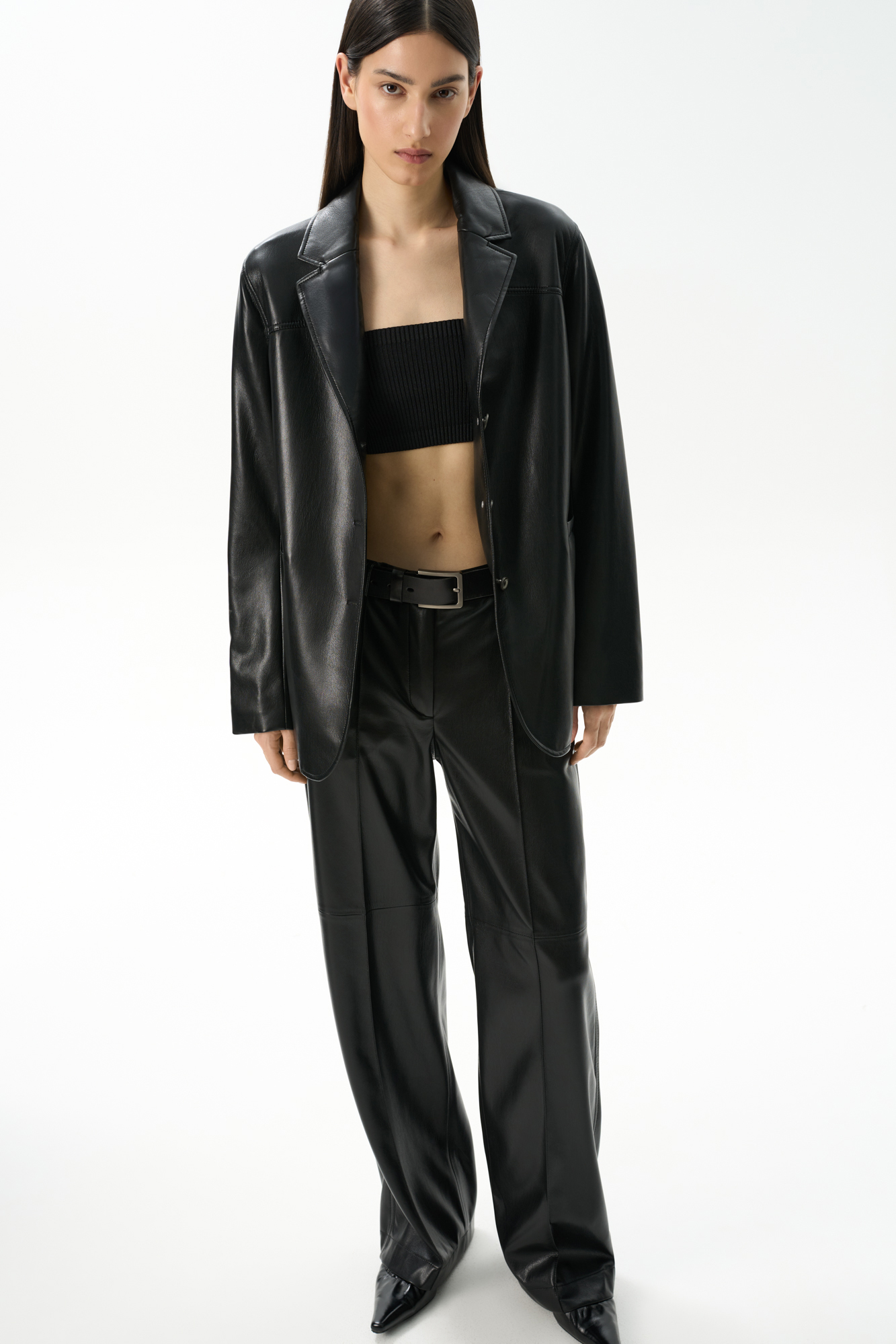 Классические брюки из экокожи. Модель прямого кроя со стрелками, карманами и патами на поясе для ремня. Застежка на крючок и молнию.