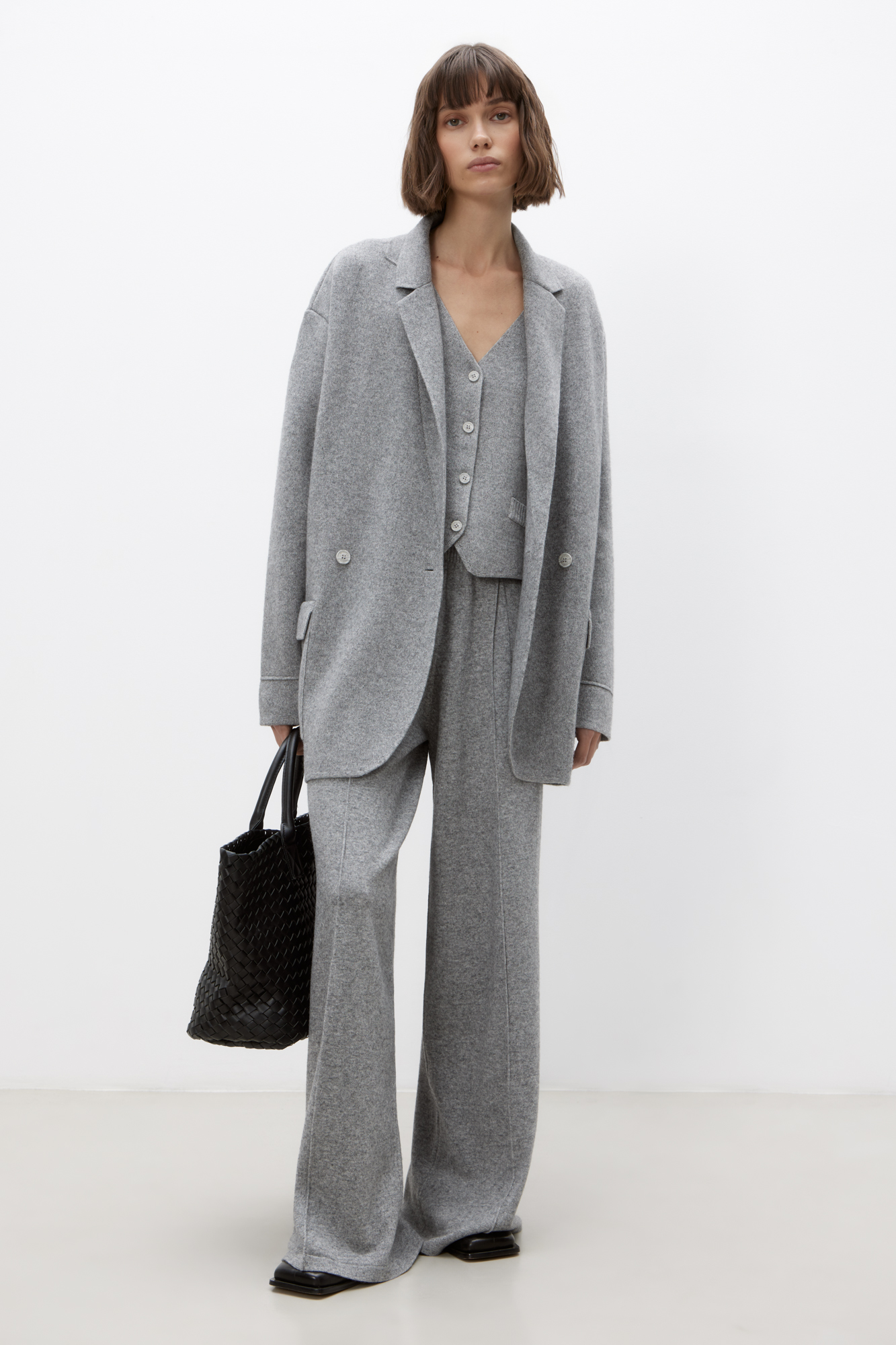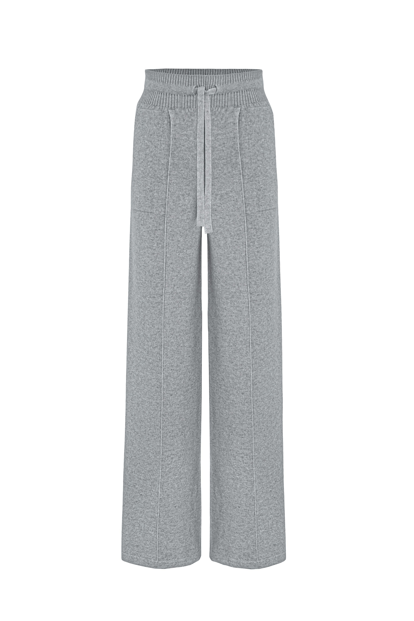 Трикотажные брюки из смесовой шерсти. Модель свободного силуэта со средней посадкой, боковыми карманами и стрелками. Эластичный пояс на кулиске в рубчик.