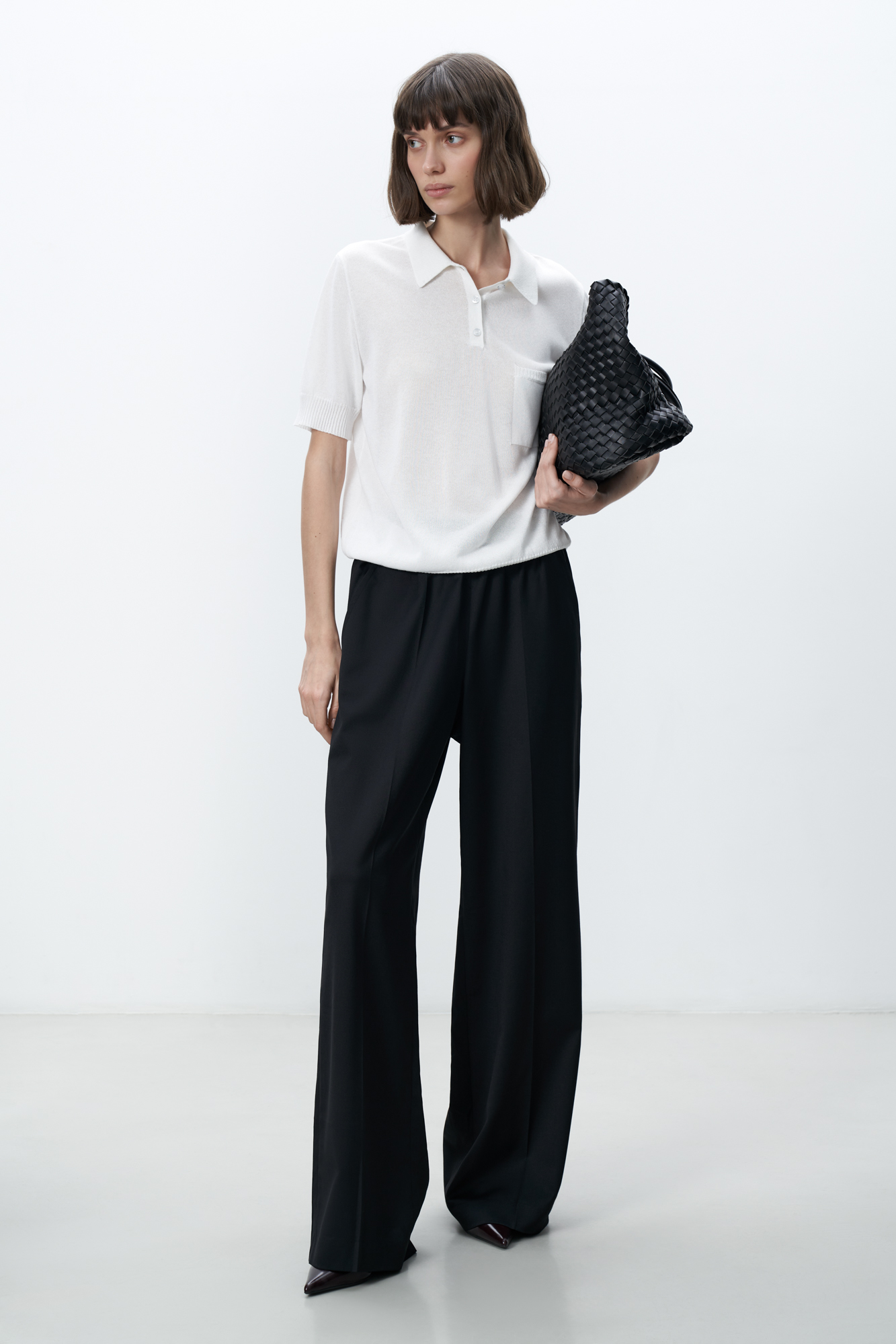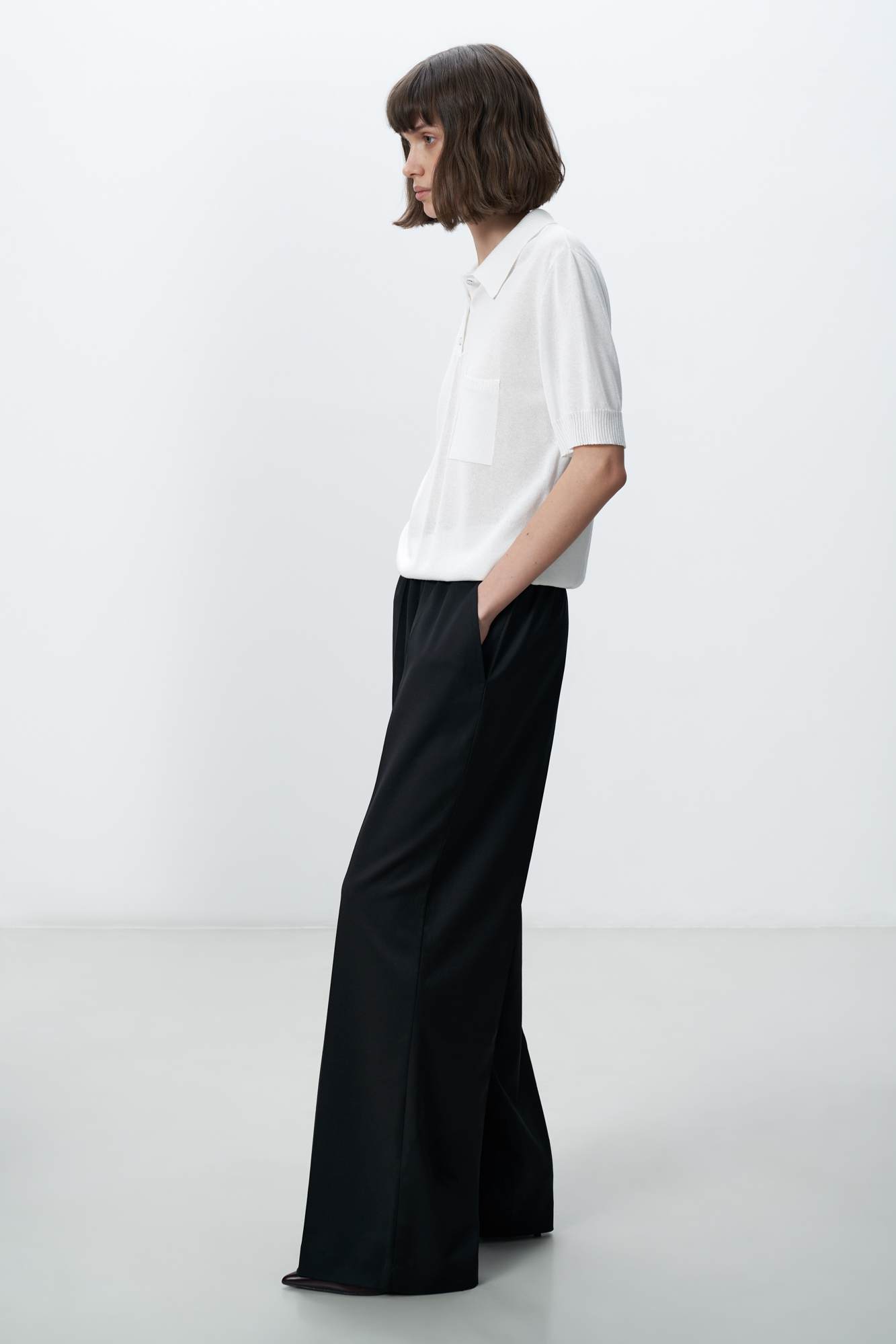 Широкие брюки свободного кроя из смесовой шерсти со стрелками. Передние боковые карманы и эластичный пояс на резинке.