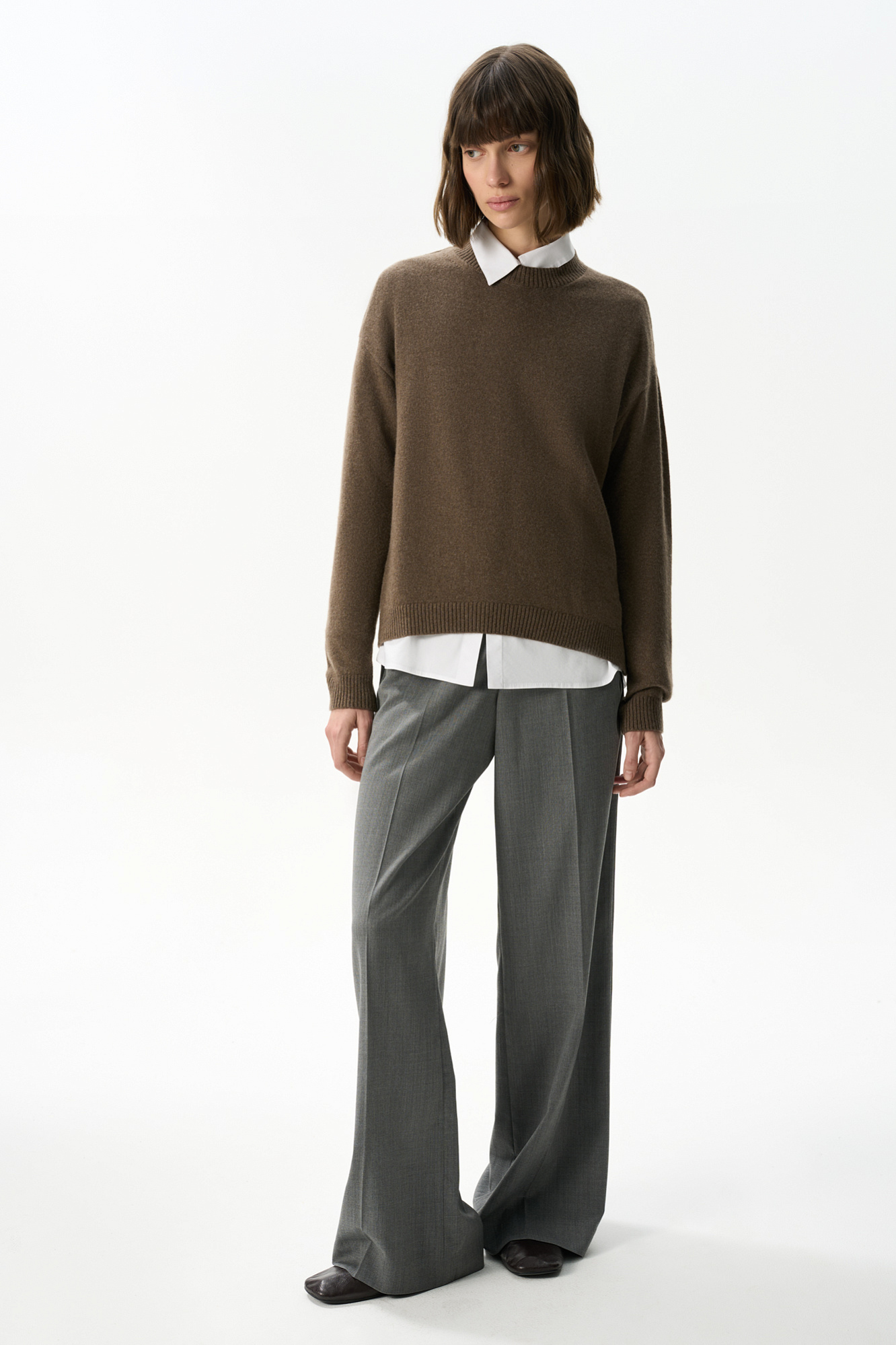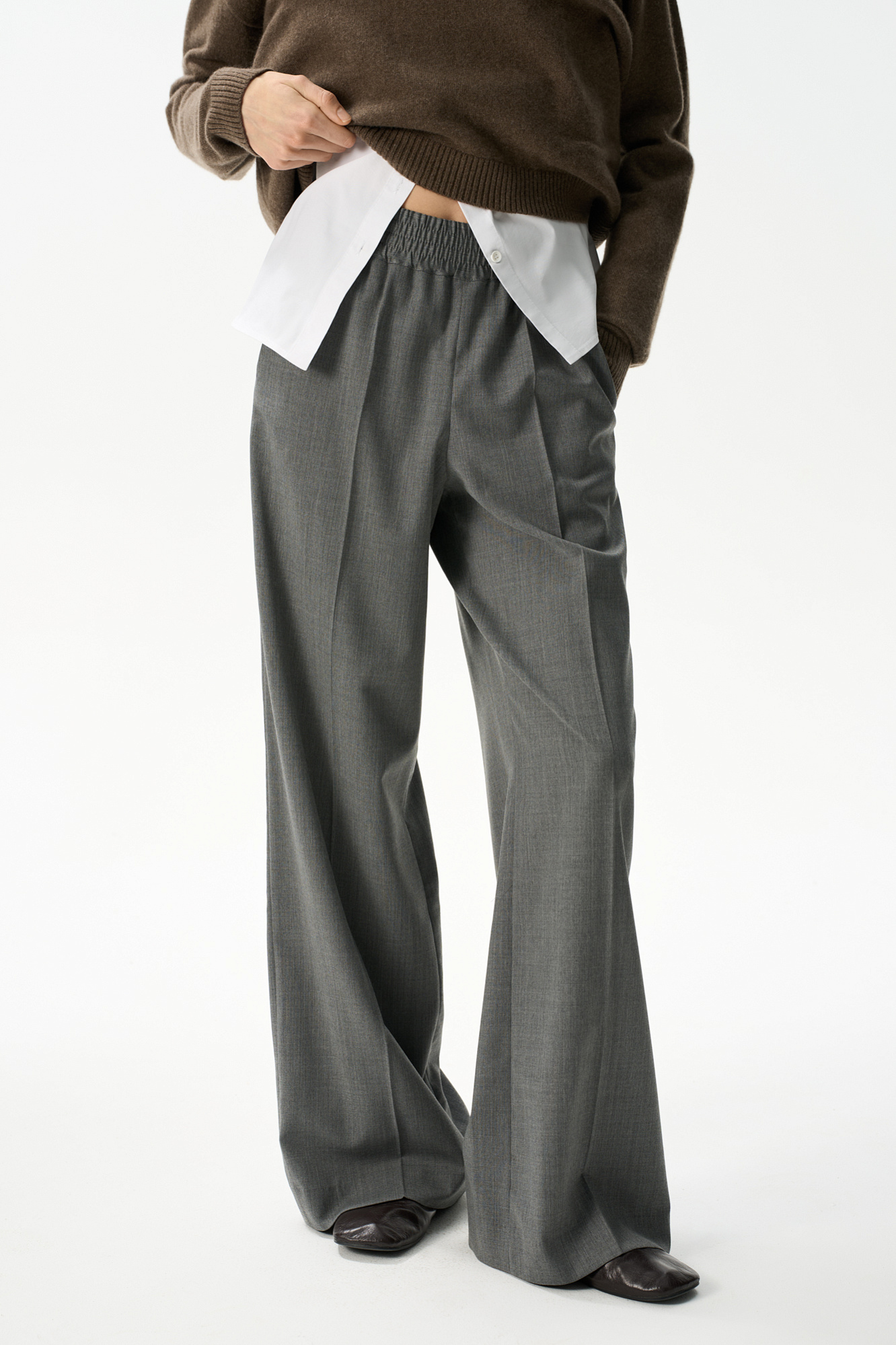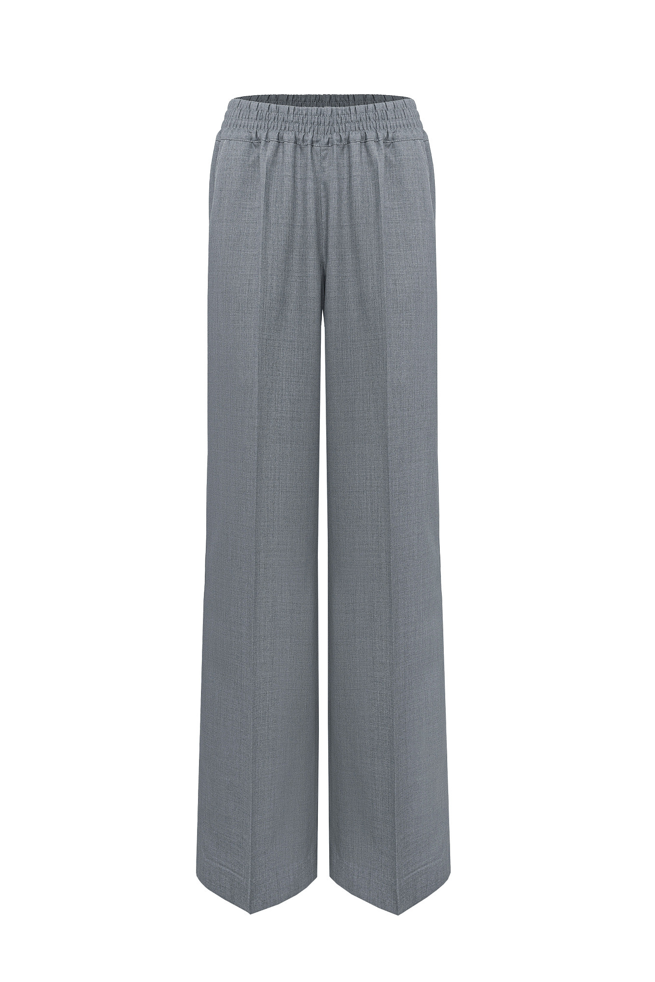 Широкие брюки свободного кроя из смесовой шерсти со стрелками. Передние боковые карманы и эластичный пояс на резинке.