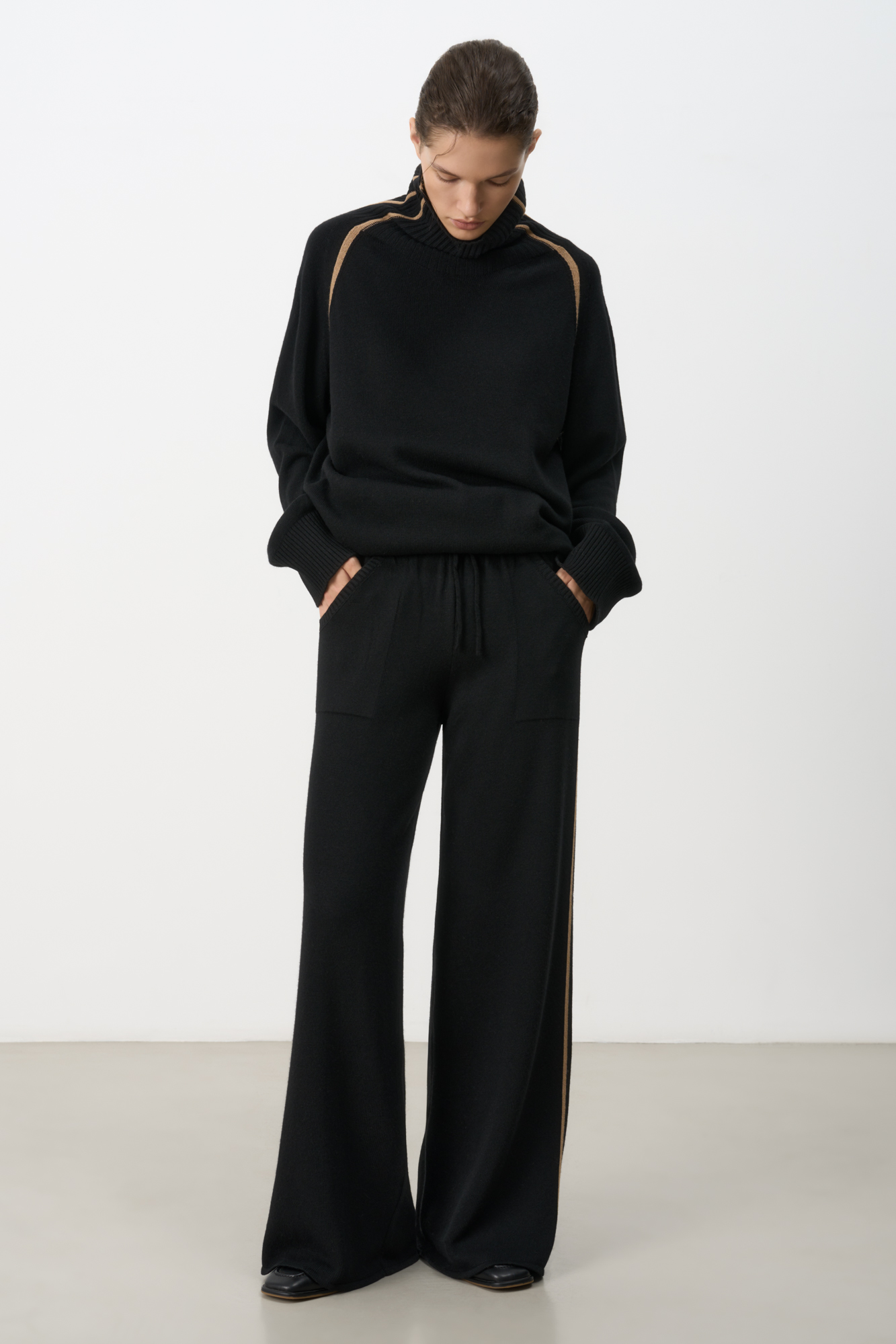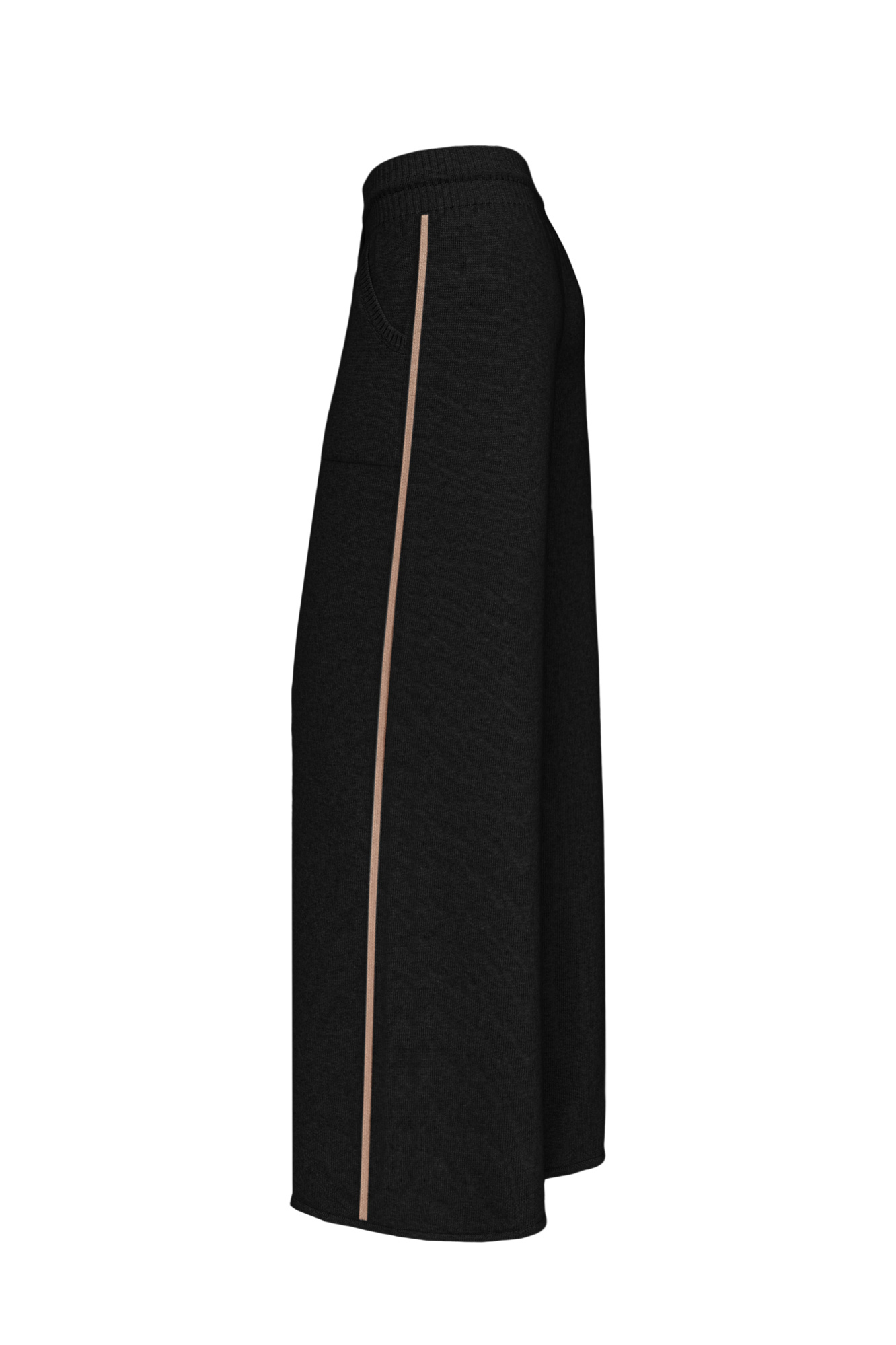 Трикотажные брюки из кашемира и шерсти. Модель свободного силуэта со средней посадкой, боковыми вывязанными карманами и эластичным поясом на кулиске. Изделие декорировано лампасами контрастного цвета.