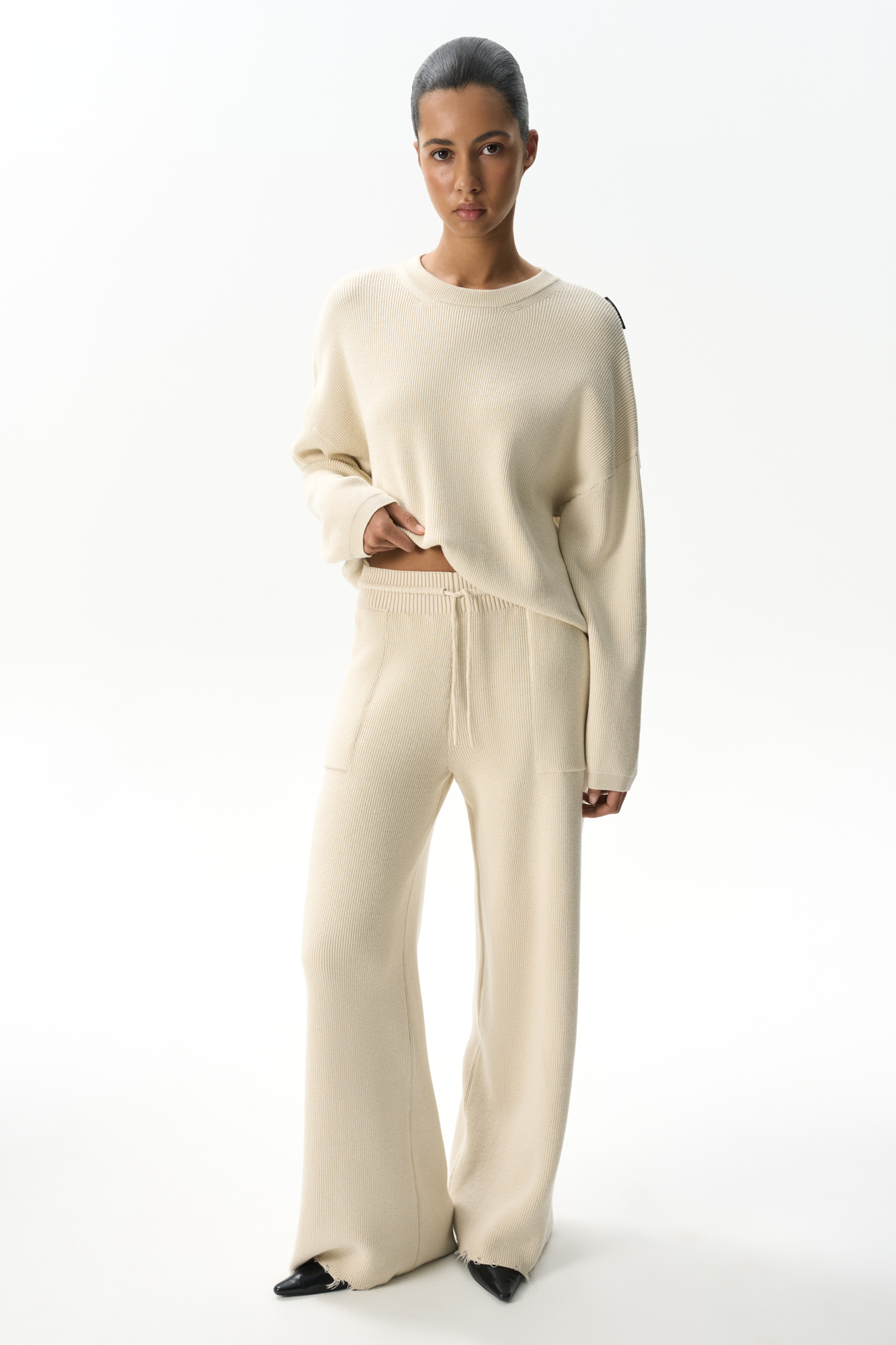 Свободные брюки с необработанным низом. Модель прямого силуэта с накладными карманами и эластичным поясом в рубчик на кулиске.