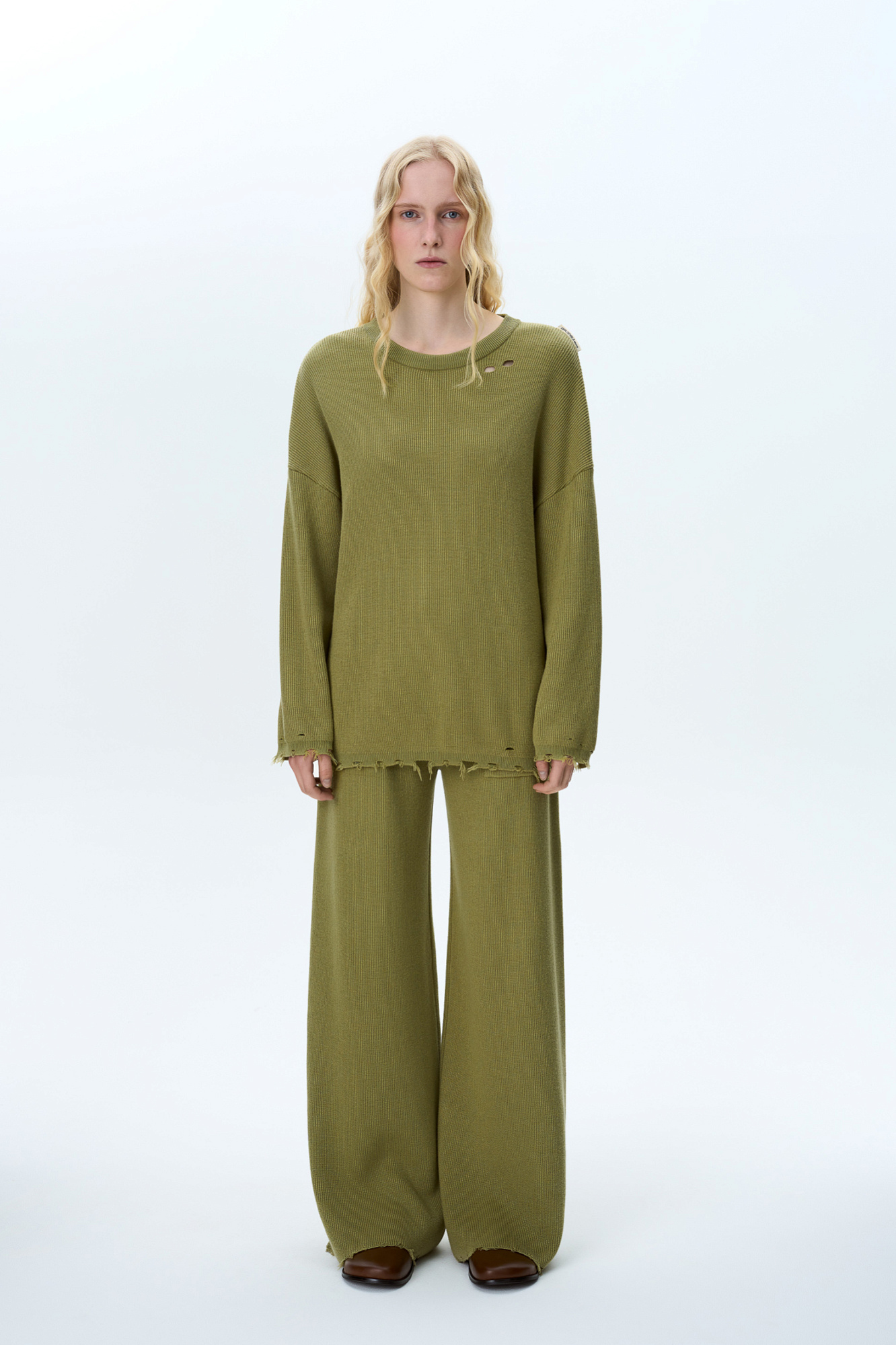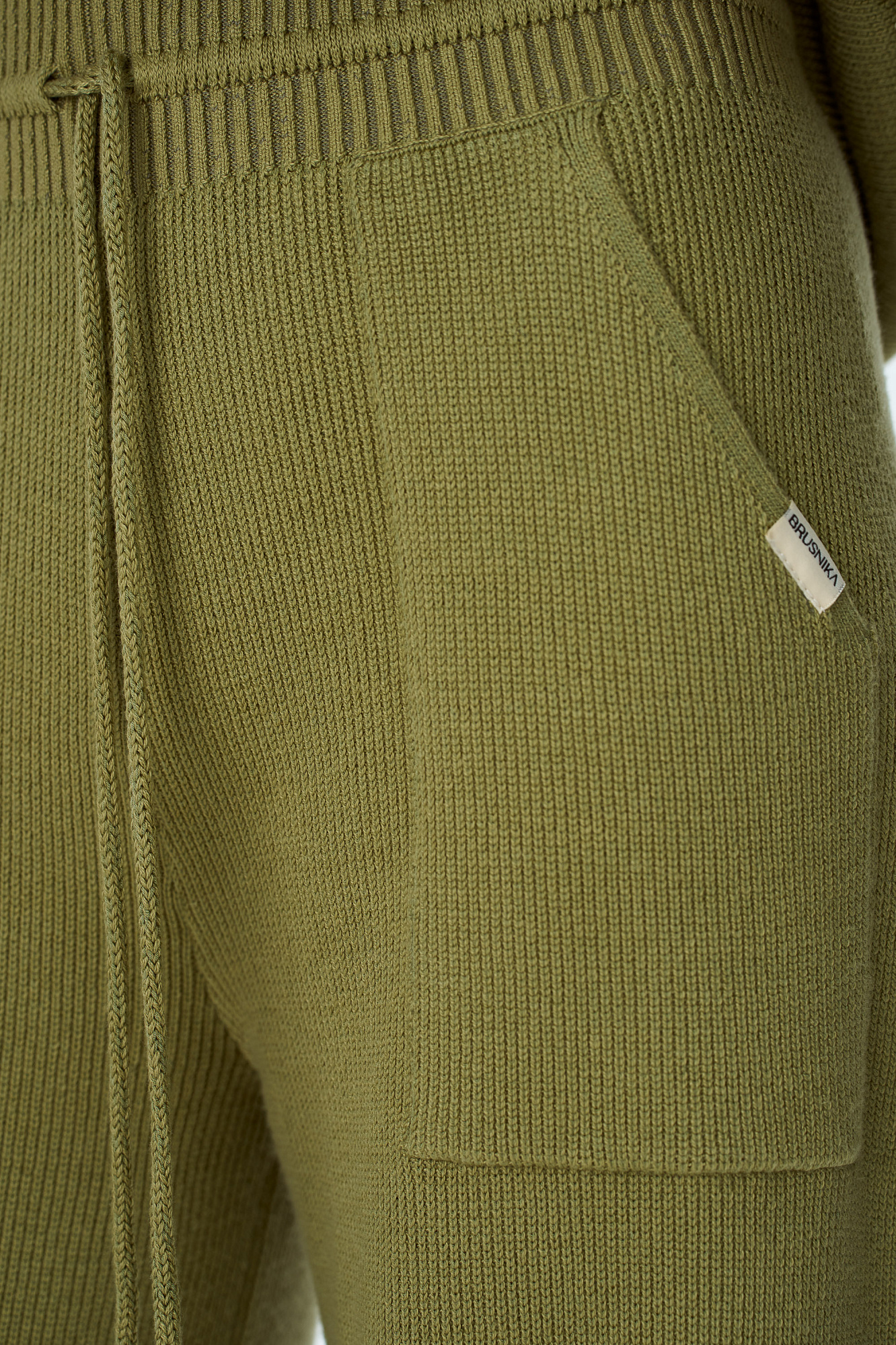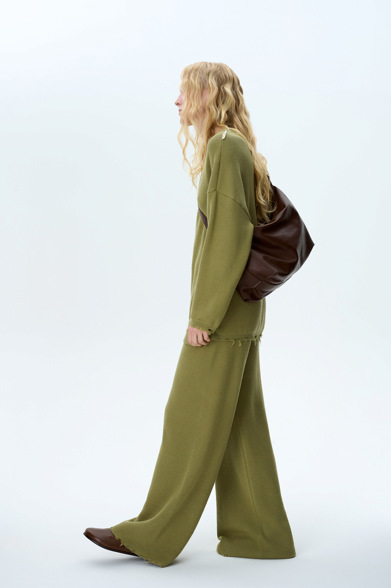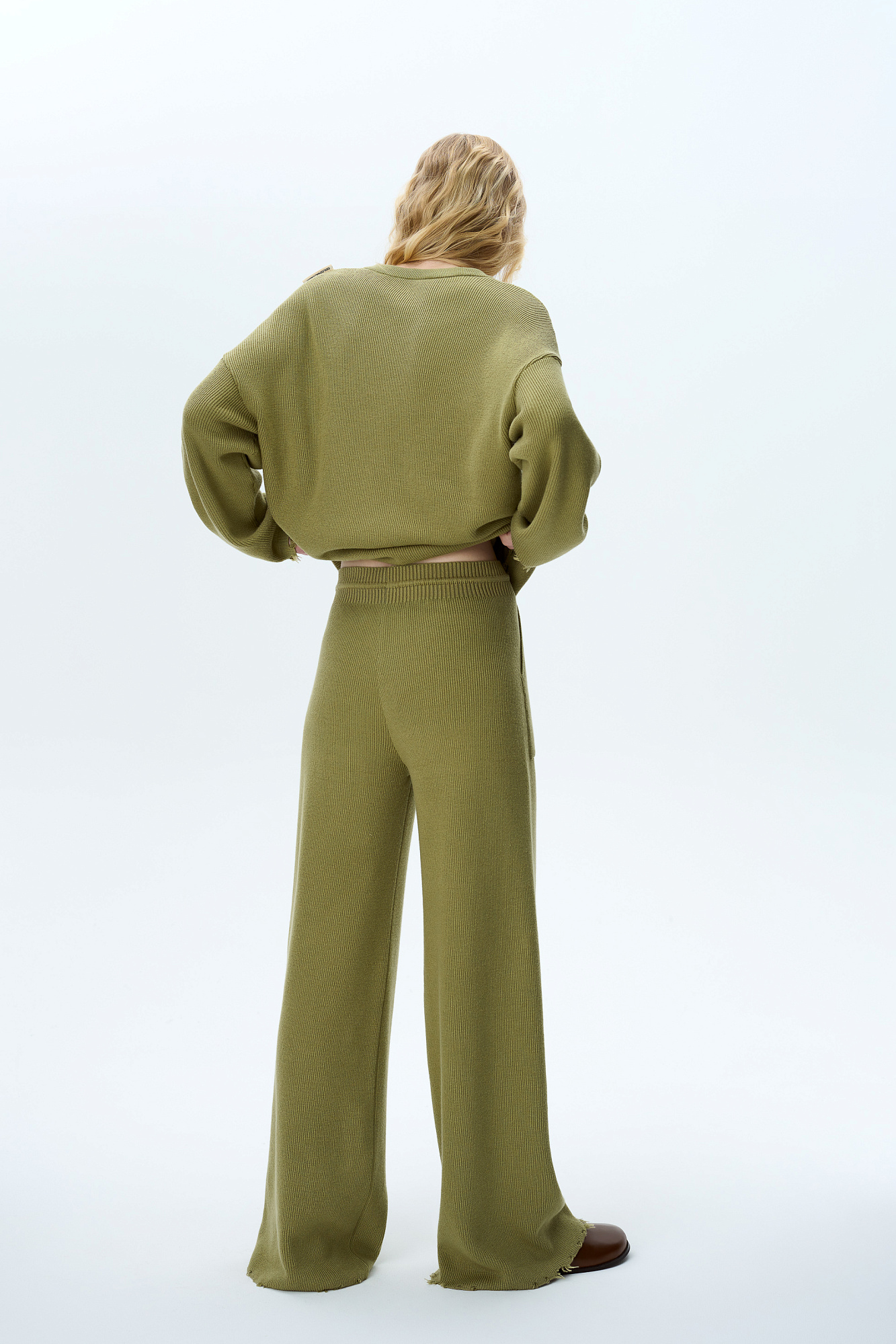 Свободные брюки с необработанным низом. Модель прямого силуэта с накладными карманами и эластичным поясом в рубчик на кулиске.