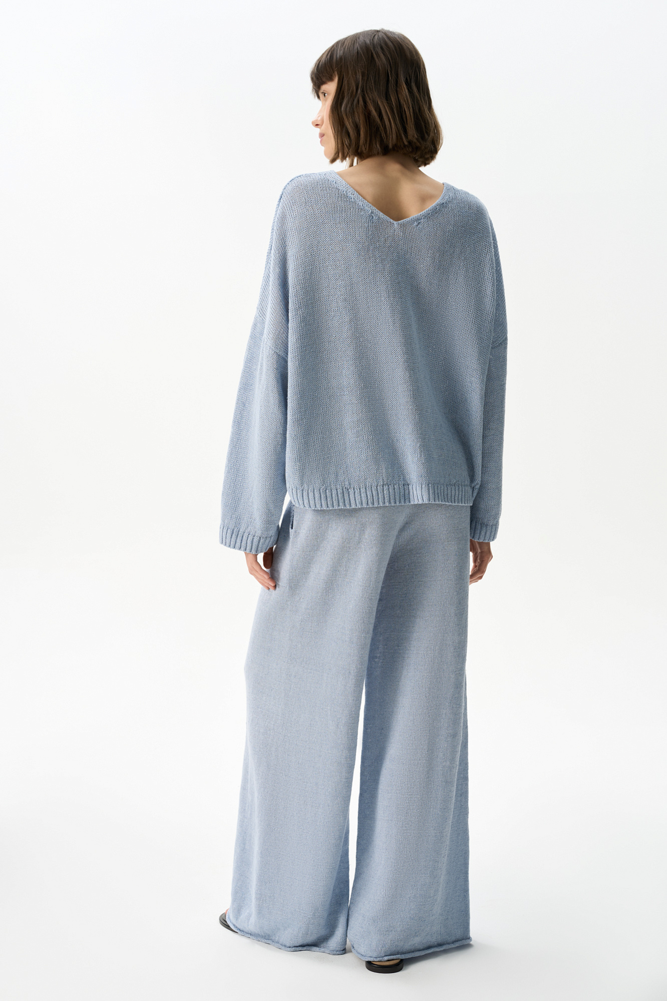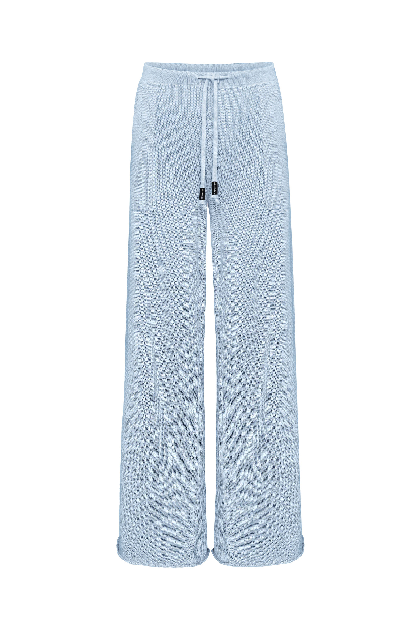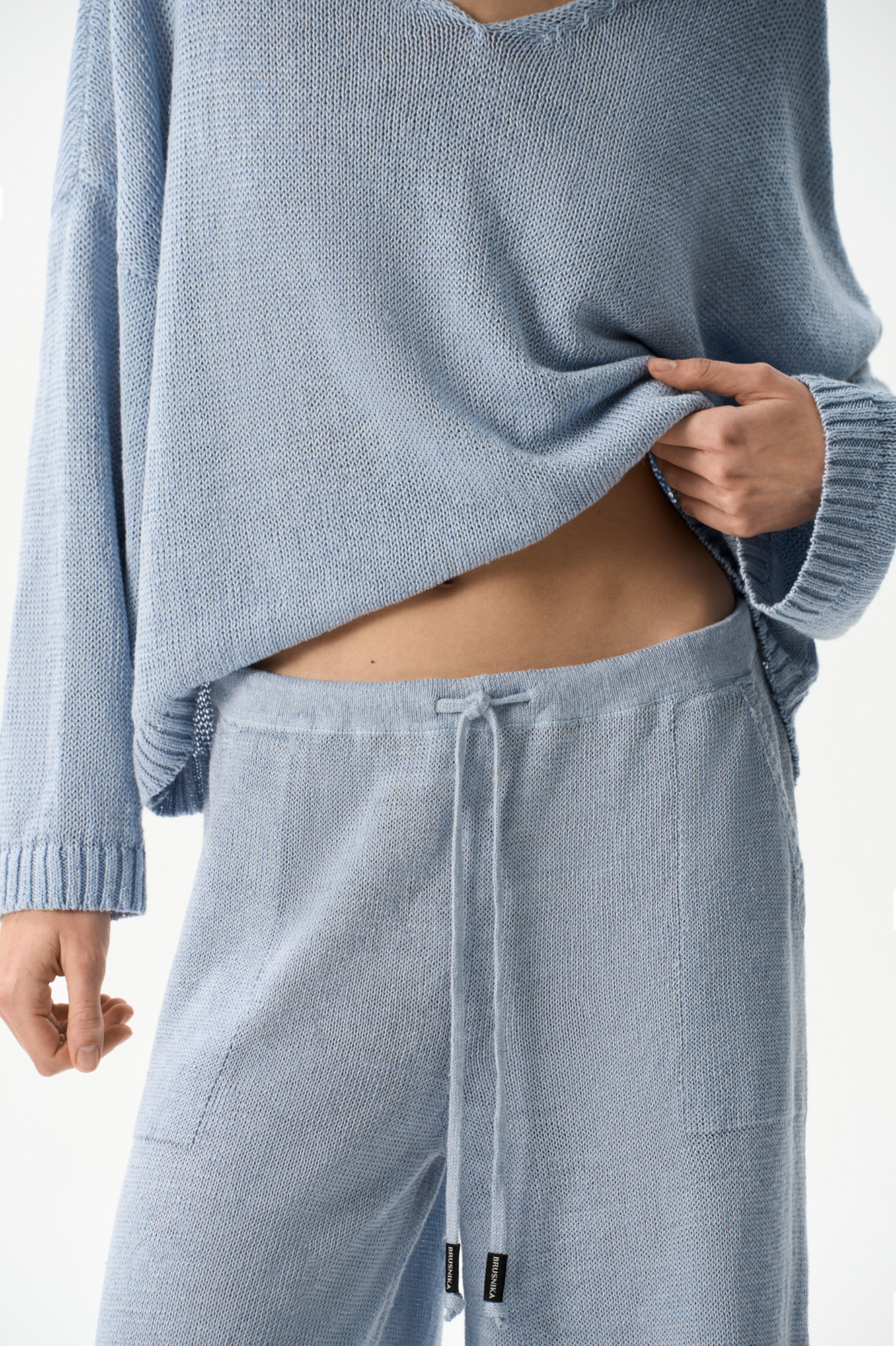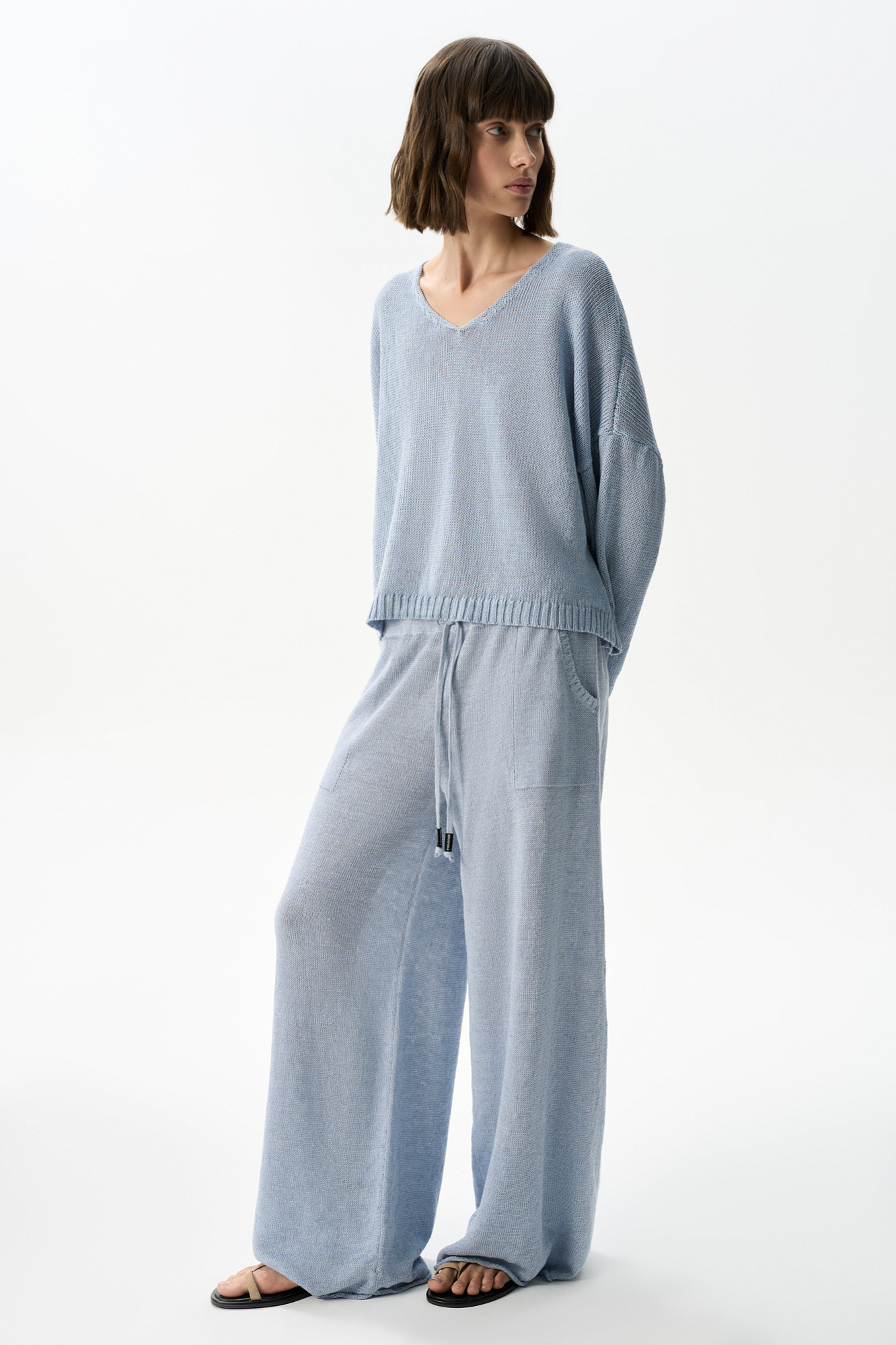 Широкие трикотажные брюки из 100% льна. Модель прямого силуэта, на кулиске и двумя карманами.