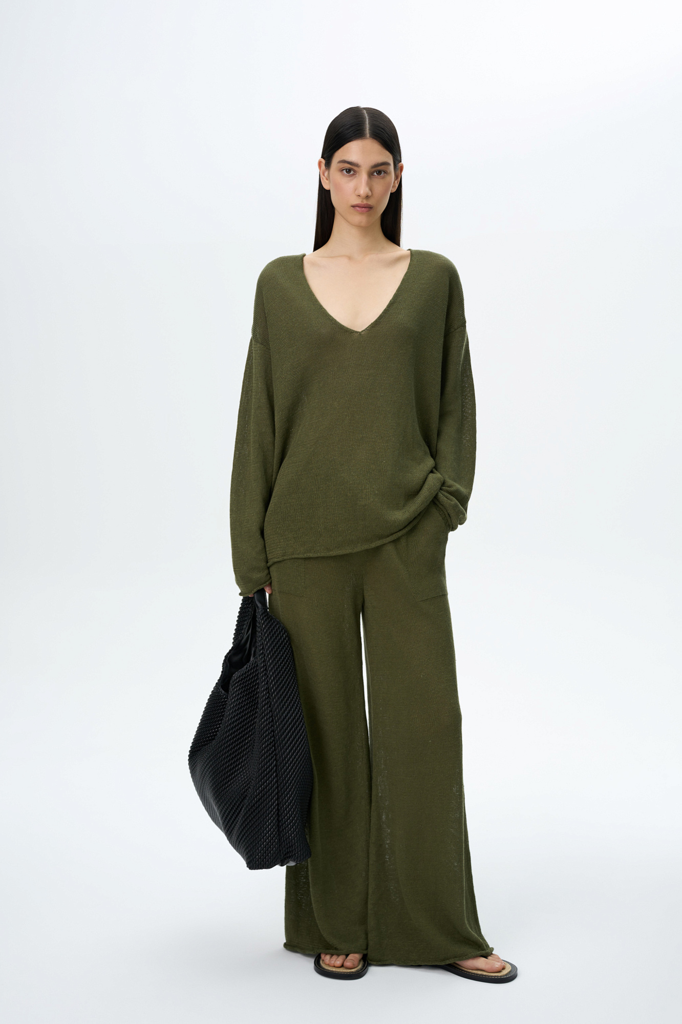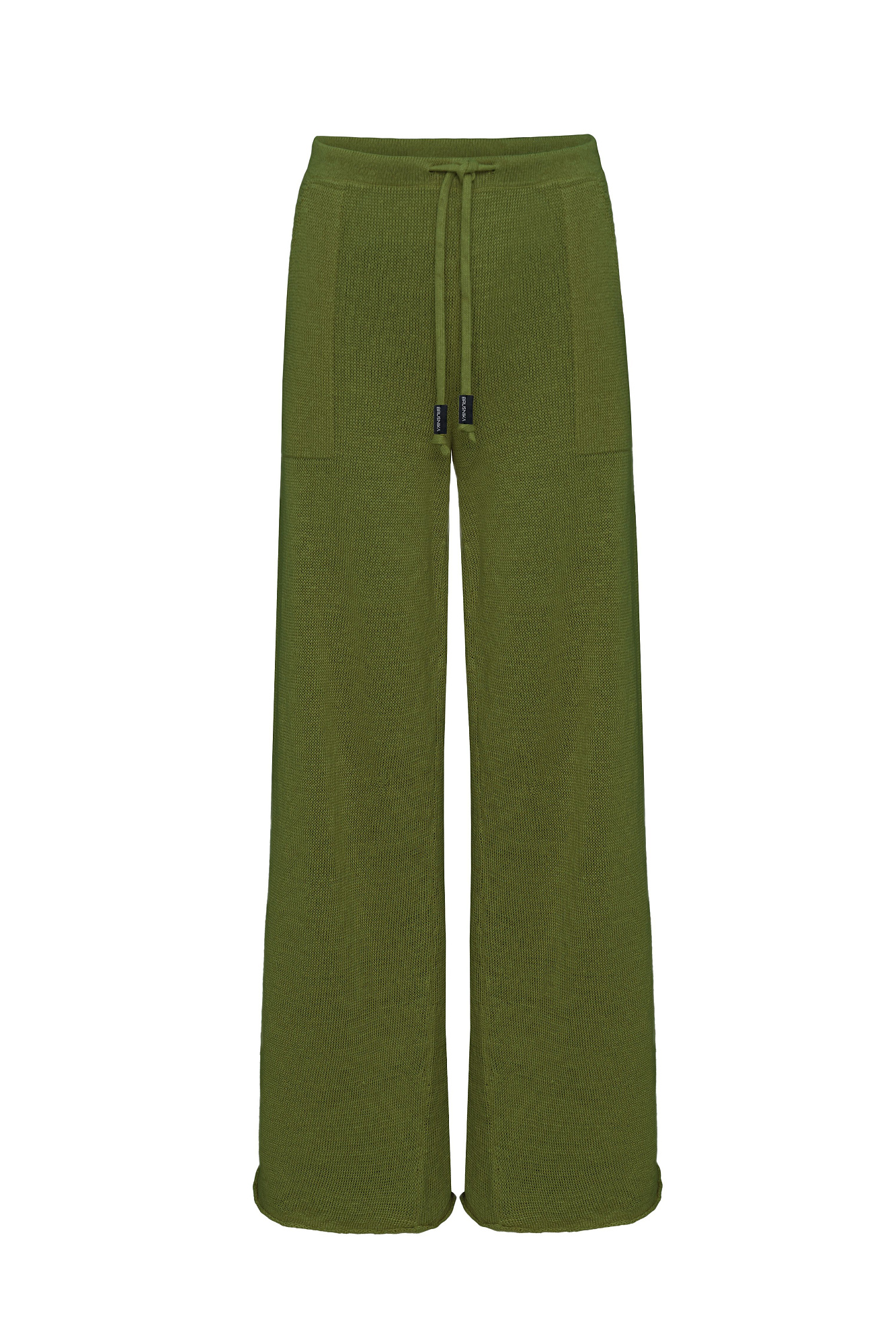 Широкие трикотажные брюки из 100% льна. Модель прямого силуэта, на кулиске и двумя карманами.