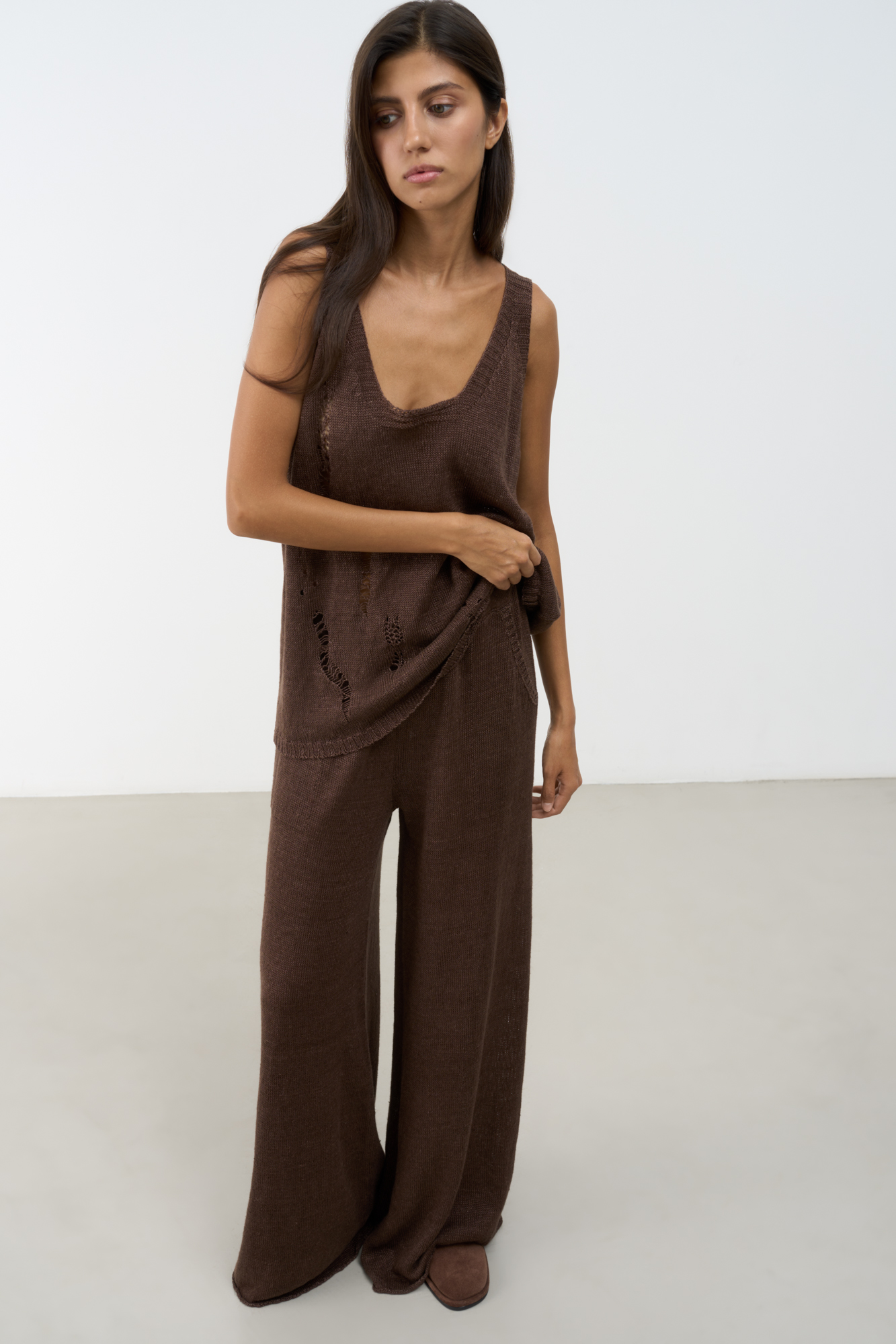 Широкие трикотажные брюки из 100% льна. Модель прямого силуэта, на кулиске и двумя карманами.