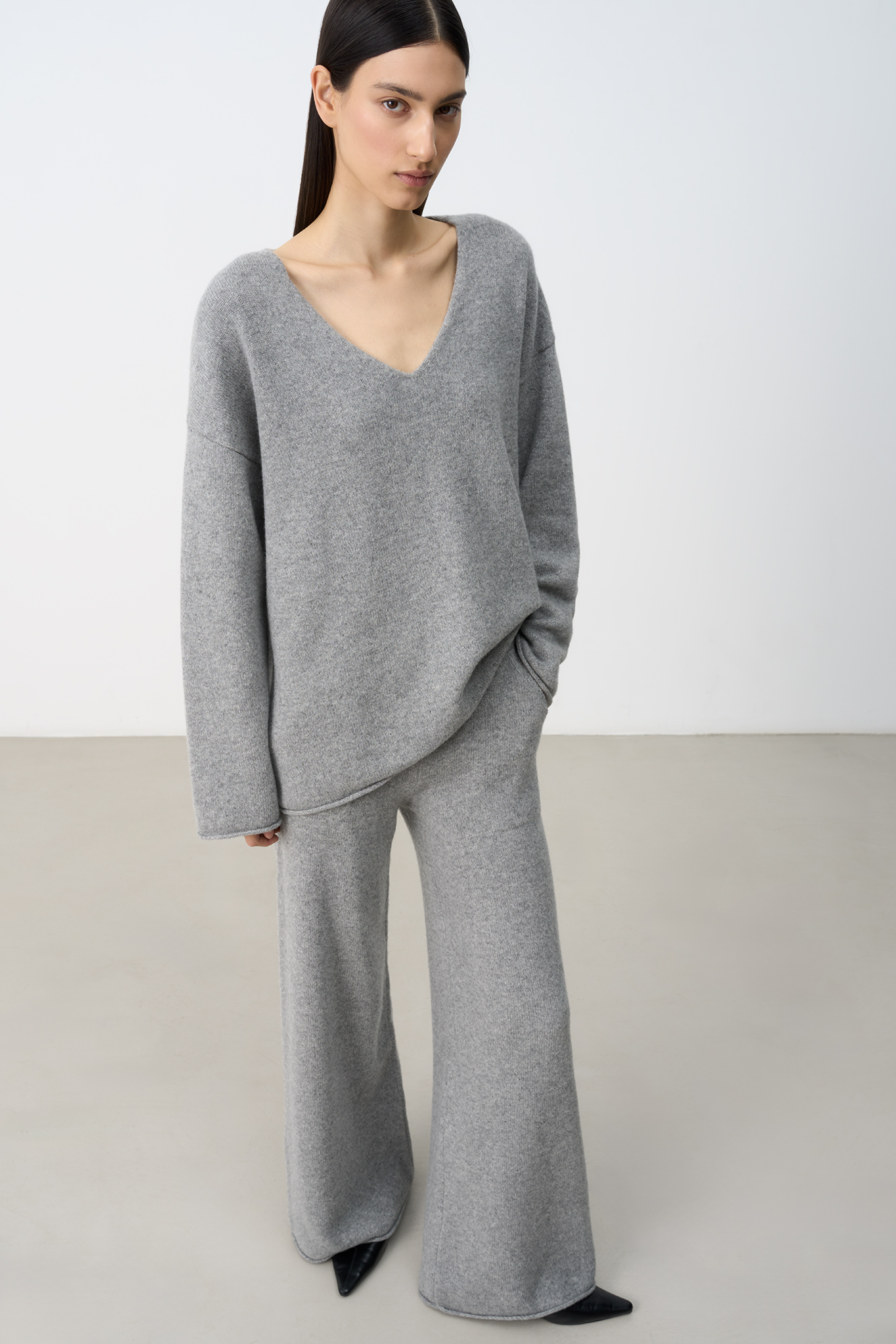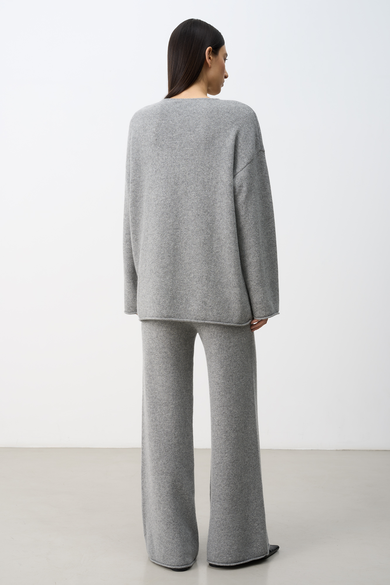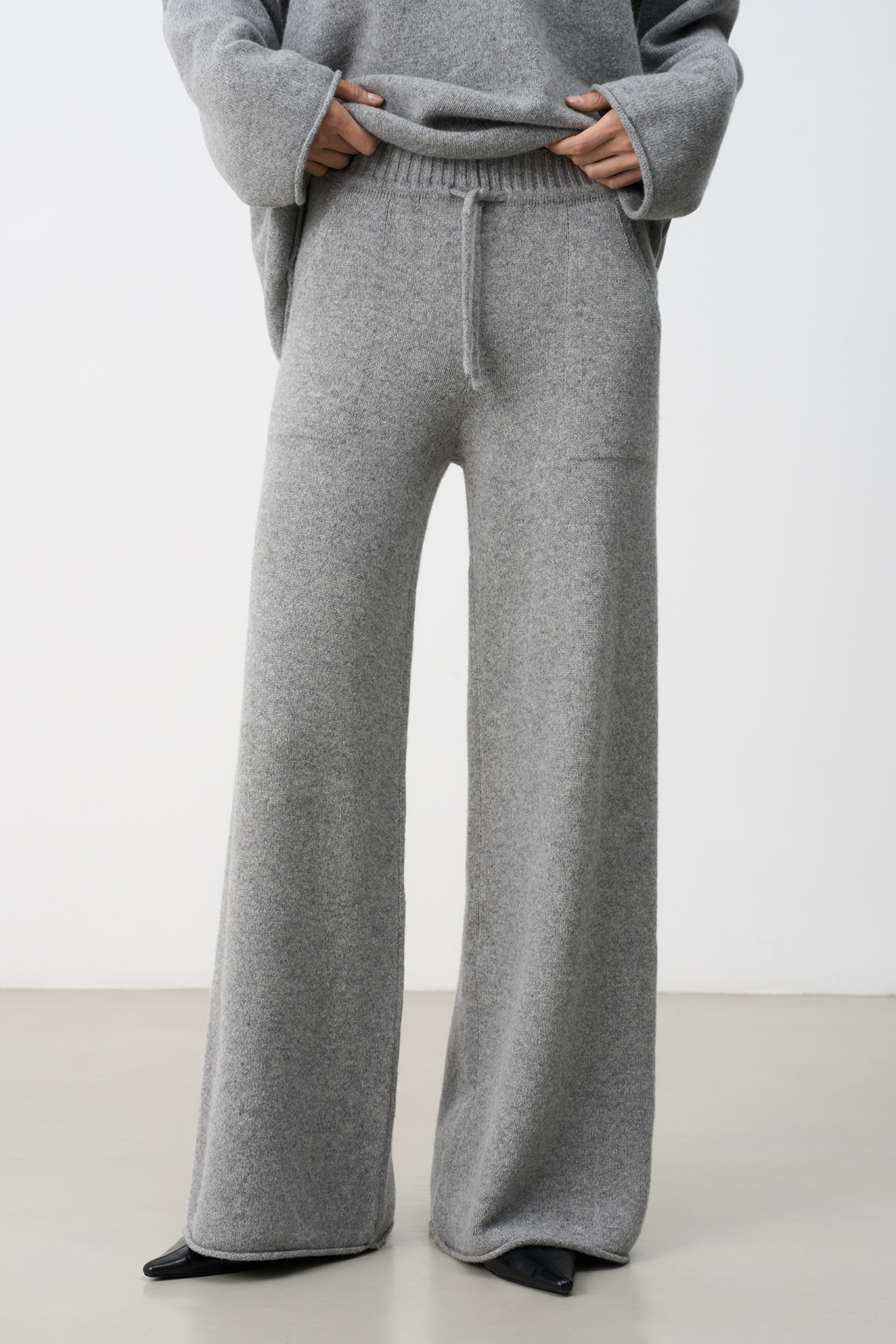 Трикотажные брюки из 100% кашемира. Модель прямого силуэта с боковыми карманами и эластичным поясом в рубчик на кулиске. Дополнить образ можно джемпером в таком же стиле.