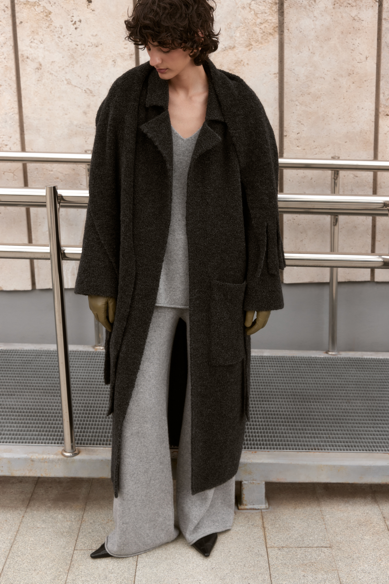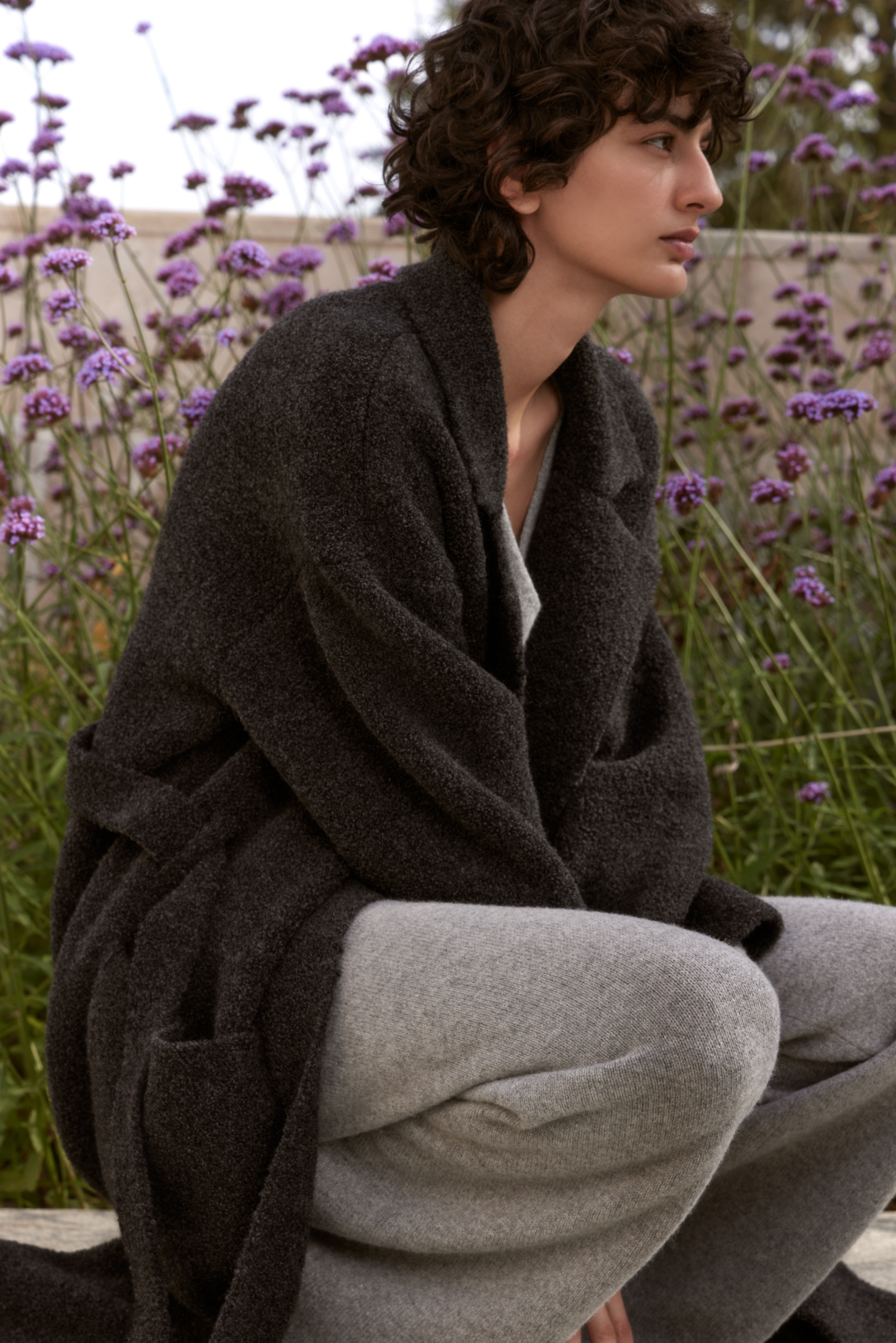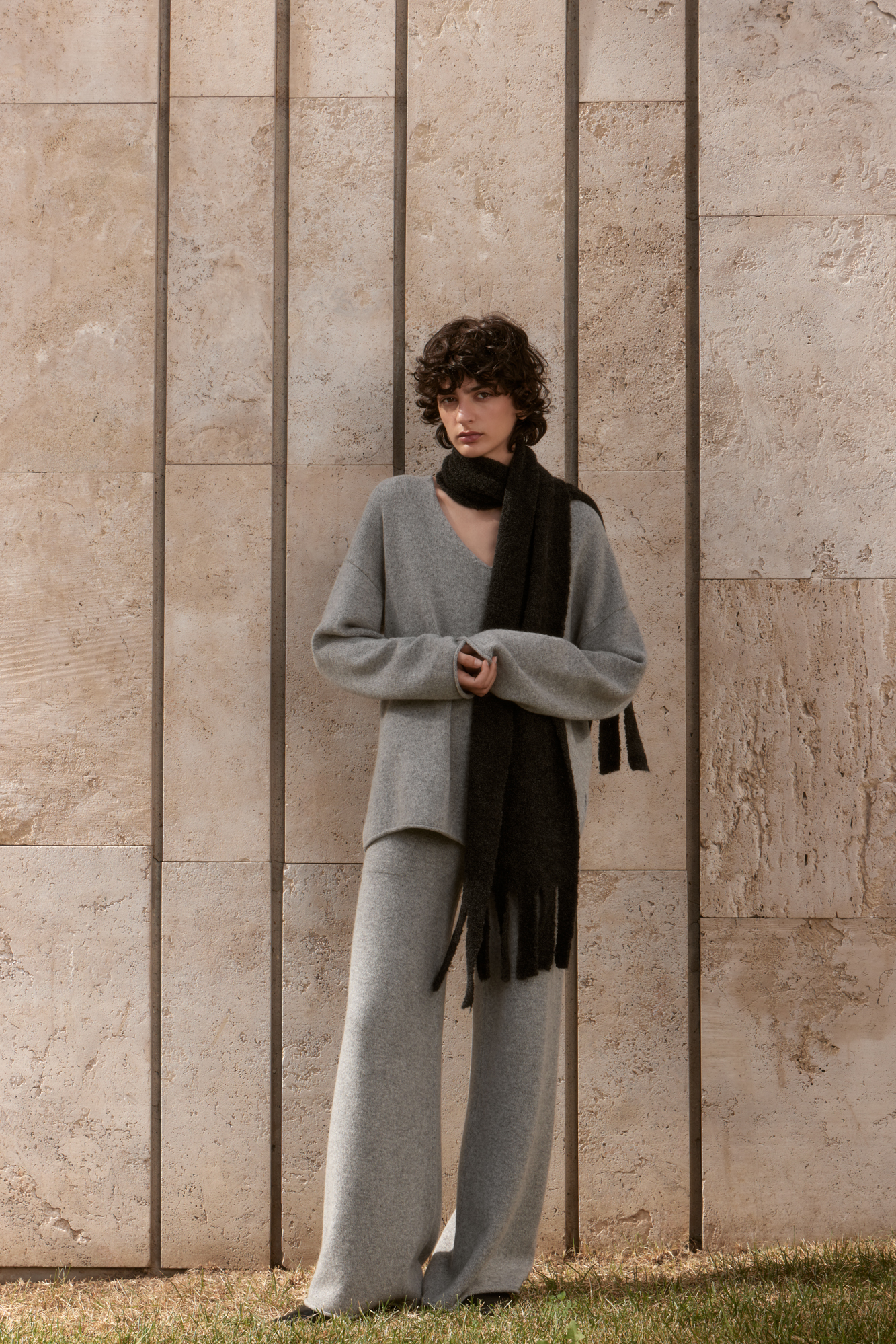 Трикотажные брюки из 100% кашемира. Модель прямого силуэта с боковыми карманами и эластичным поясом в рубчик на кулиске. Дополнить образ можно джемпером в таком же стиле.