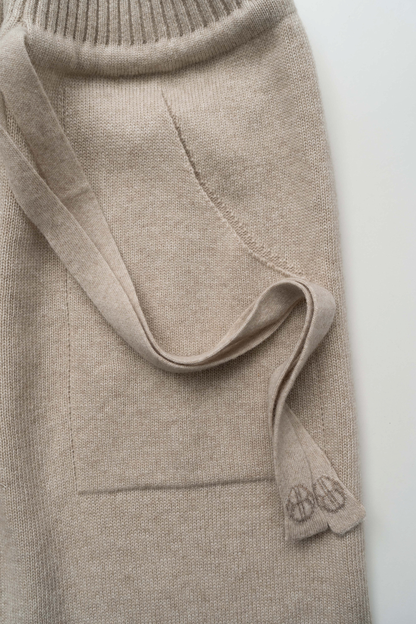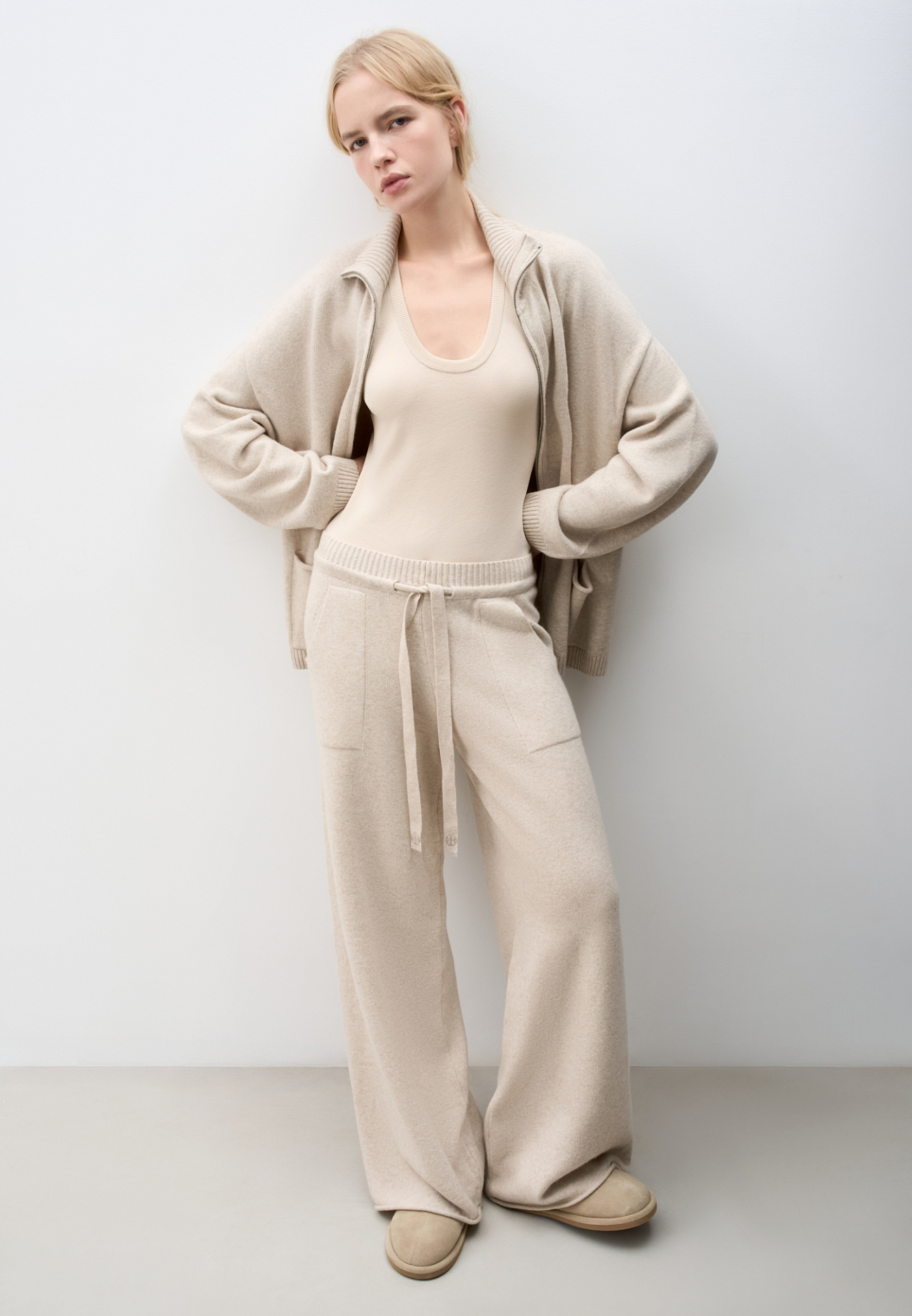 Трикотажные брюки из кашемира и шерсти. Модель прямого силуэта с накладными карманами и эластичным поясом в рубчик на кулиске. Дополнить образ можно бомбером.