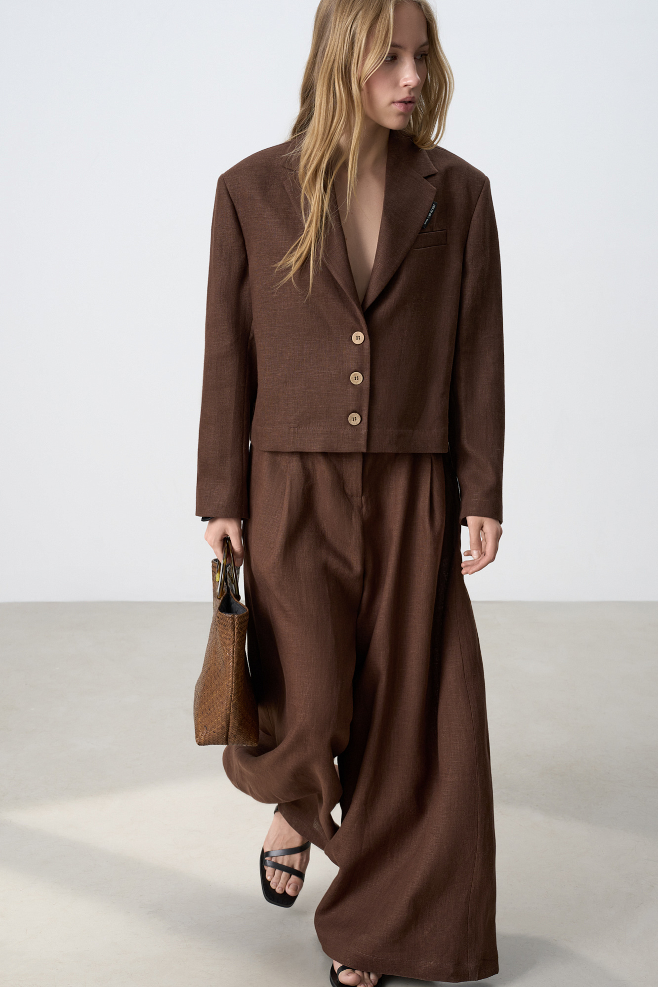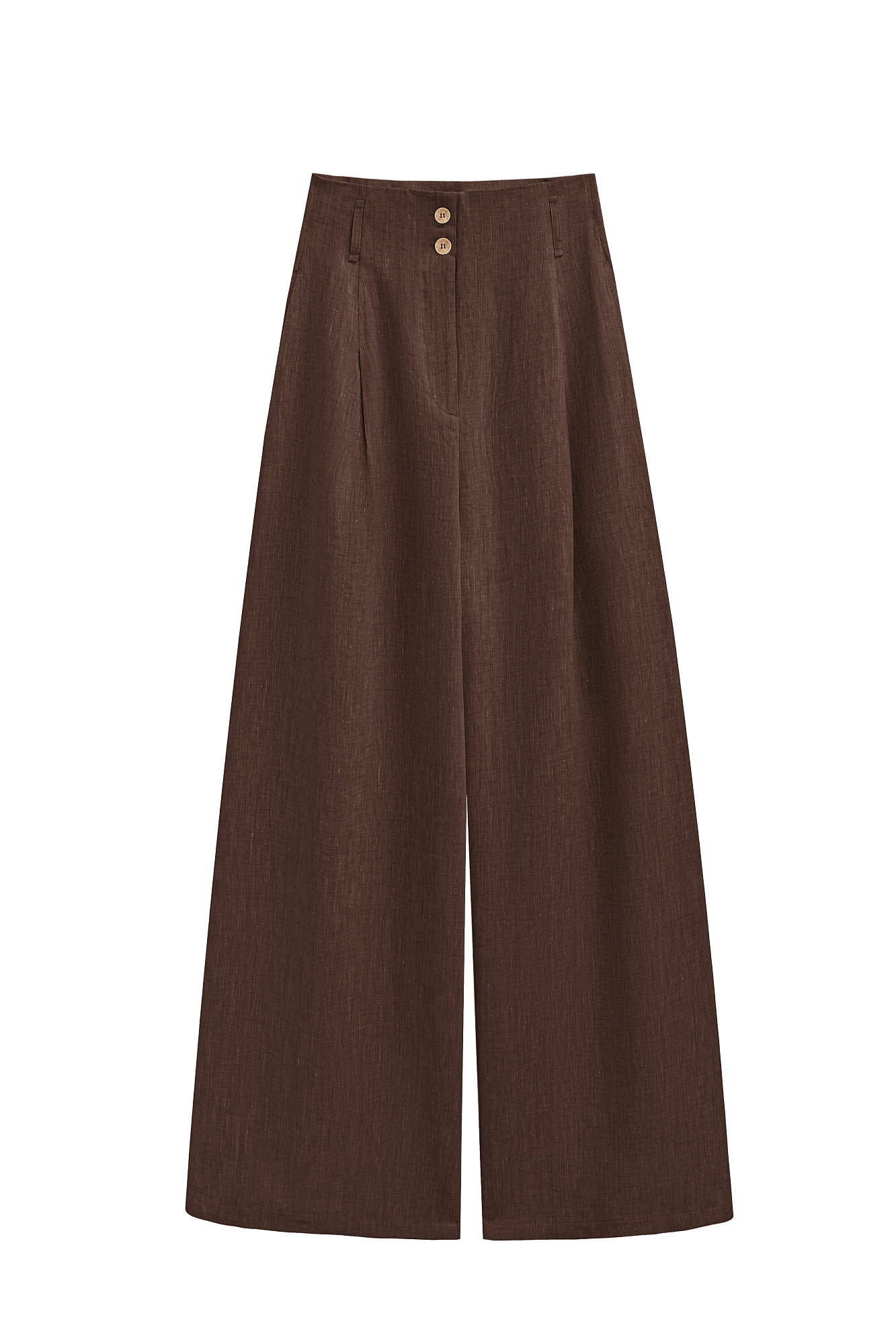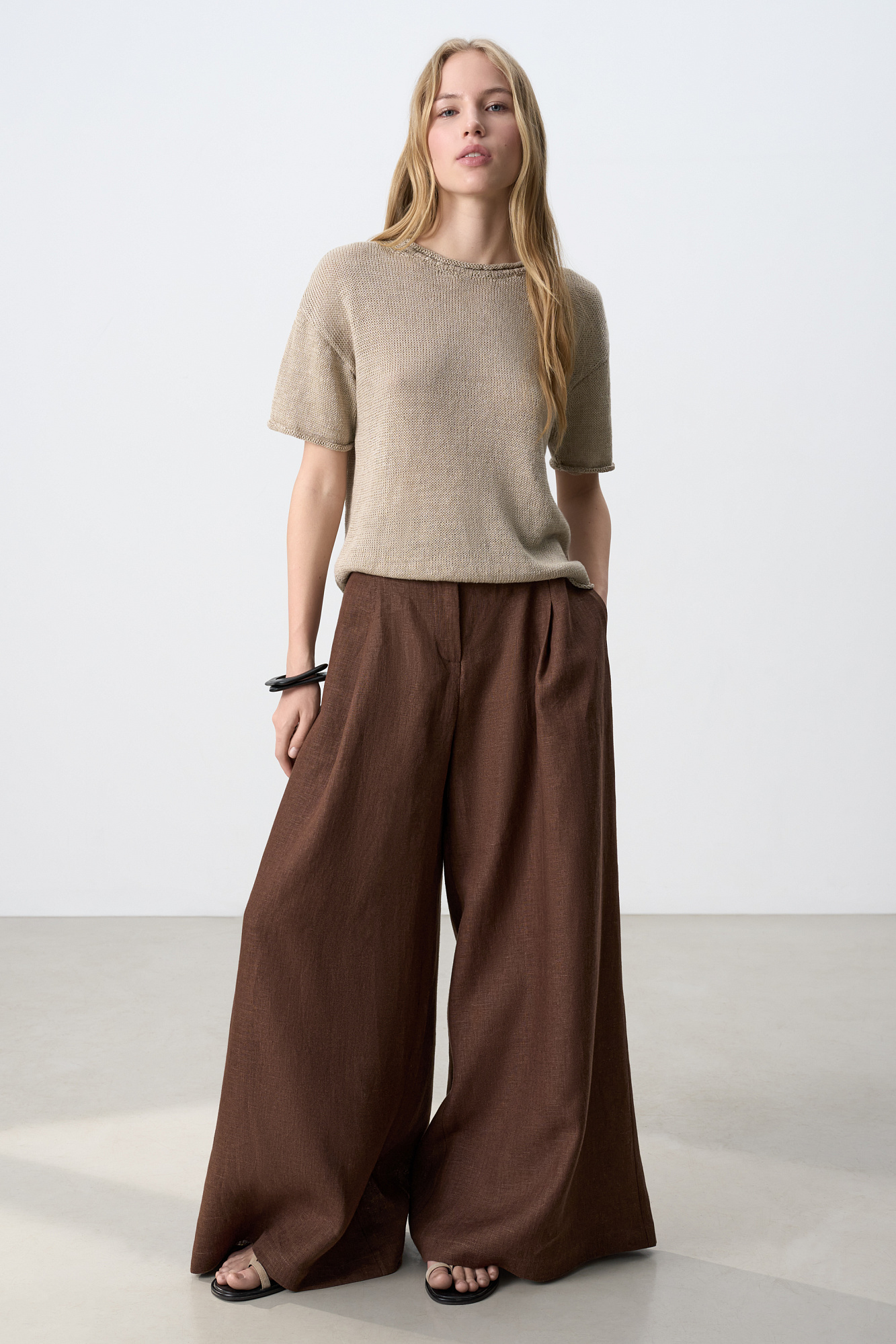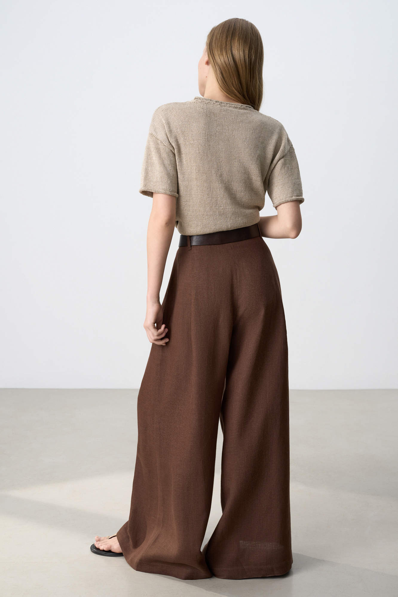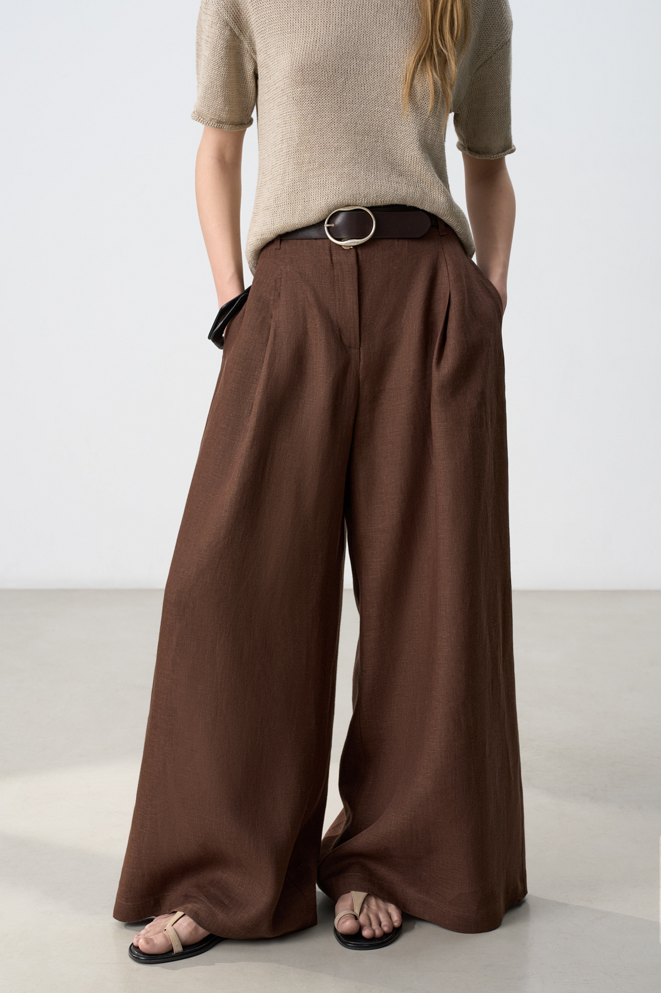 Широкие брюки из 100% льна с высокой посадкой. Модель прямого кроя с защипами и боковыми карманами. Шлевки на поясе для ремня. Застежка на молнию и две пуговицы.