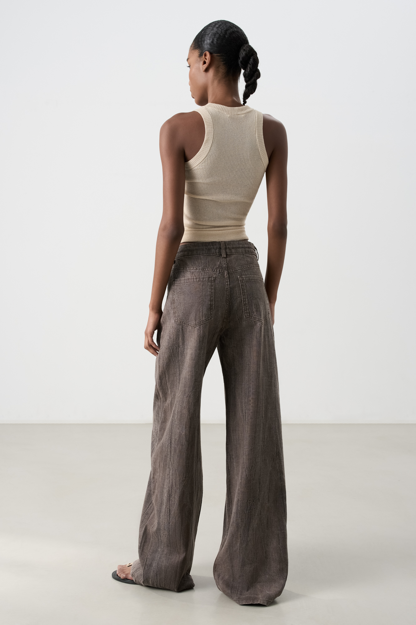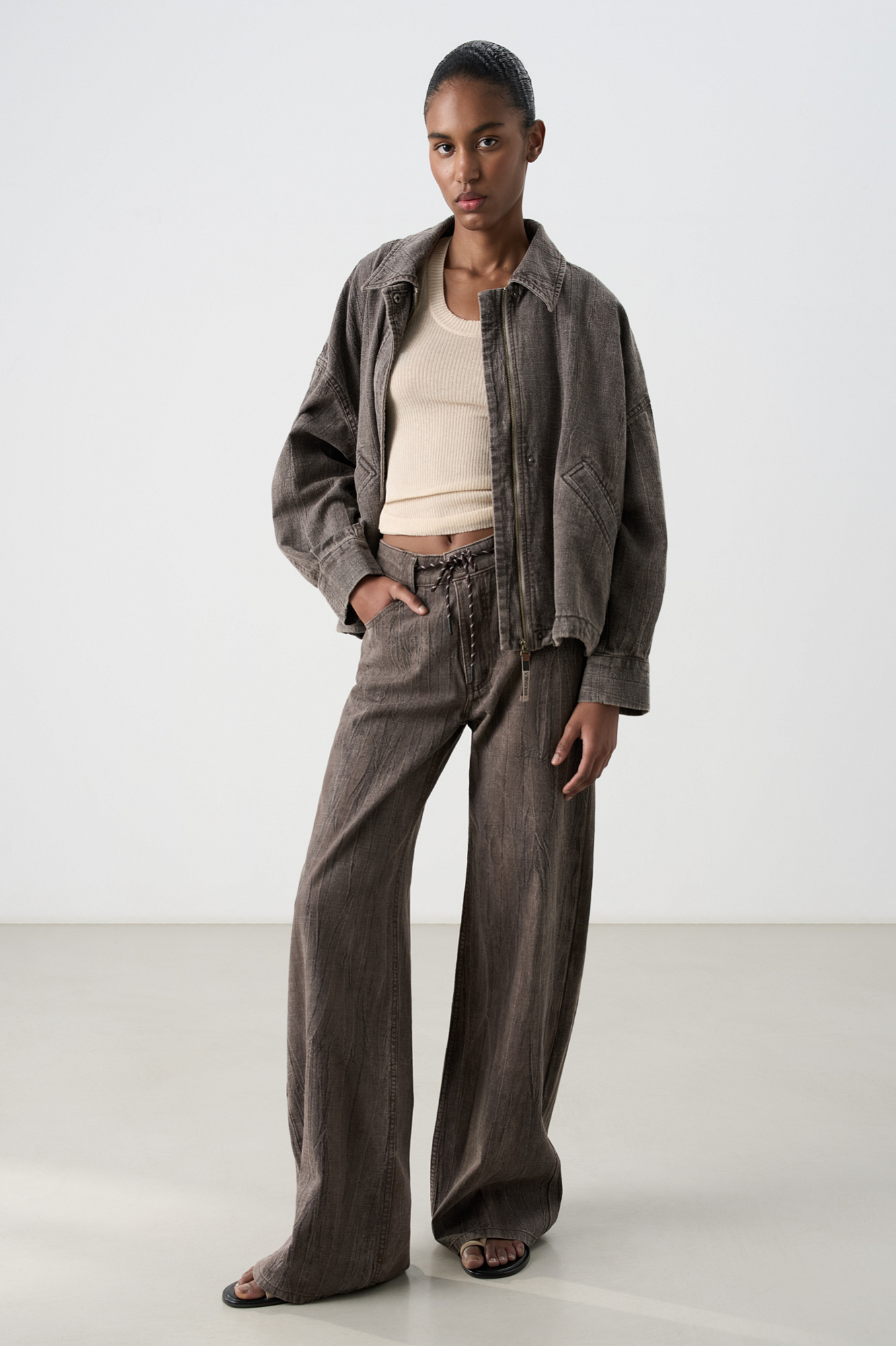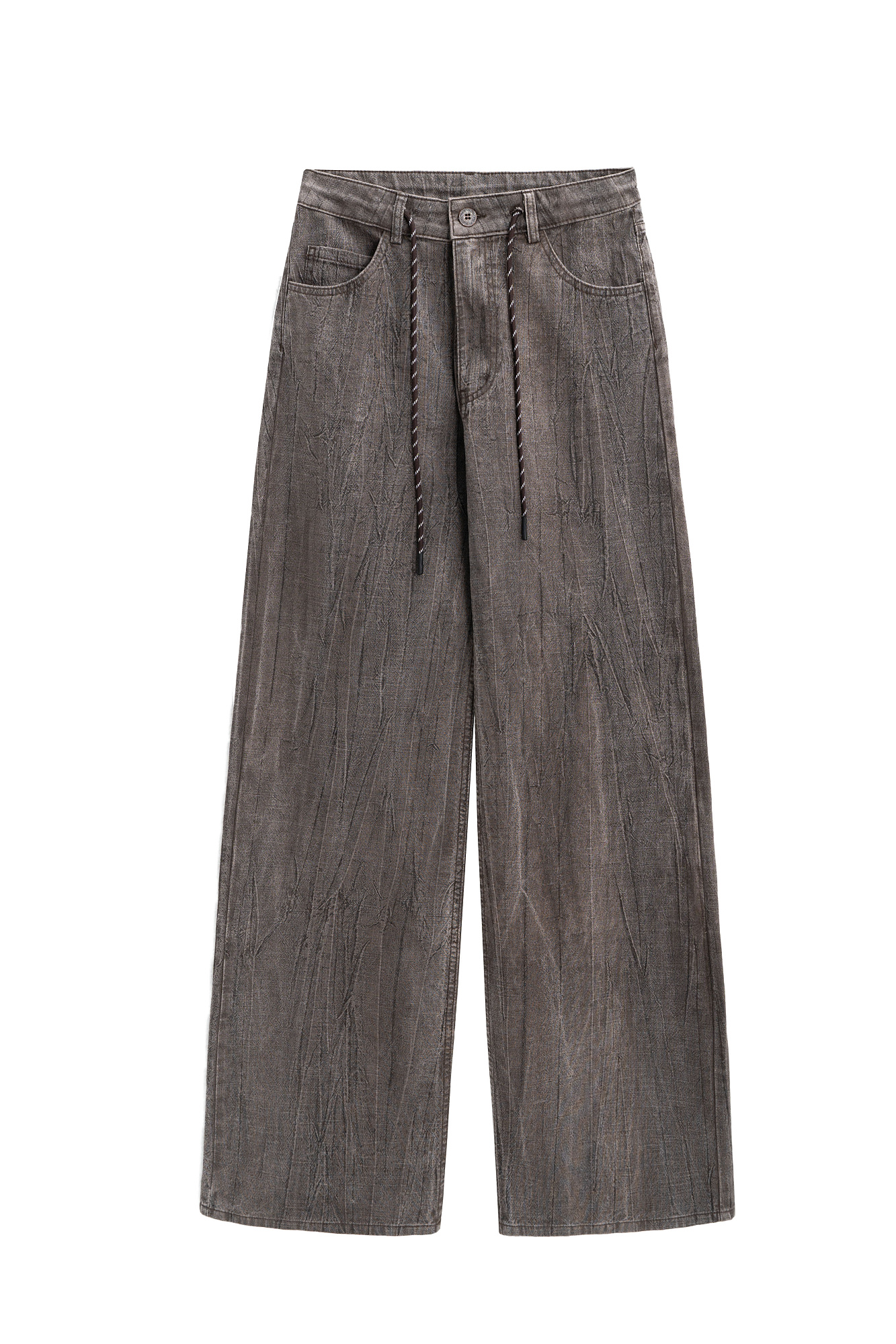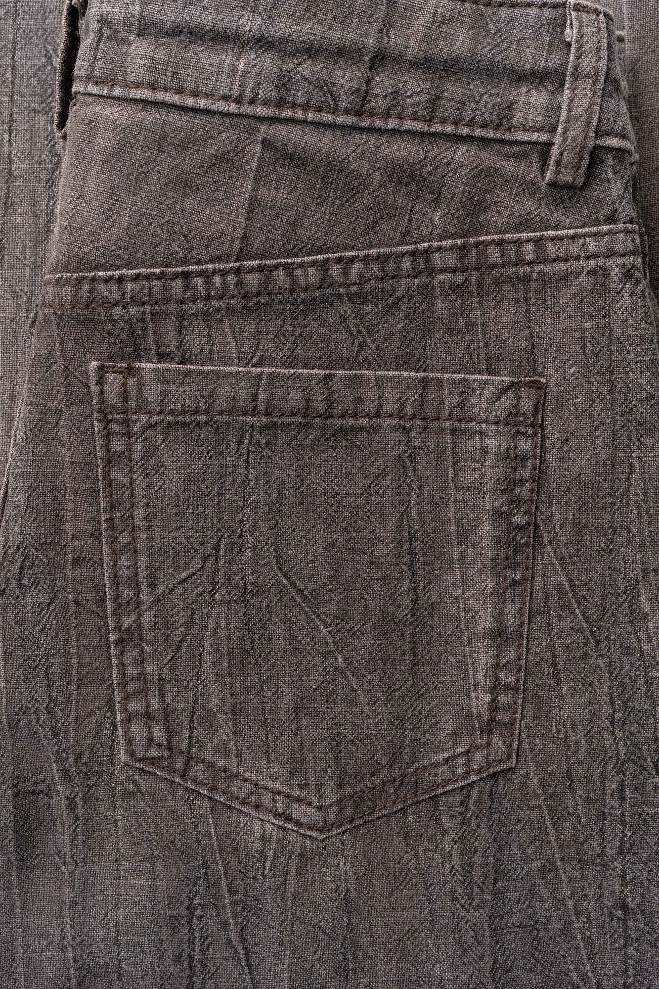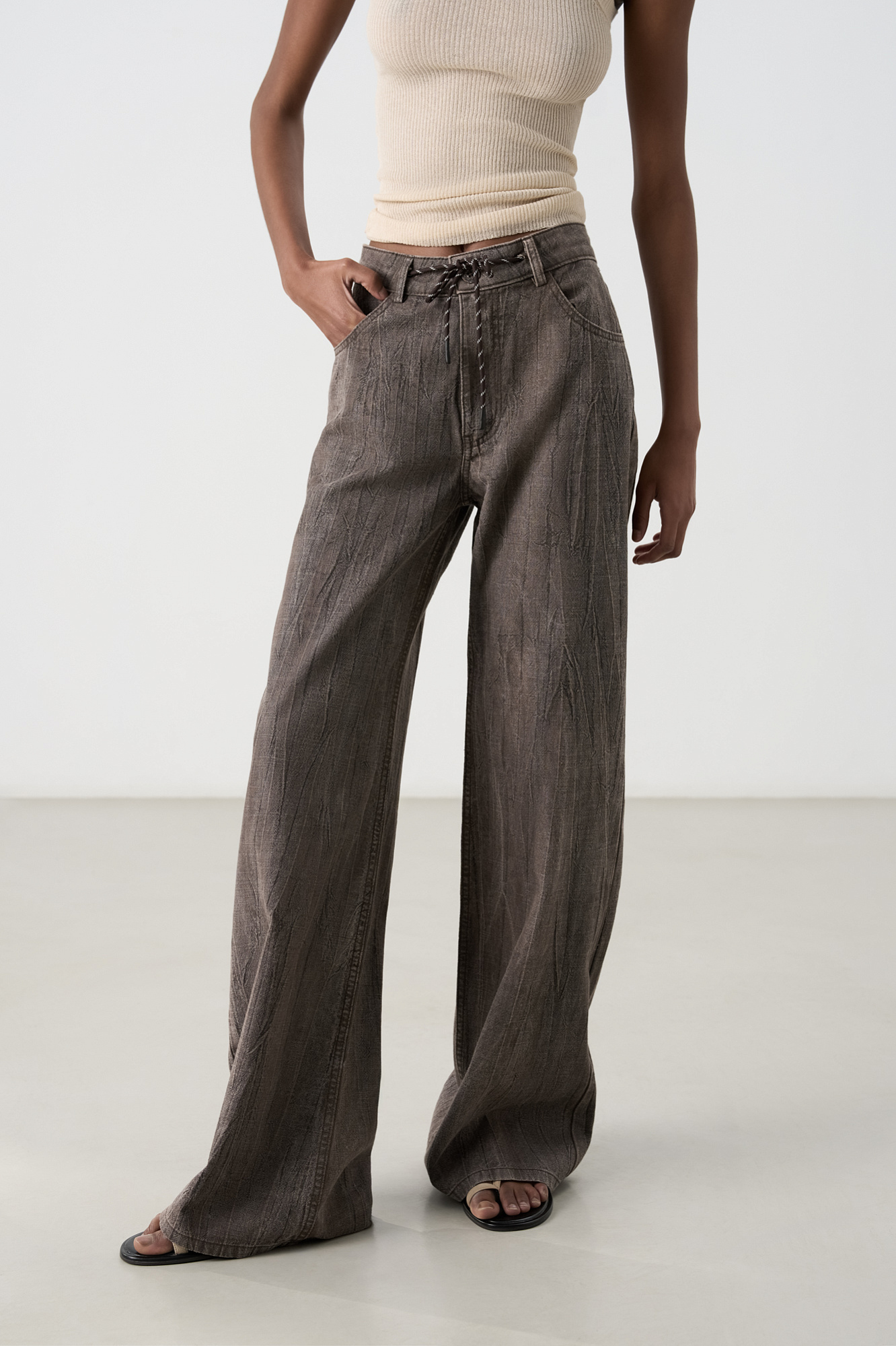Брюки из плотной льняной ткани. Модель прямого кроя с широкими штанинами, пятью карманамии, шлевками на поясе для ремня и шнурком для регулировки посадки. Застежка на пуговицу и молнию.