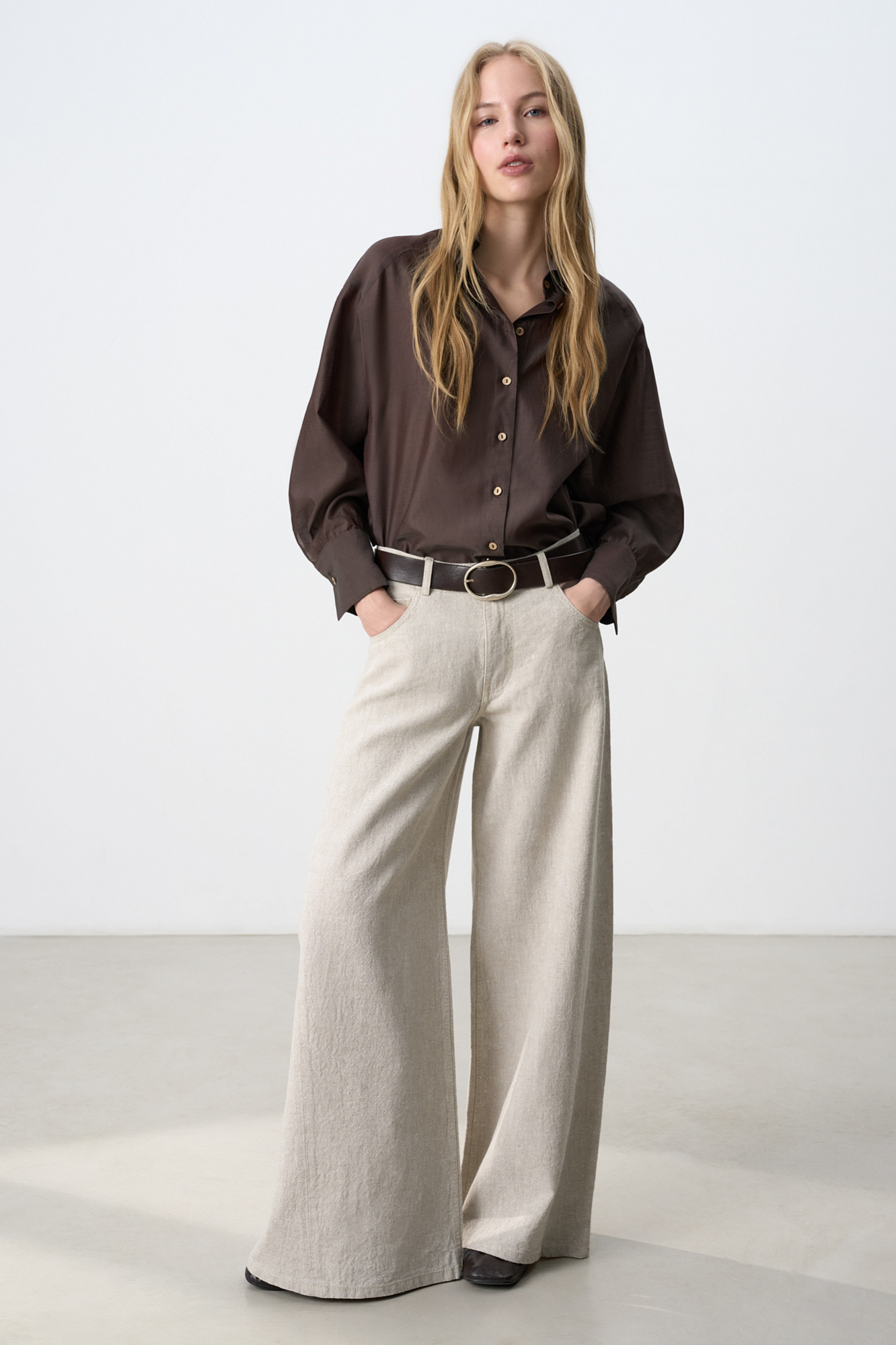 Широкие брюки из 100% льна. Модель прямого кроя, с широким поясом со шлеками для ремня и пятью карманами.
