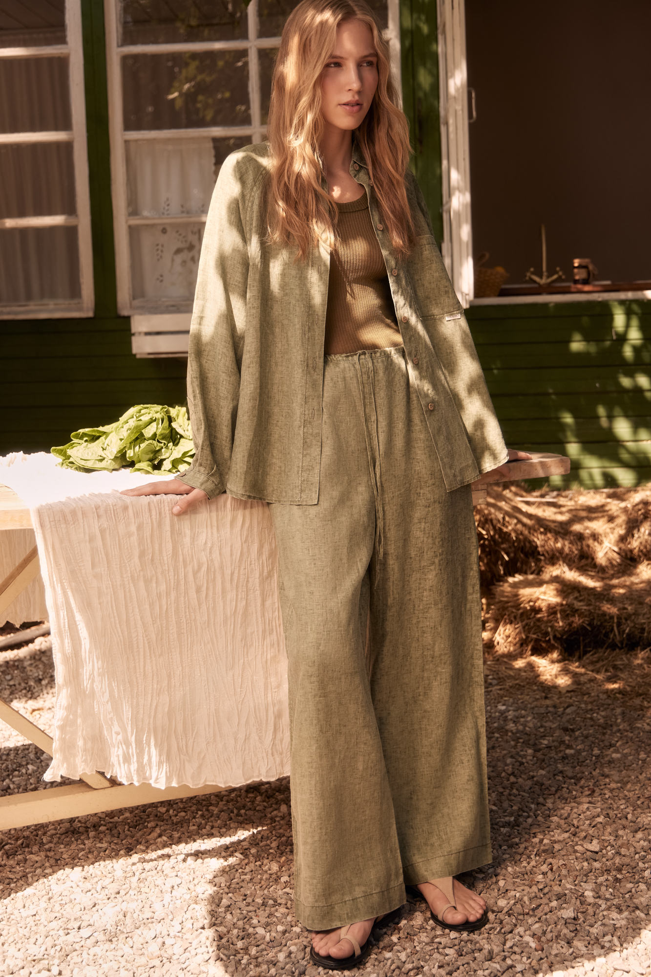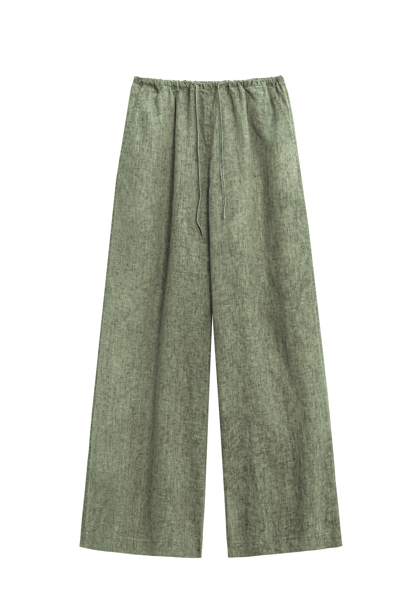 Брюки из 100% льна. Модель прямого кроя с широкими штанинами и двумя боковыми карманами. Изделие выполнено с поясом на кулиске.