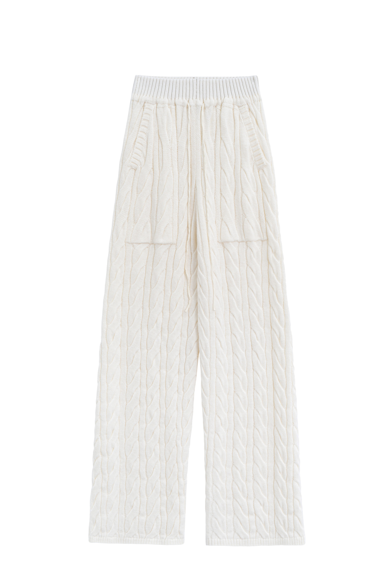 Прямые трикотажные брюки с объемными косами из мягкой шерсти. Широкий эластичный пояс на кулиске, передние и задние карманы и манжеты внизу. Дополнить образ можно джемпером в том же стиле.