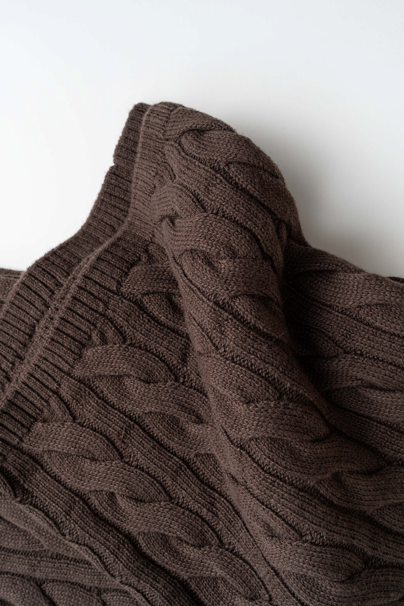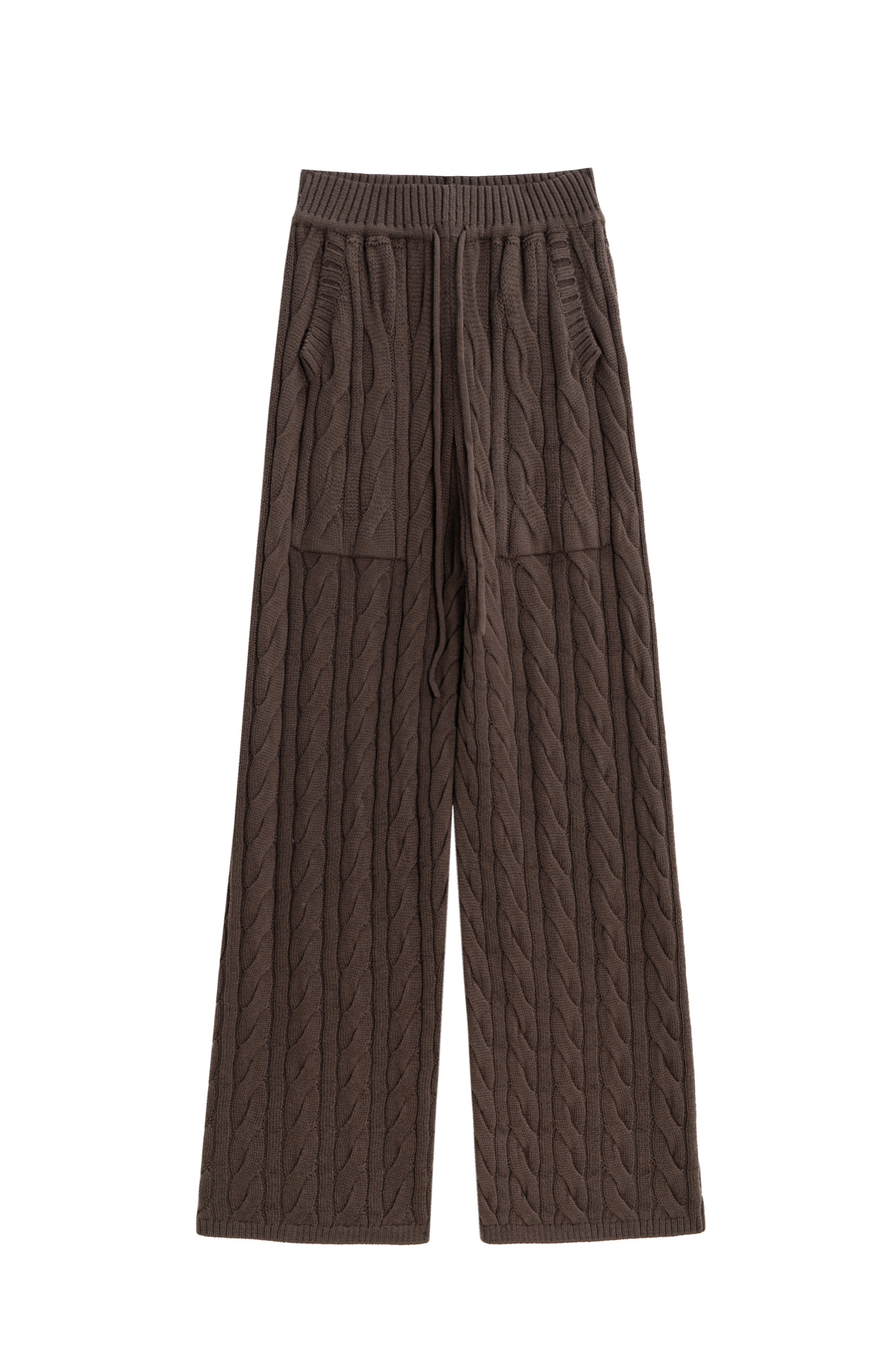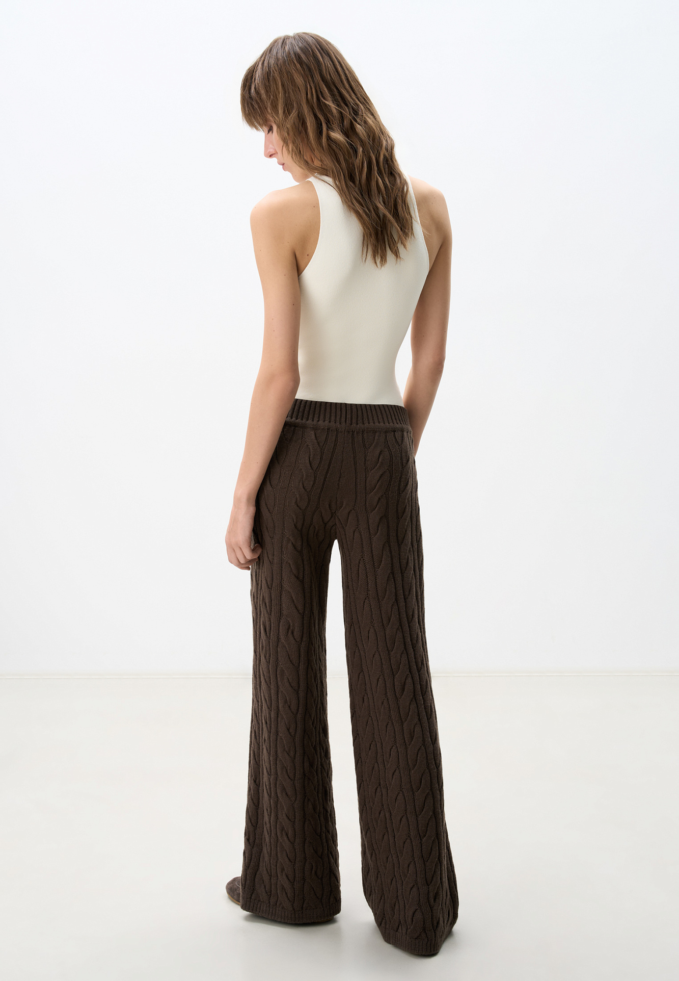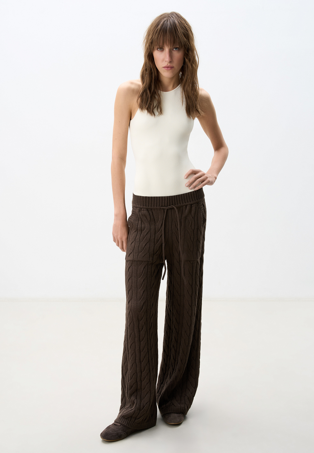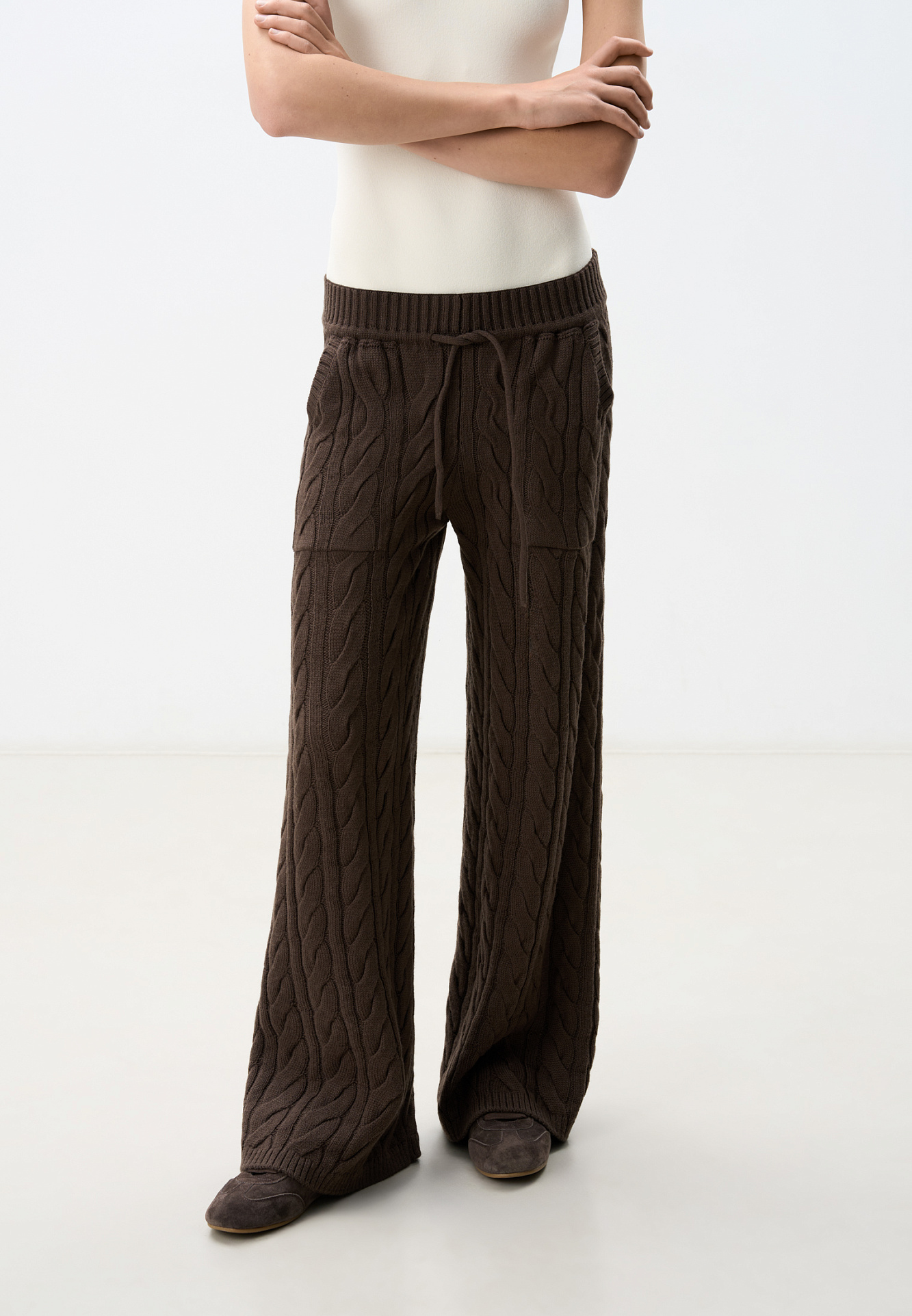 Прямые трикотажные брюки с объемными косами из мягкой шерсти. Широкий эластичный пояс на кулиске, передние и задние карманы и манжеты внизу. Дополнить образ можно джемпером в том же стиле.