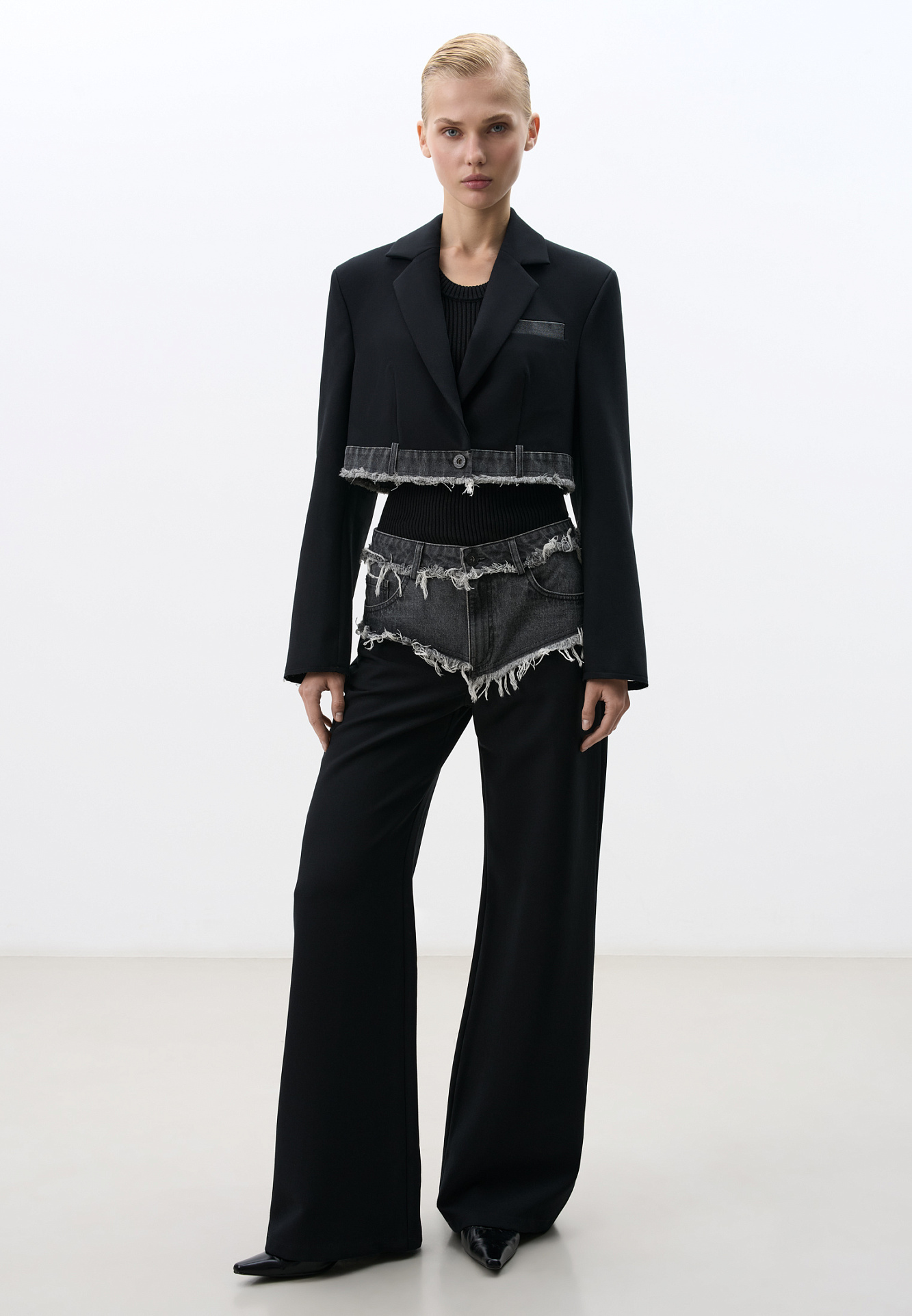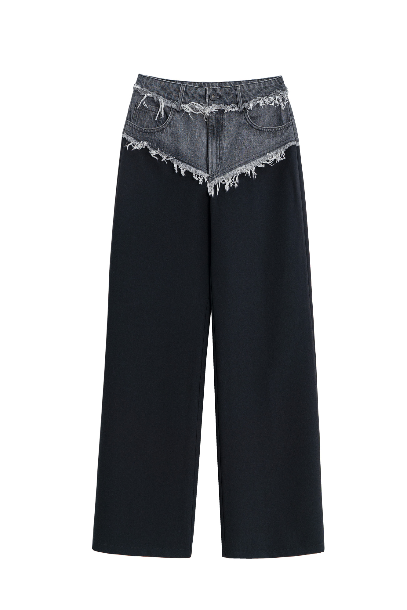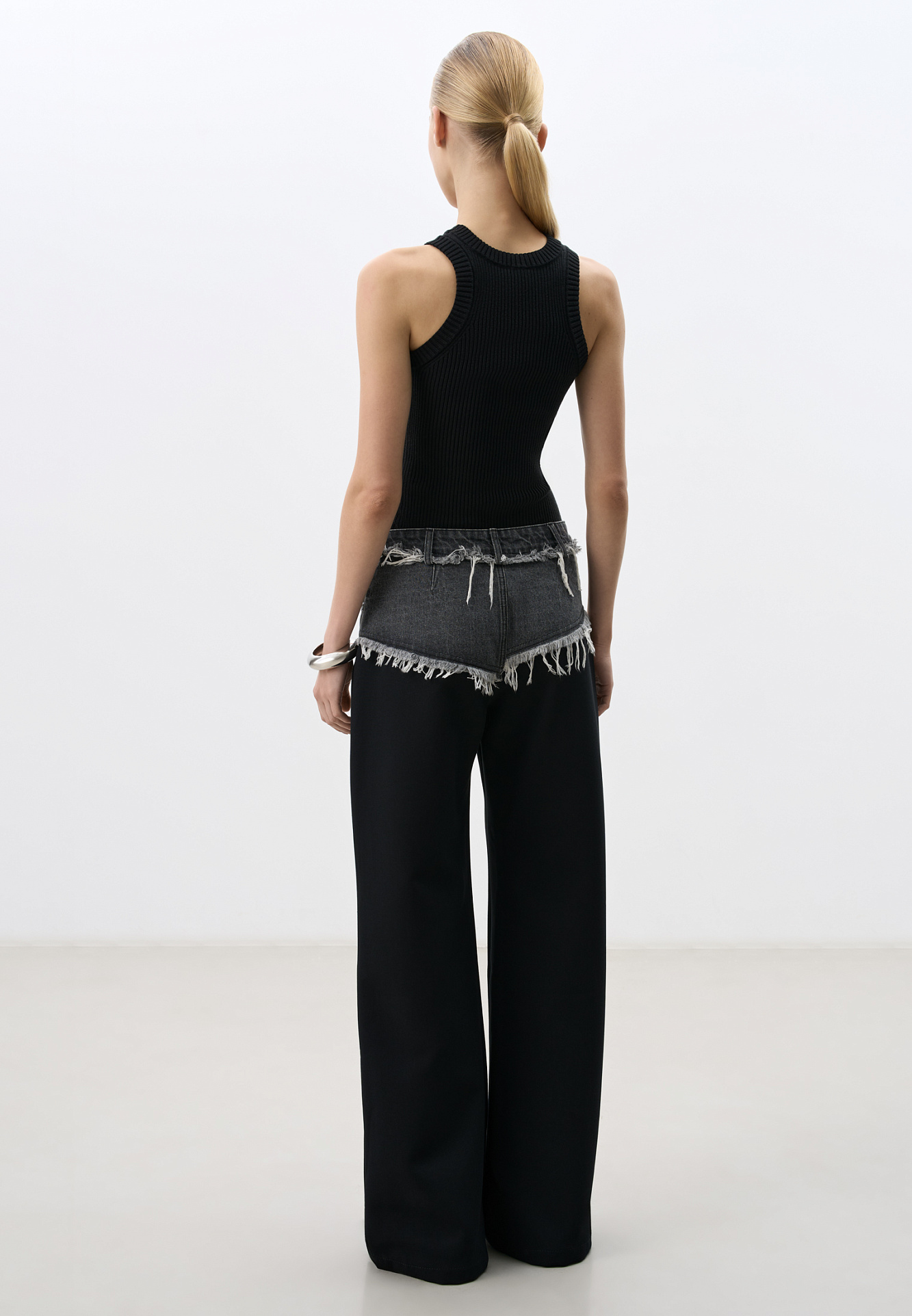 Широкие брюки из вискозы, со средней посадкой, декорированные вставкой из джинсовой ткани. Модель свободного силуэта с боковыми карманами и застежкой на молнию и пуговицу.