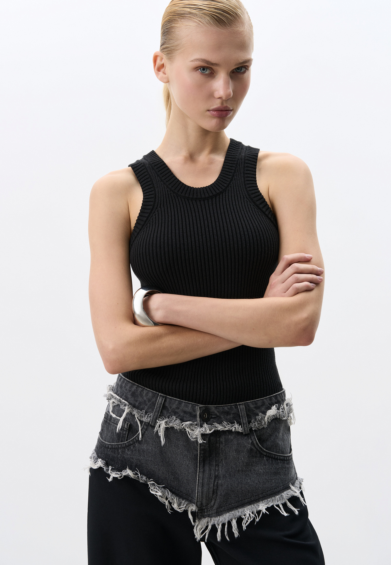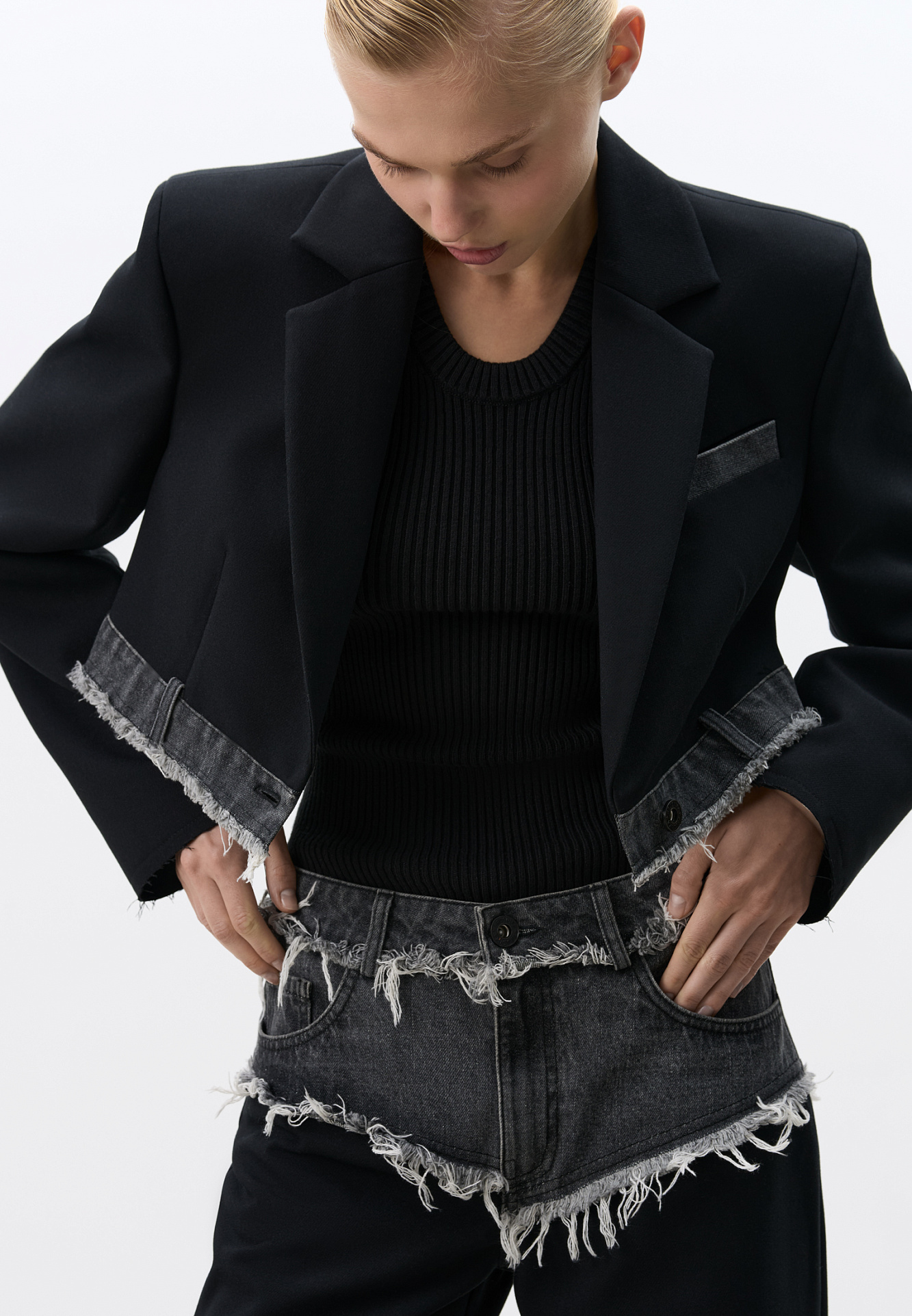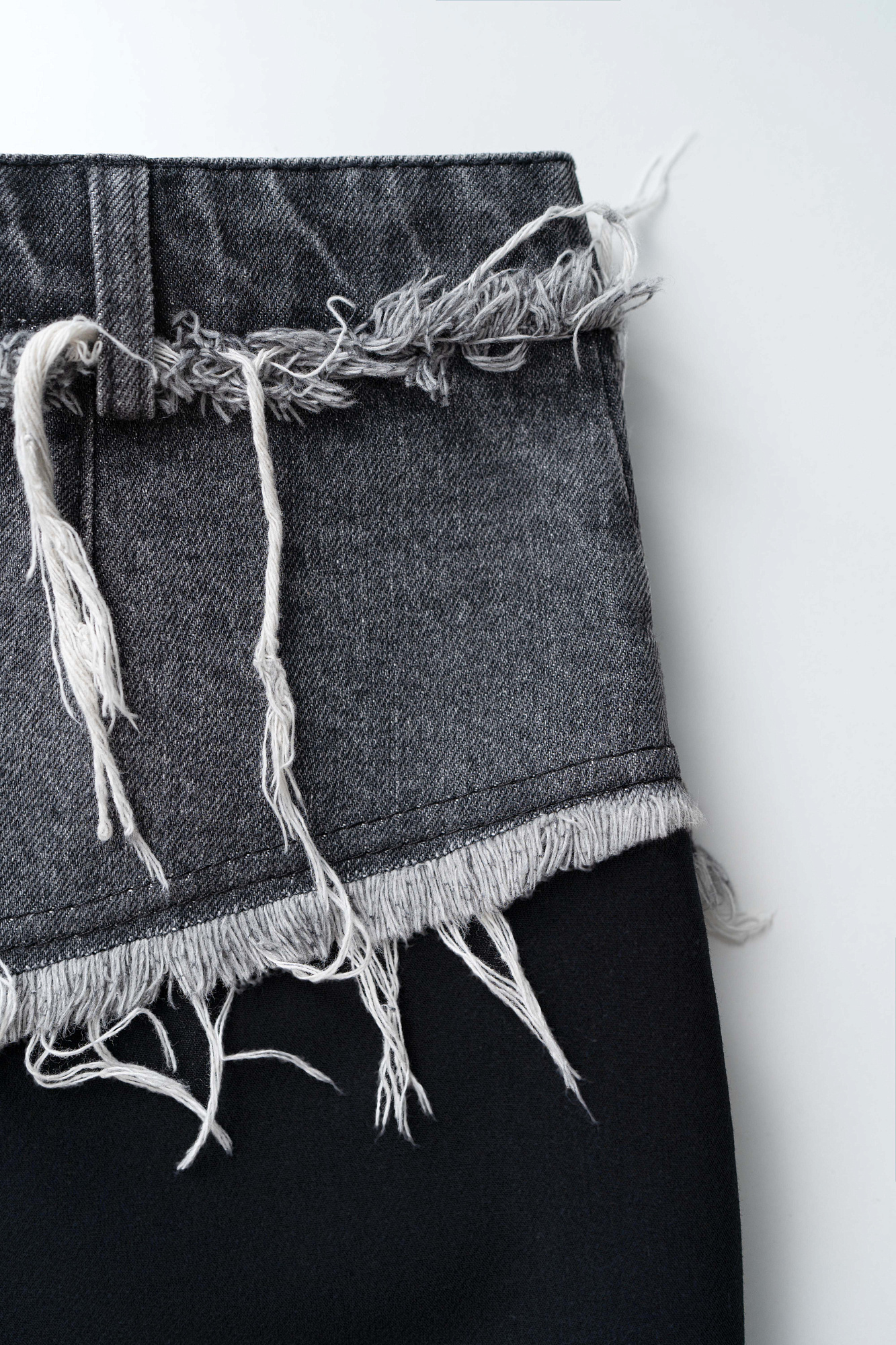 Широкие брюки из вискозы, со средней посадкой, декорированные вставкой из джинсовой ткани. Модель свободного силуэта с боковыми карманами и застежкой на молнию и пуговицу.