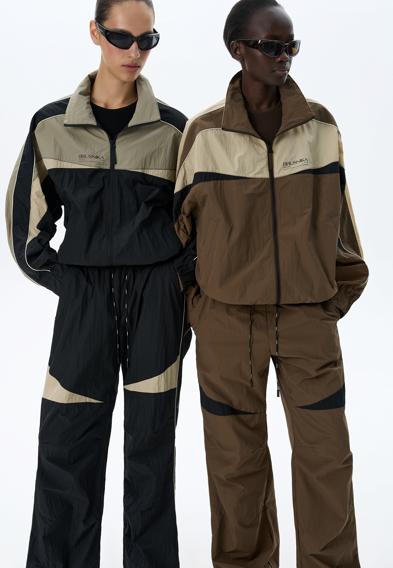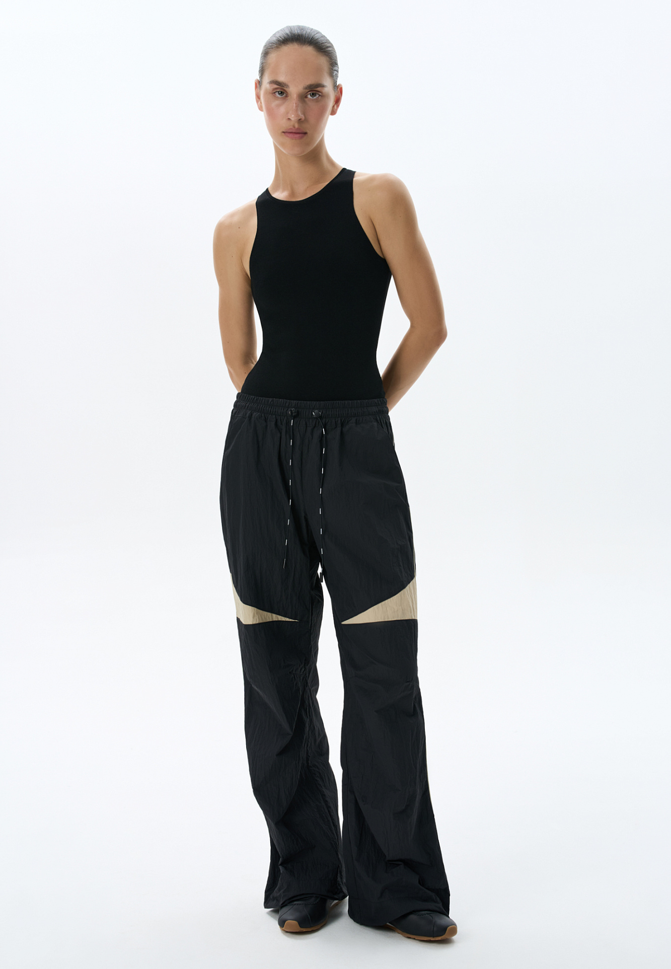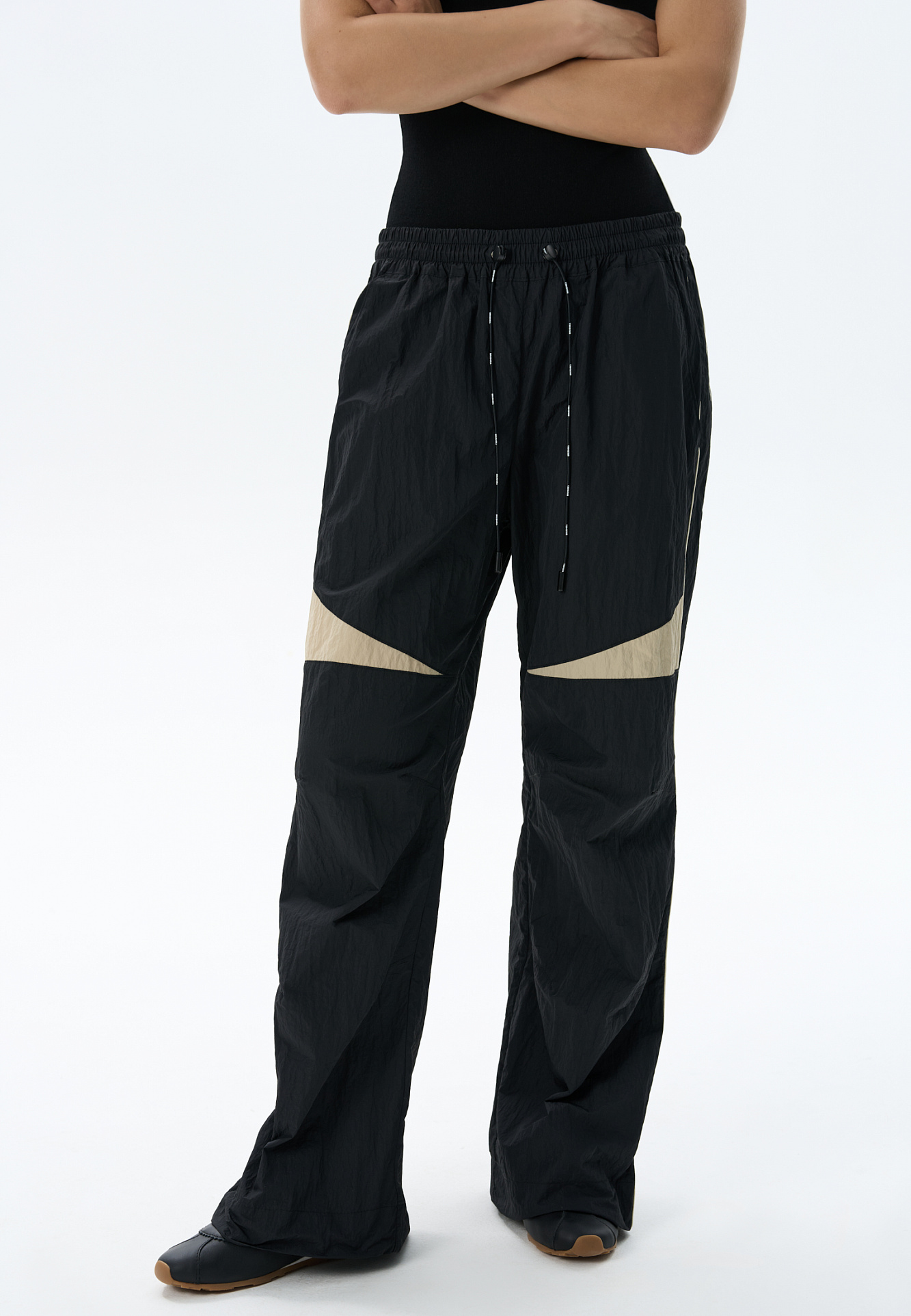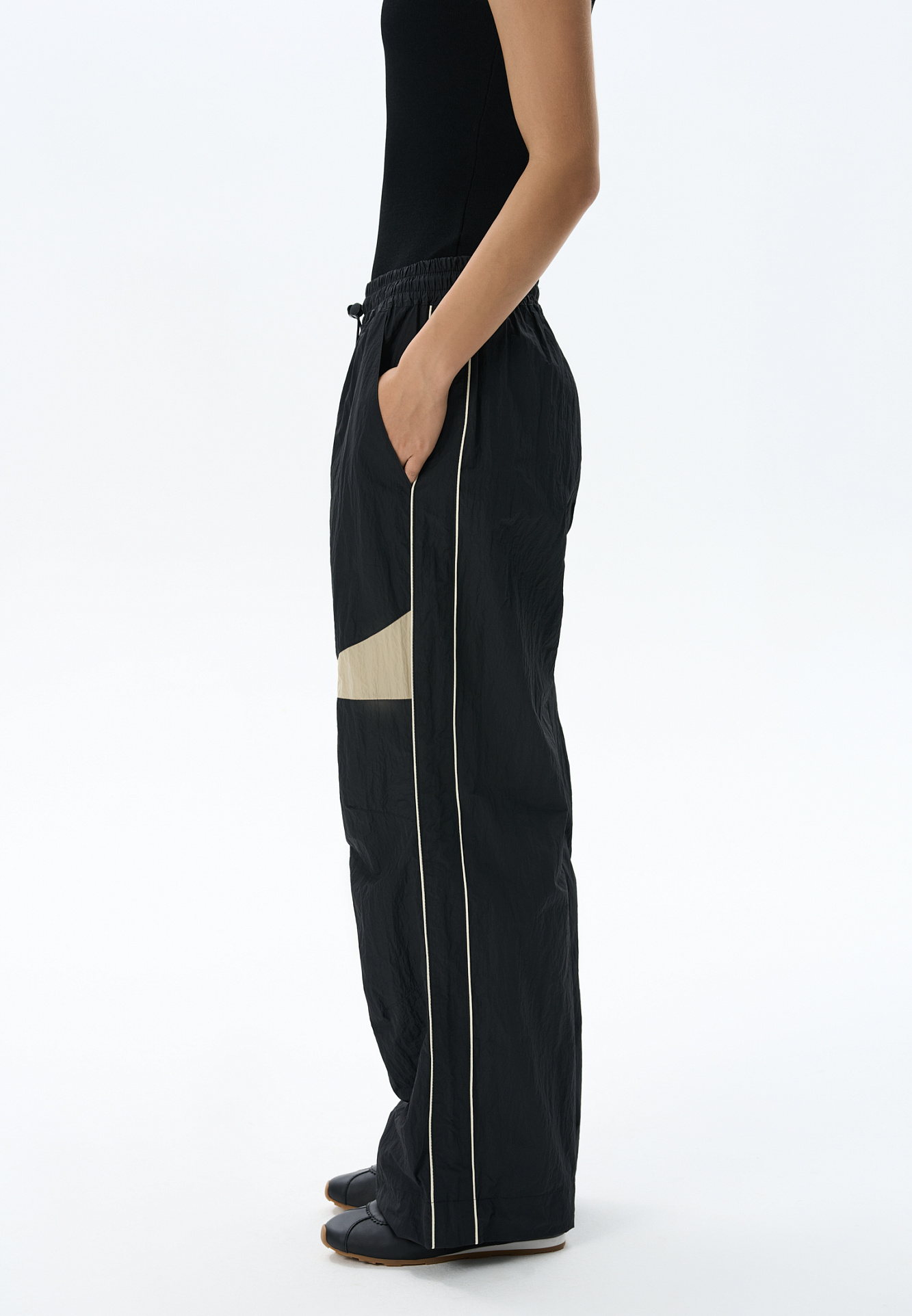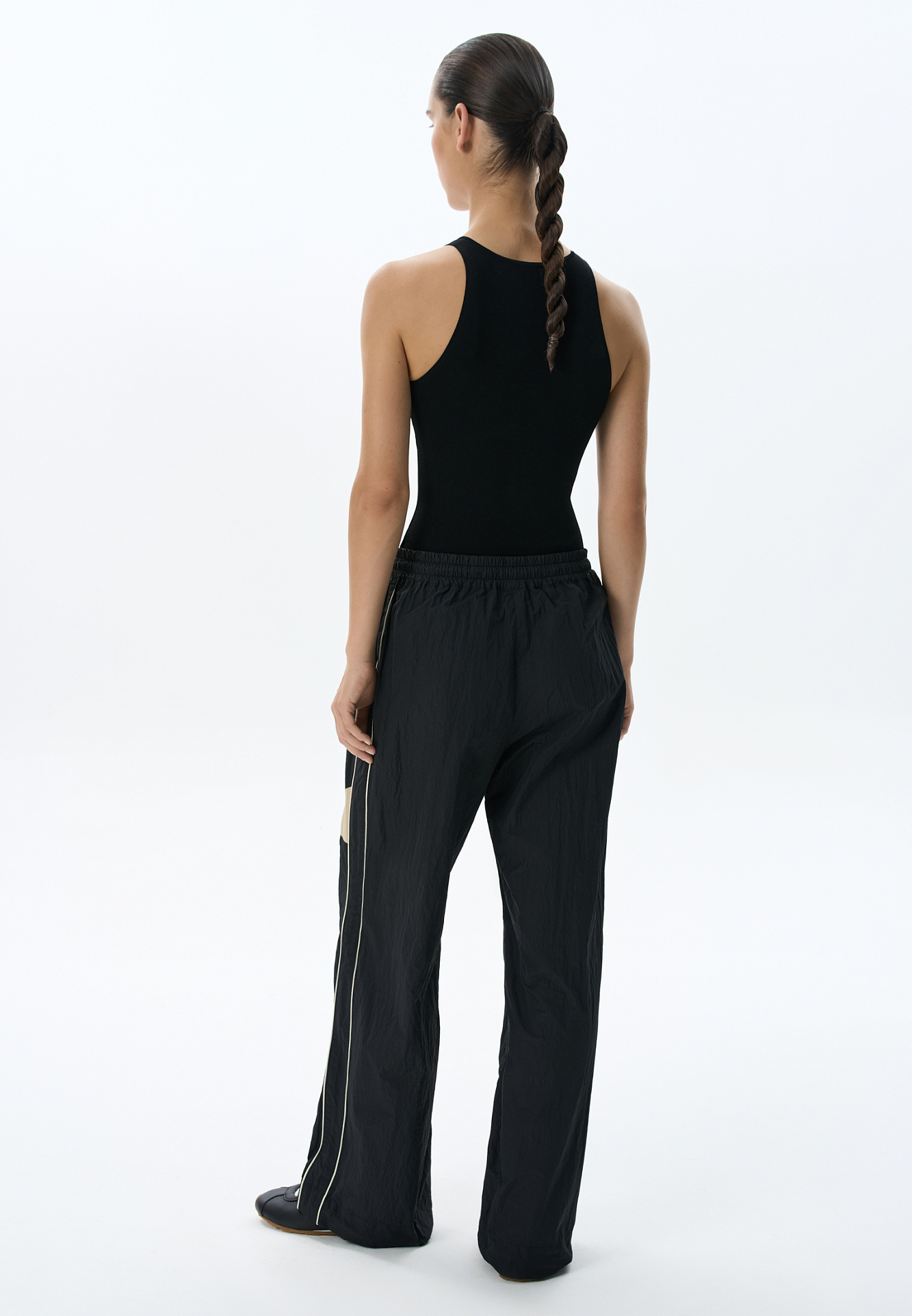 Спортивные брюки из 100% нейлона. Модель свободного силуэта, с широким эластичным поясом на резинке, дополненным кулиской. Изделие декорировано контрастными вставками. Дополнить образ можно олимпийкой в таком же стиле.