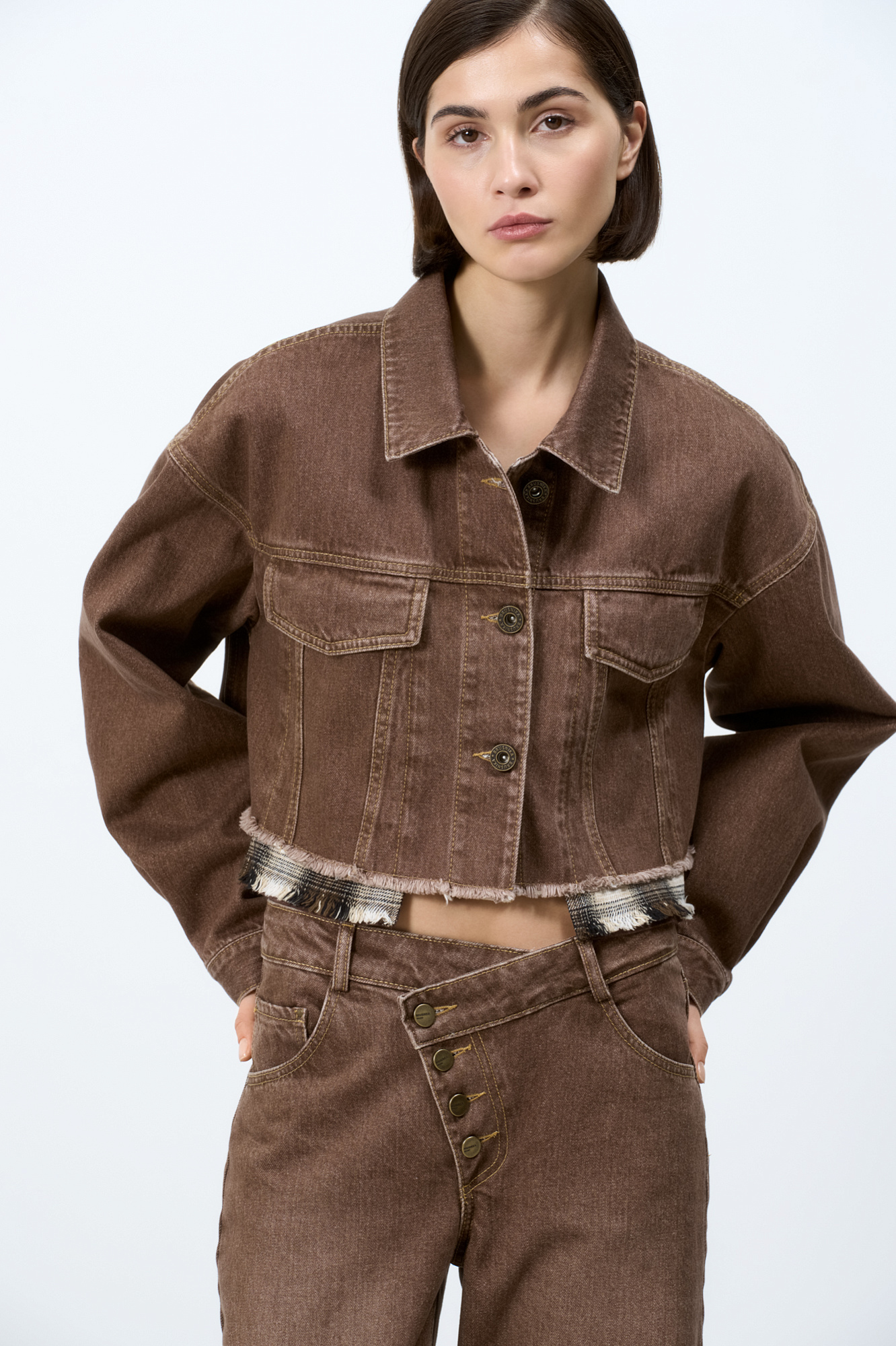Укороченный джинсовый жакет прямого кроя с отложным воротником, рельефными швами и необработанным краем. Модель декорирована накладными карманами на груди. Застежка на пуговицы.
