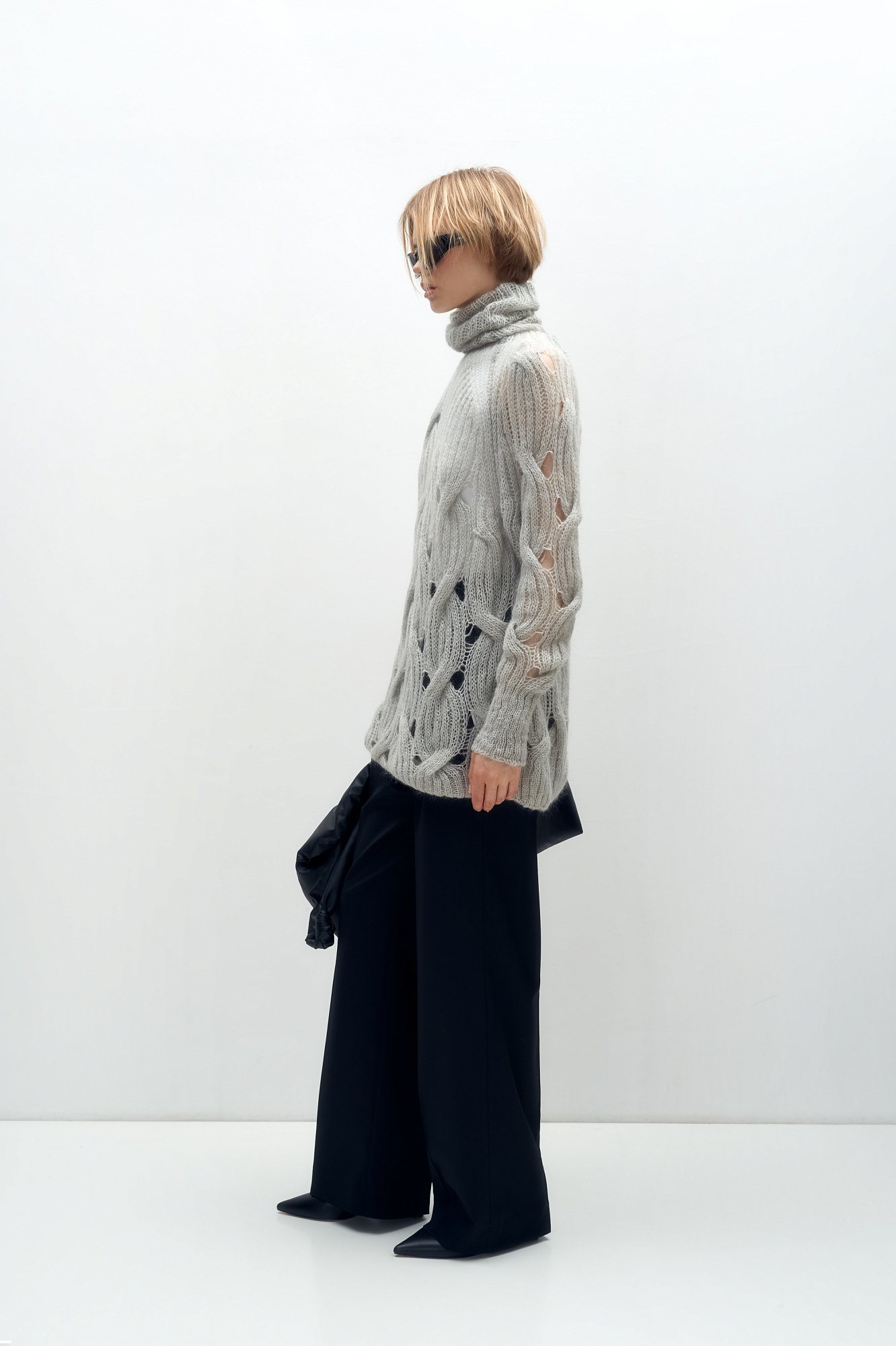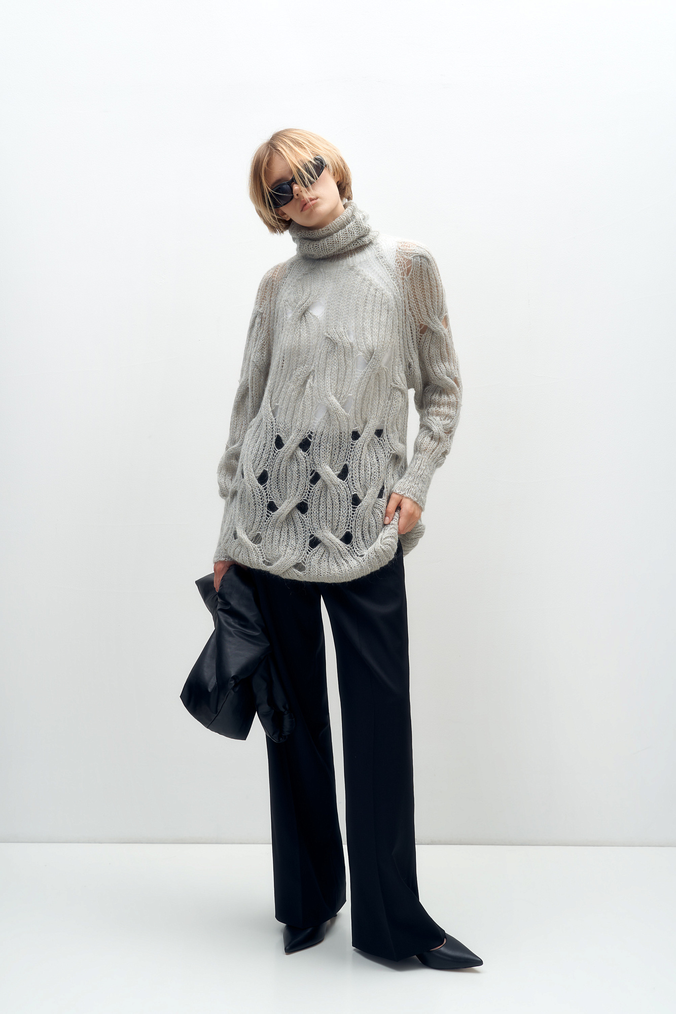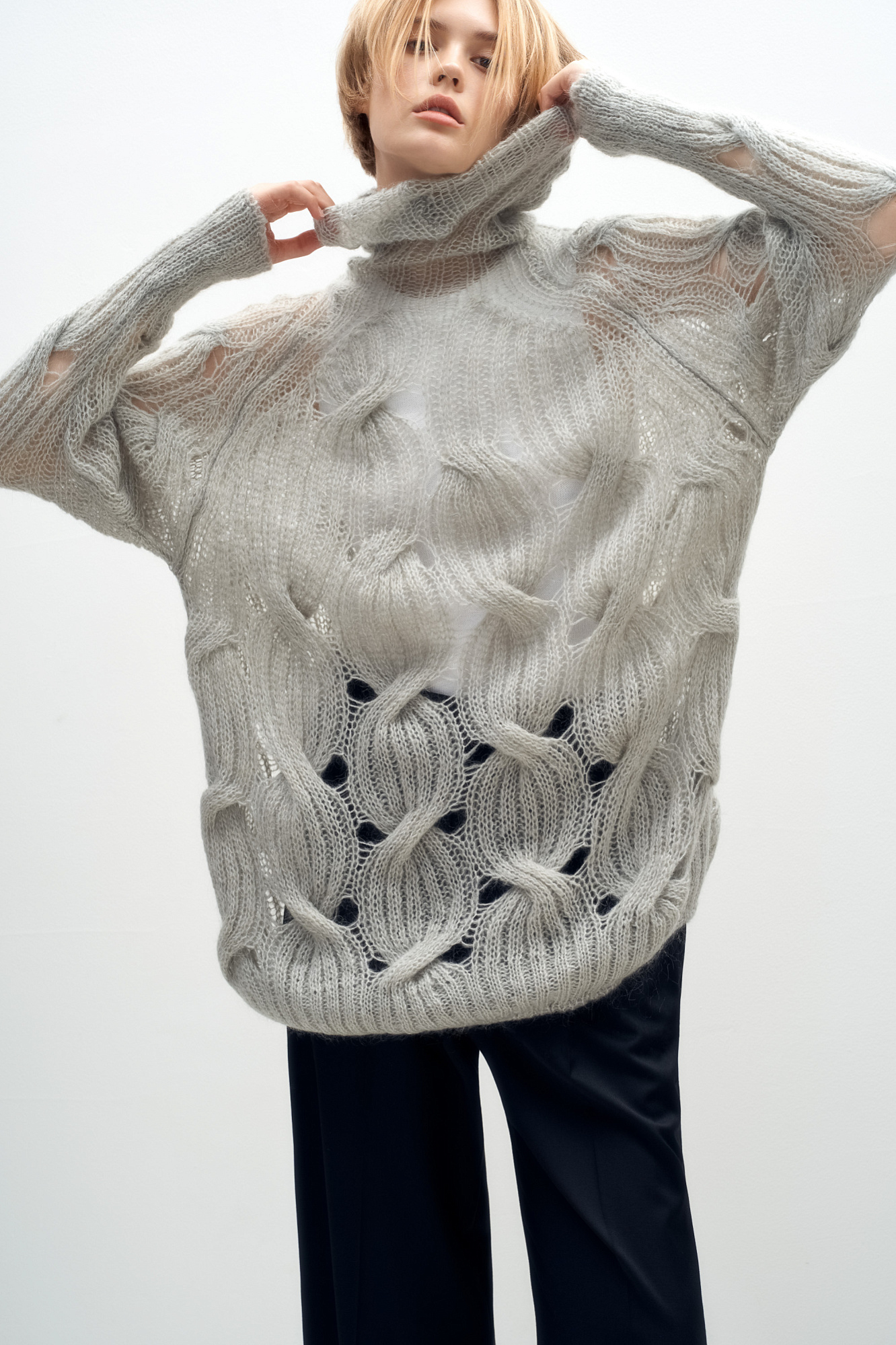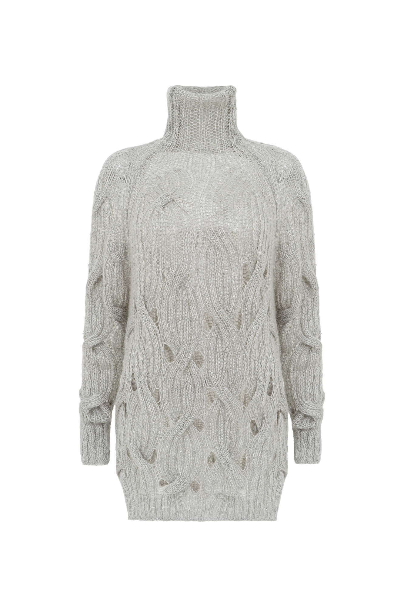 Объемный удлиненный джемпер с мохером, вязка выполнена крупными косами. Высокий ворот под горло. Манжеты рукавов и низ изделия на резинке.