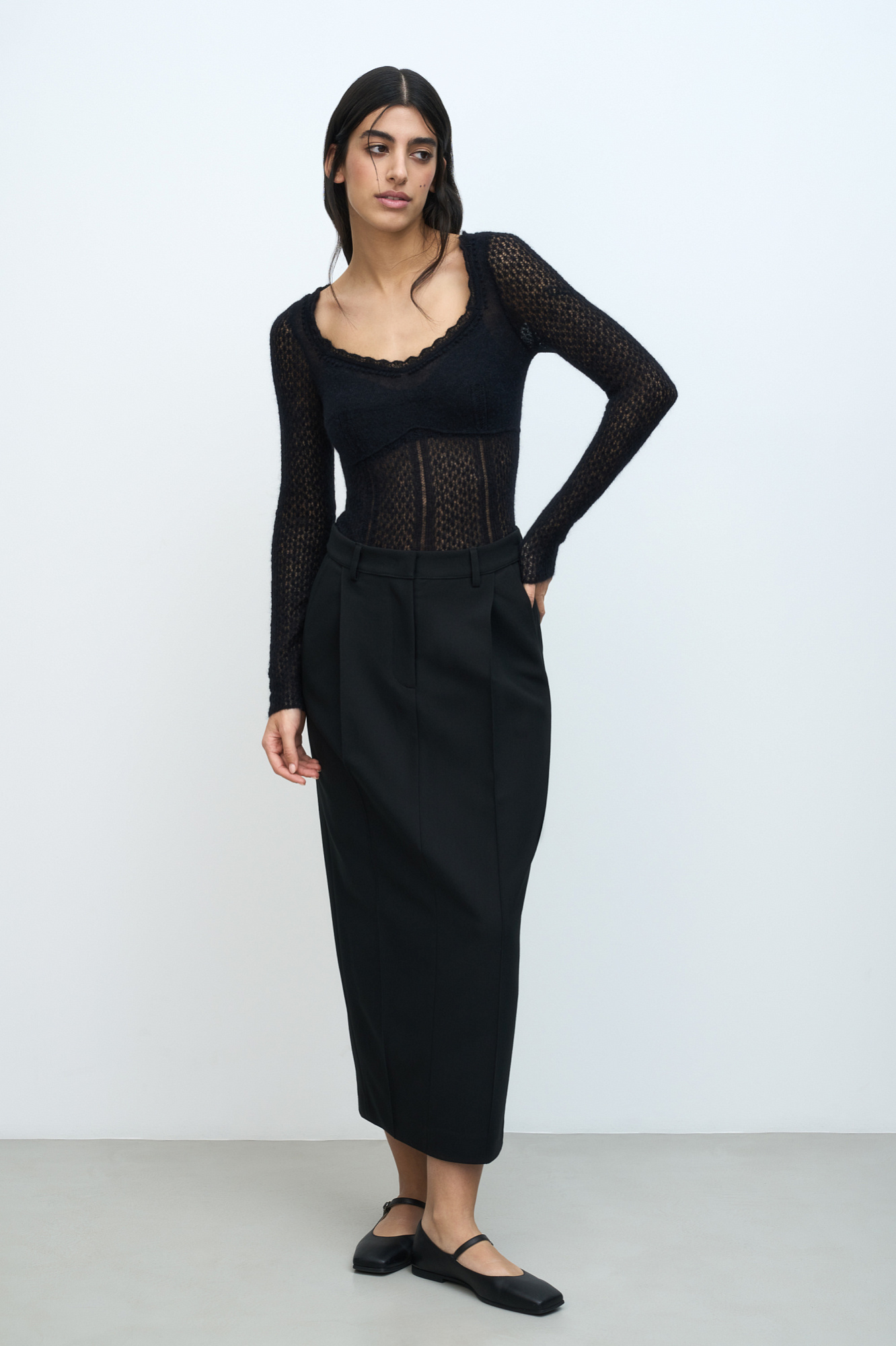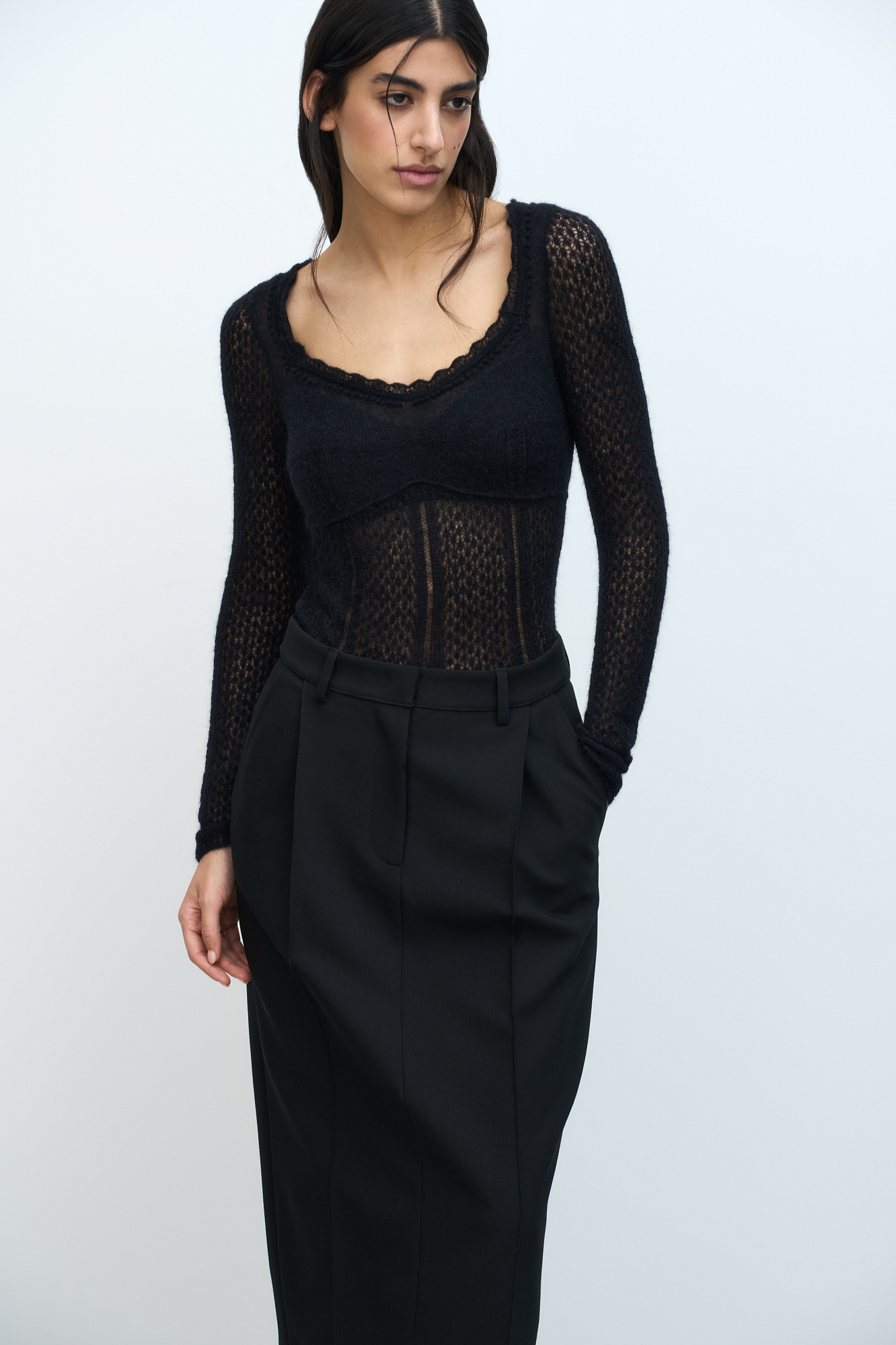 тонкий ажурный джемпер из супер кид мохера и шерсти беби альпака. Модель приталенного силуэта, с глубоким вывязаным декольте и длинными рукавами.