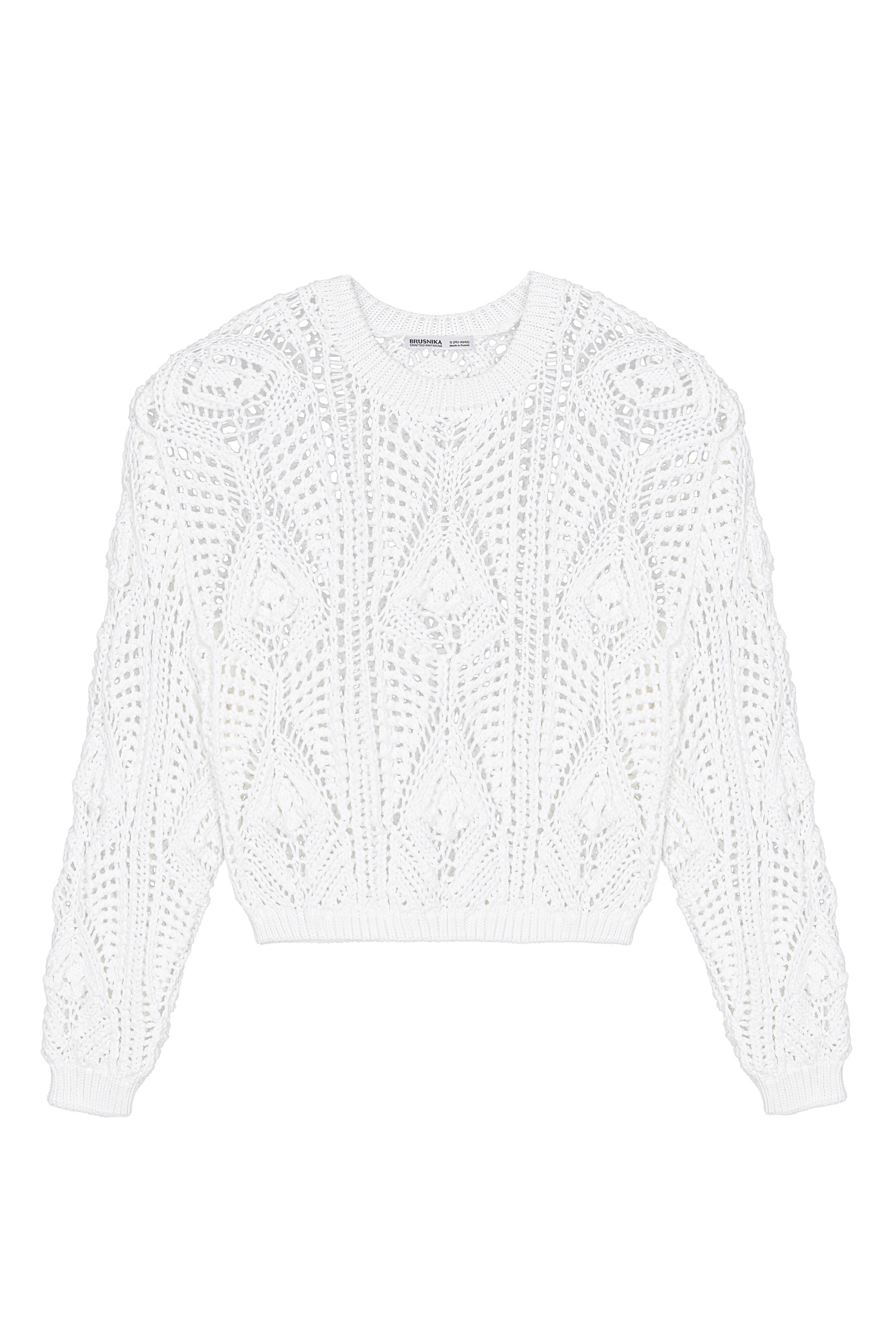 Трикотажный джемпер из хлопка, выполненный ажурной вязкой с орнаментом. Модель свободного силуэта с длинными рукавами и круглым вырезом горловины. Манжеты и низ изделия выполнены в рубчик.