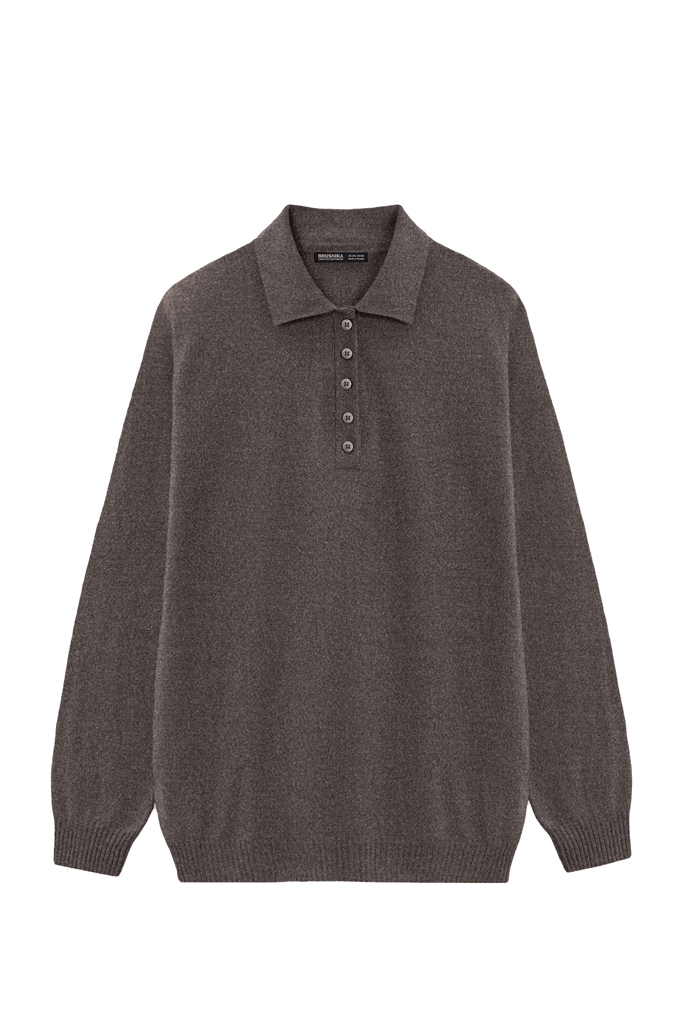 Трикотажный джемпер из кашемира и шерсти. Модель прямого силуэта со спущенной линией плеча и воротником поло на пуговицах. Манжеты рукавов и низ изделия выполнен в рубчик.
