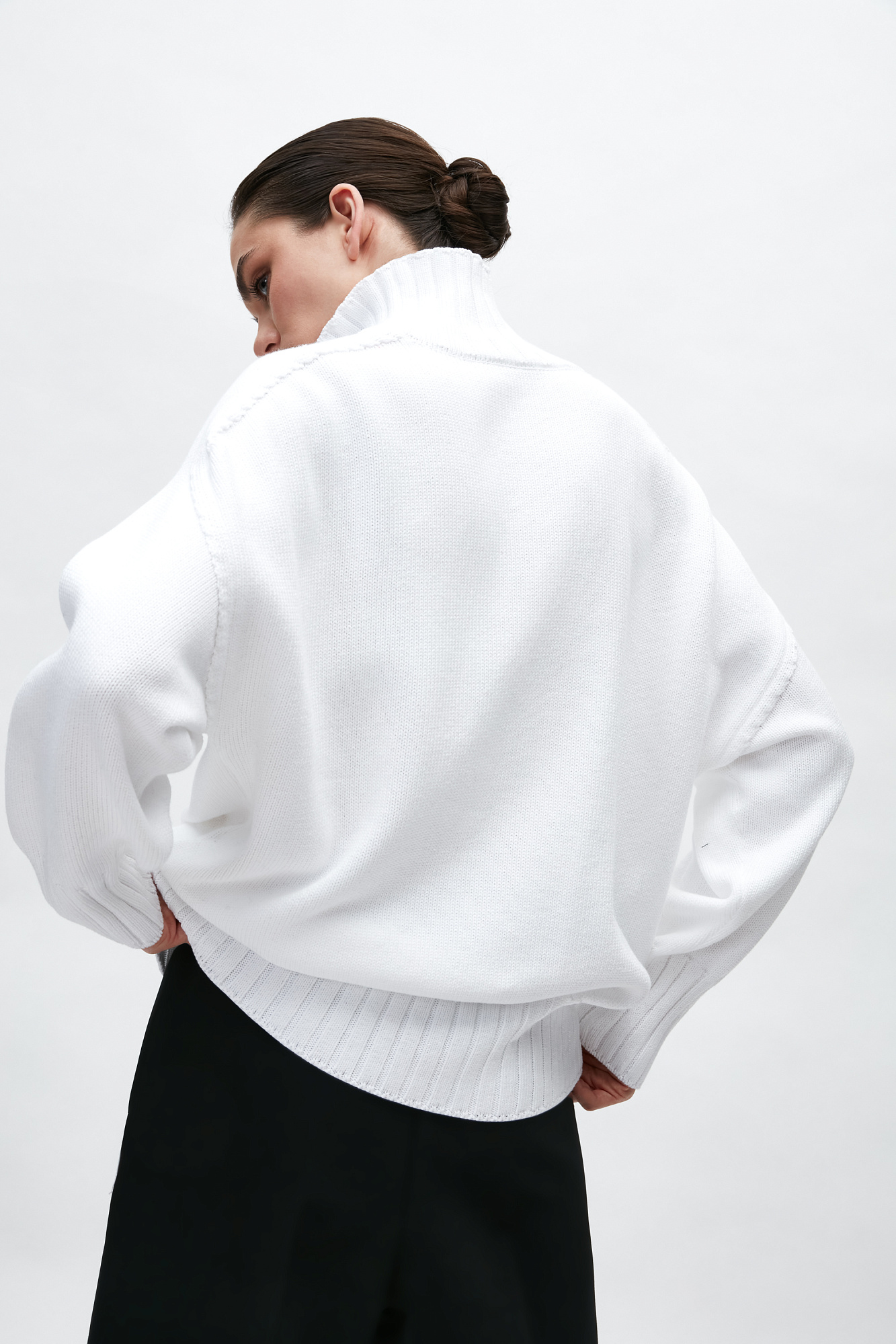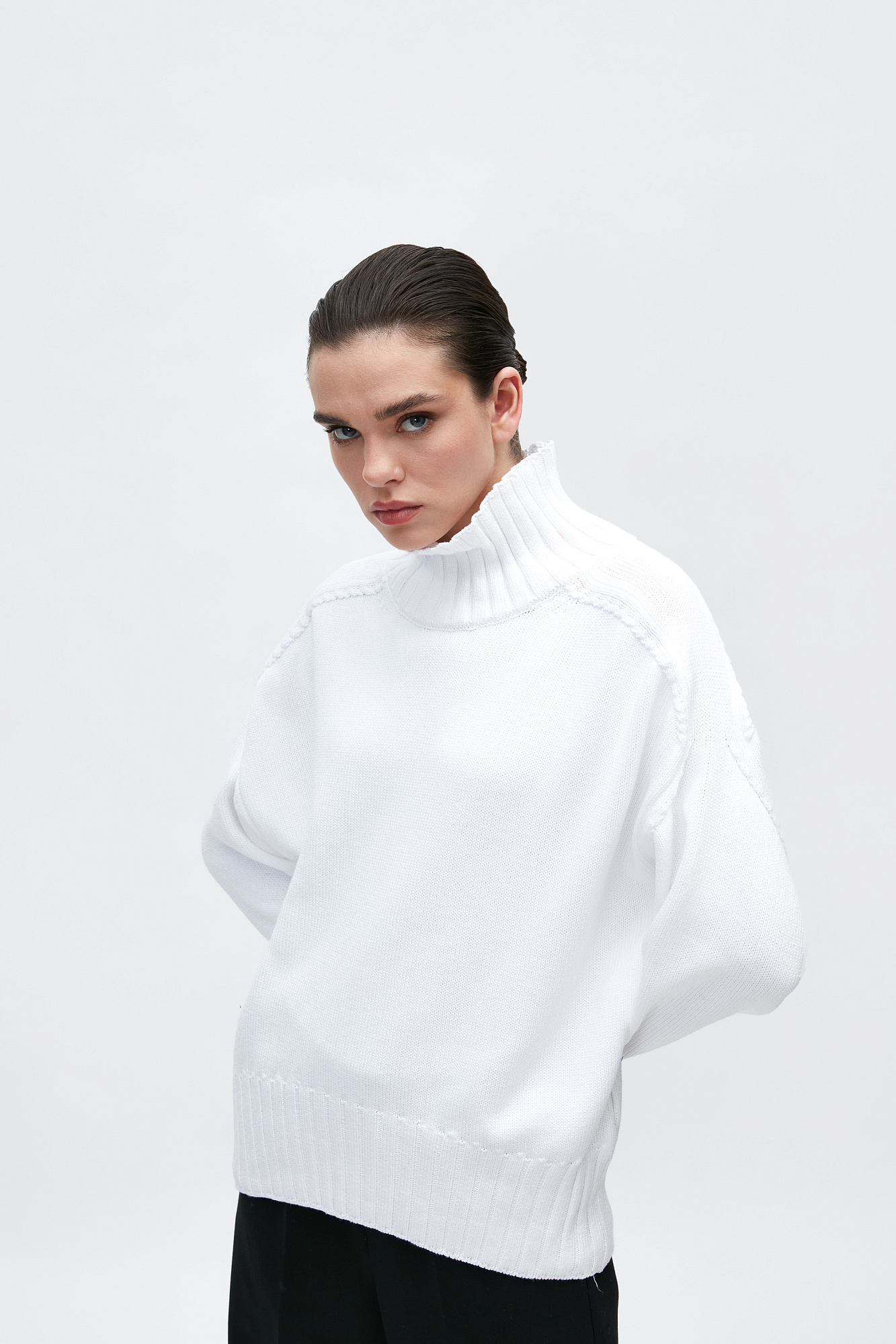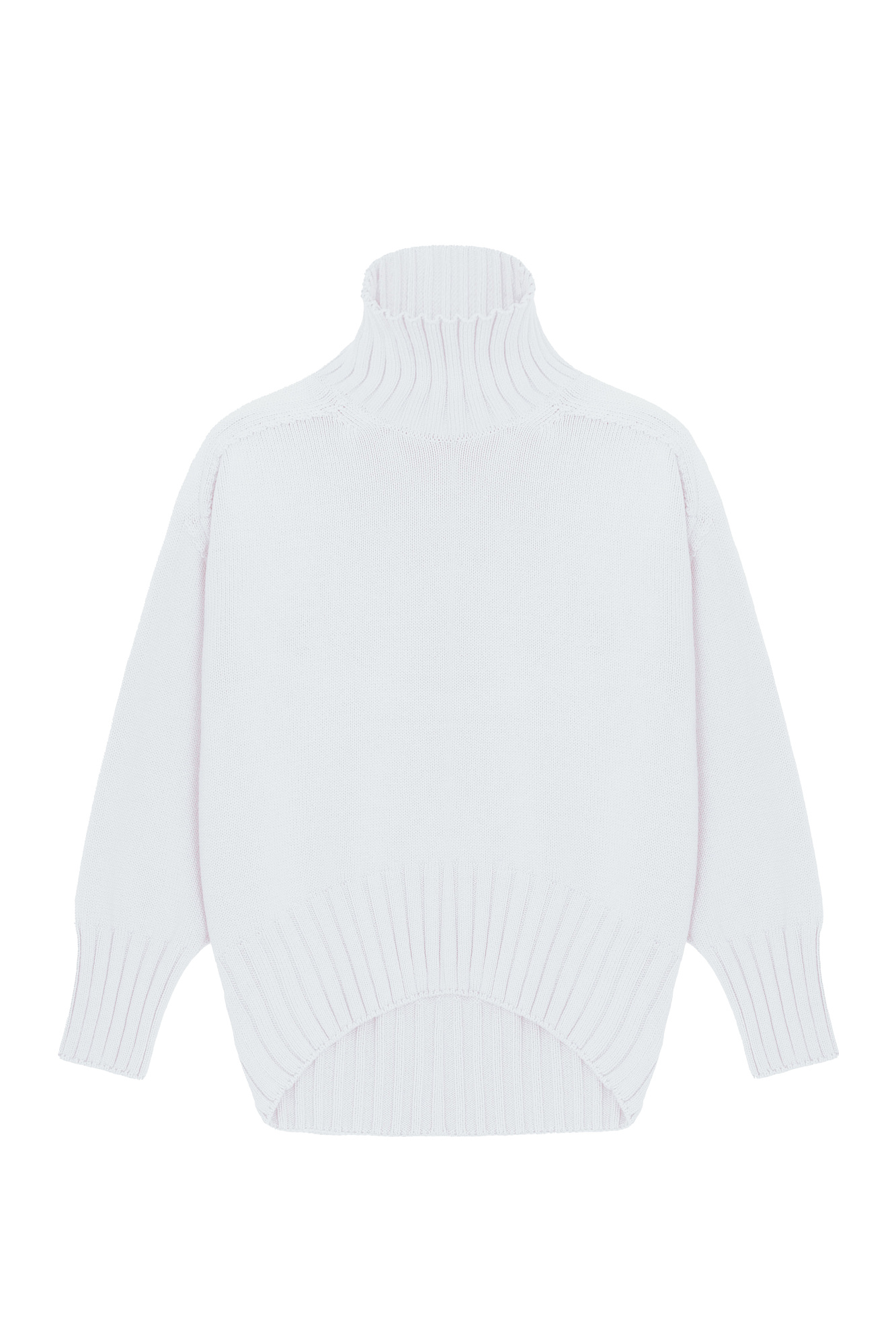 Объемный джемпер крупной вязки из 100% хлопка с высоким горлом. Манжеты и низ изделия в рубчик.