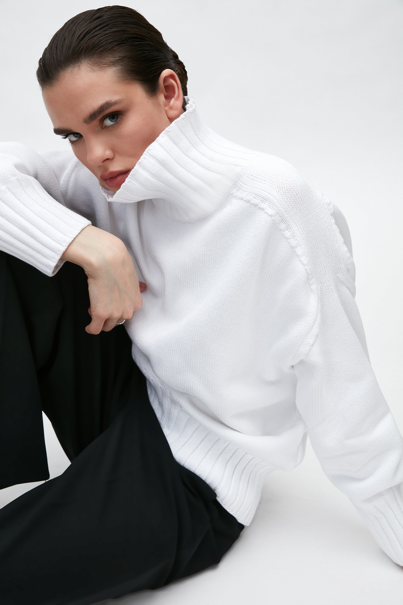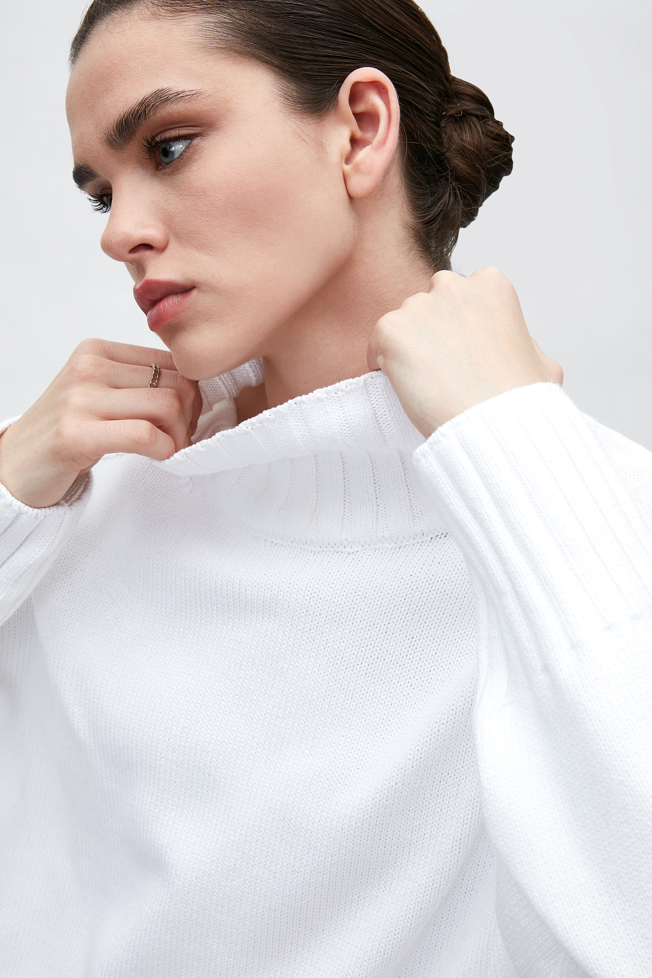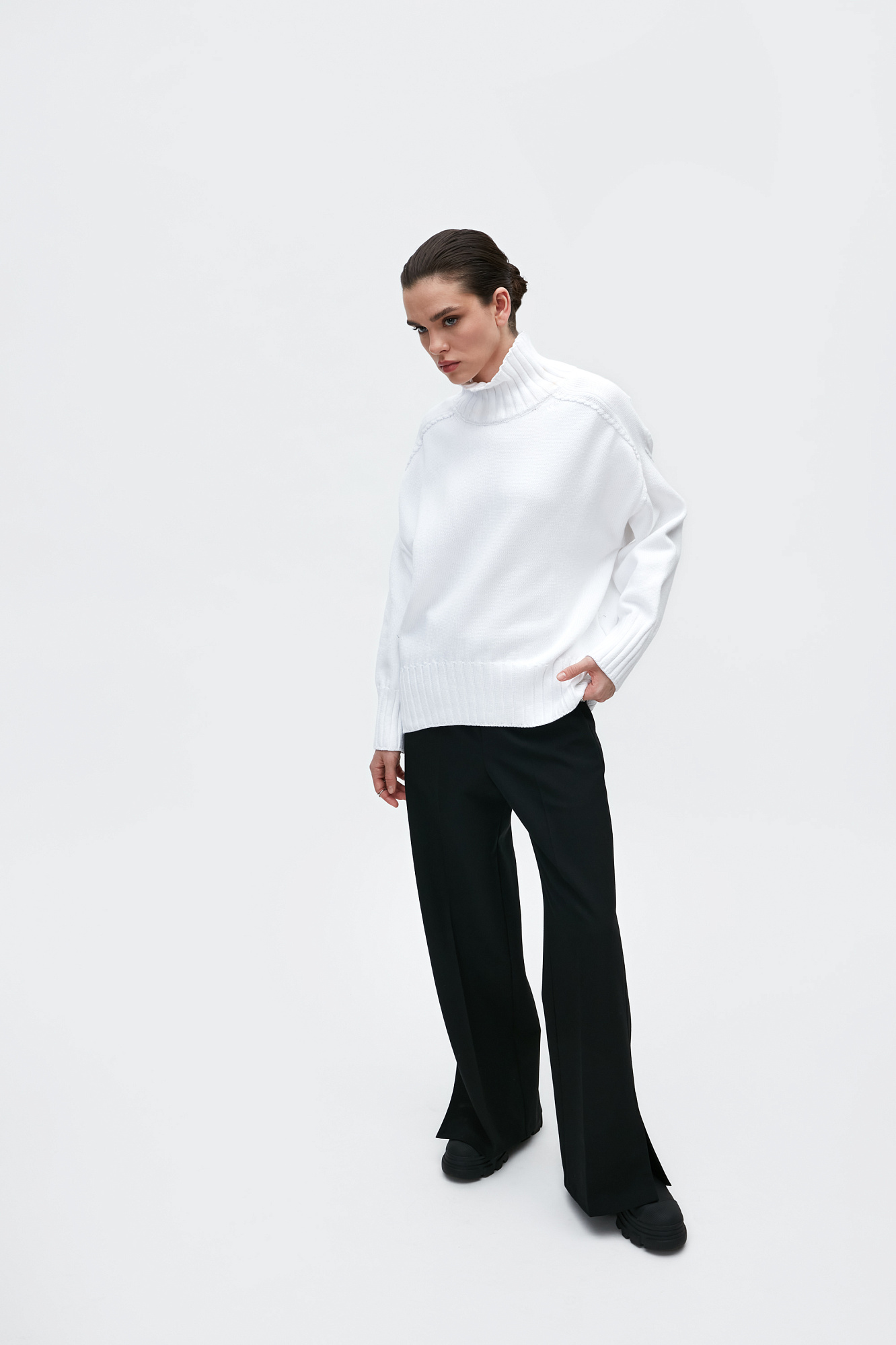 Объемный джемпер крупной вязки из 100% хлопка с высоким горлом. Манжеты и низ изделия в рубчик.