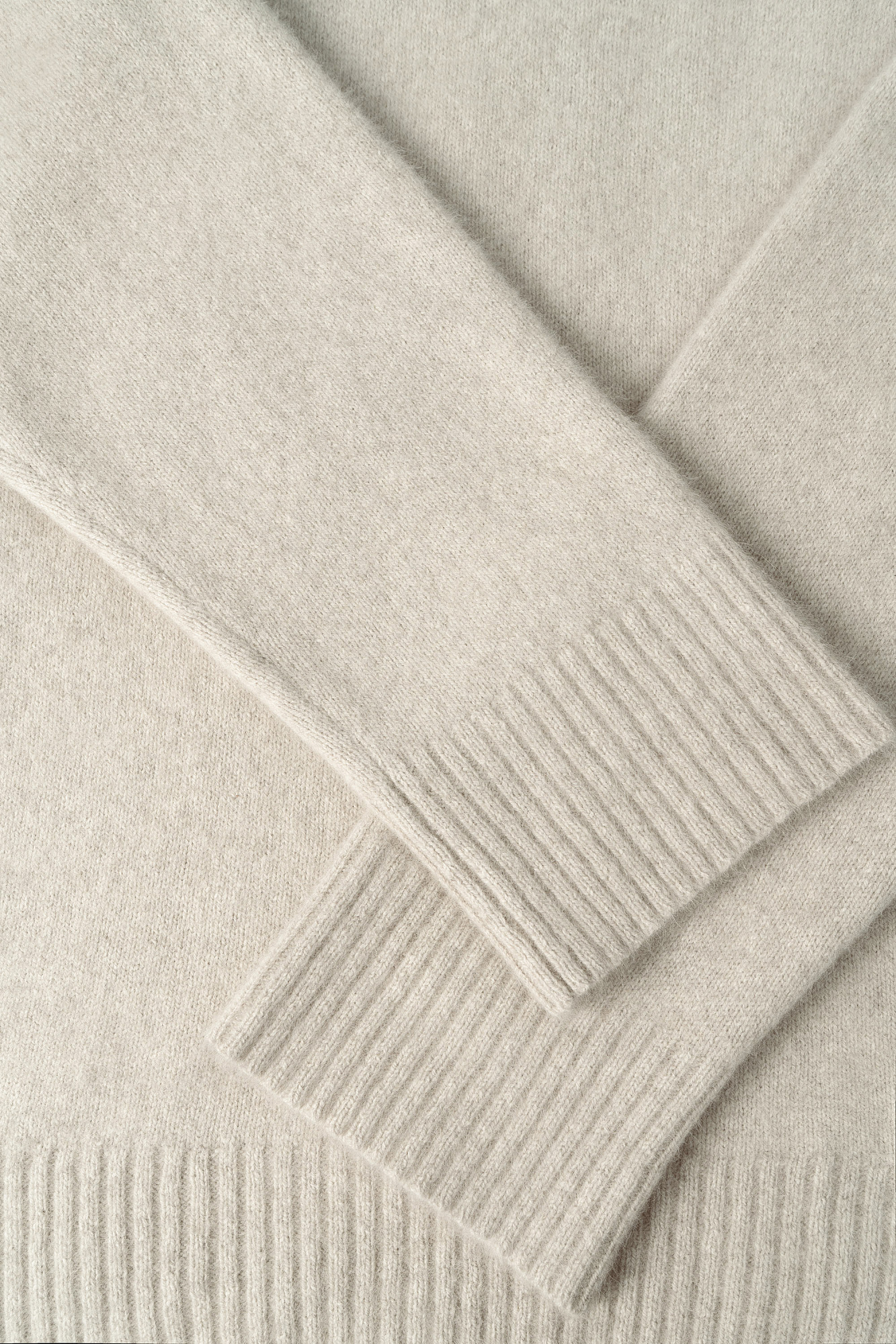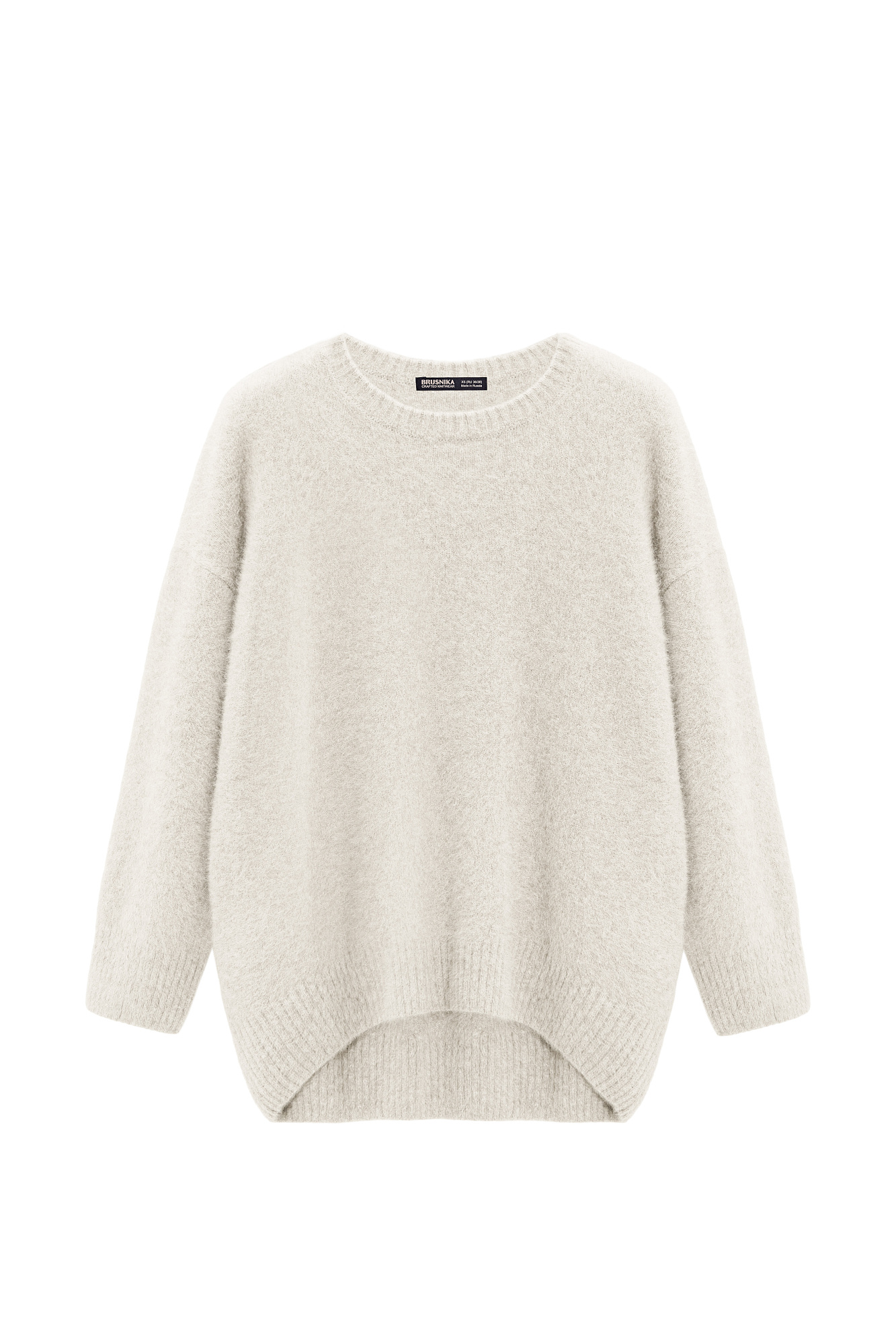 Трикотажный джемпер прямого силуэта. Содержание в пряже 70% натурального пуха лисы делает джемпер теплым и в тоже время очень легким. Модель со спущенным плечом, края изделия в рубчик.