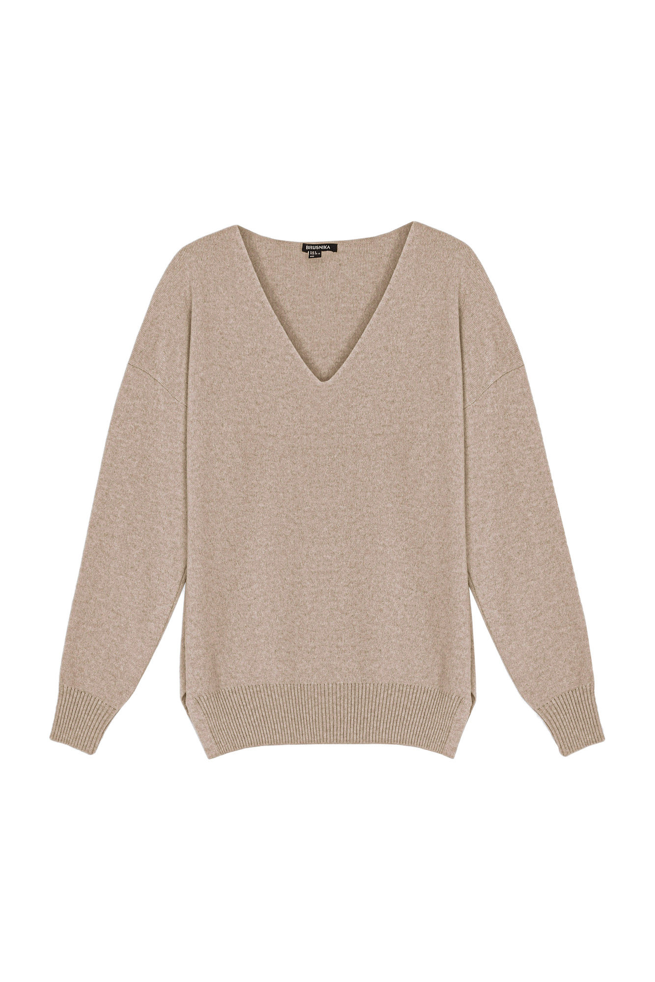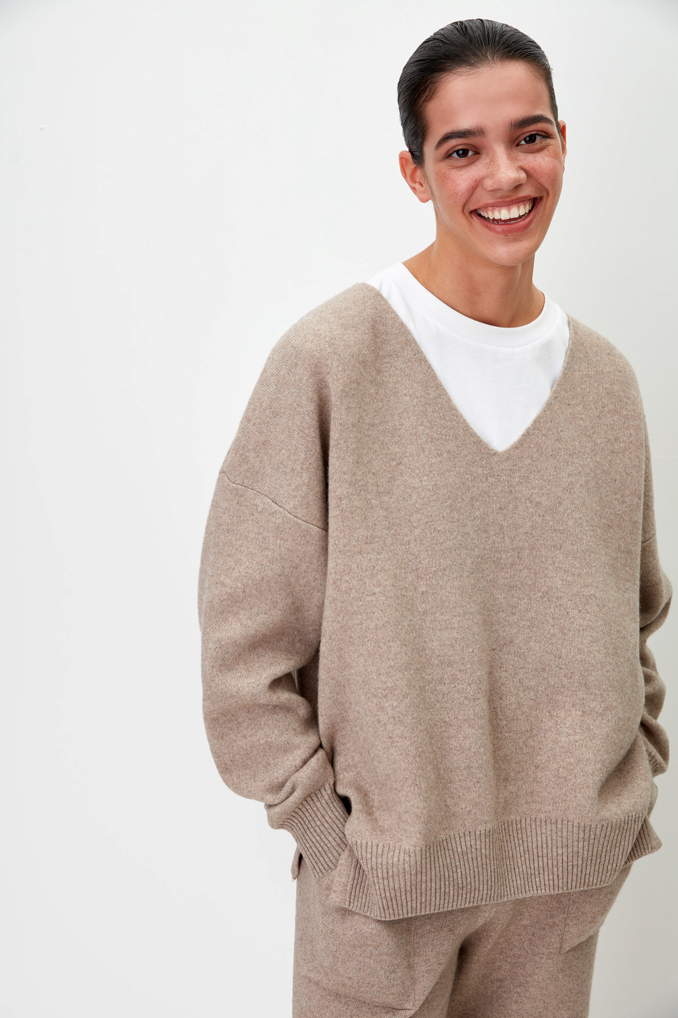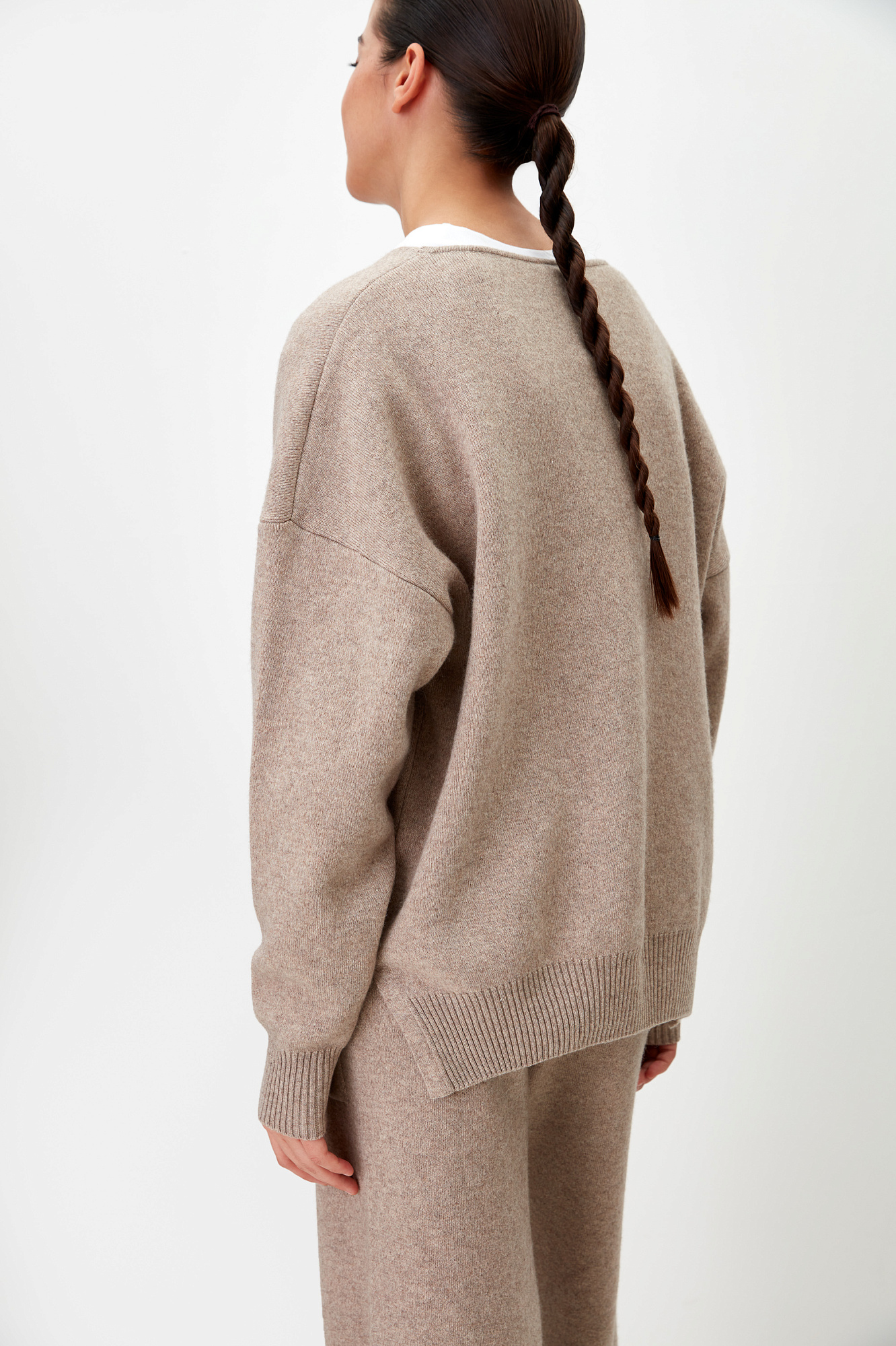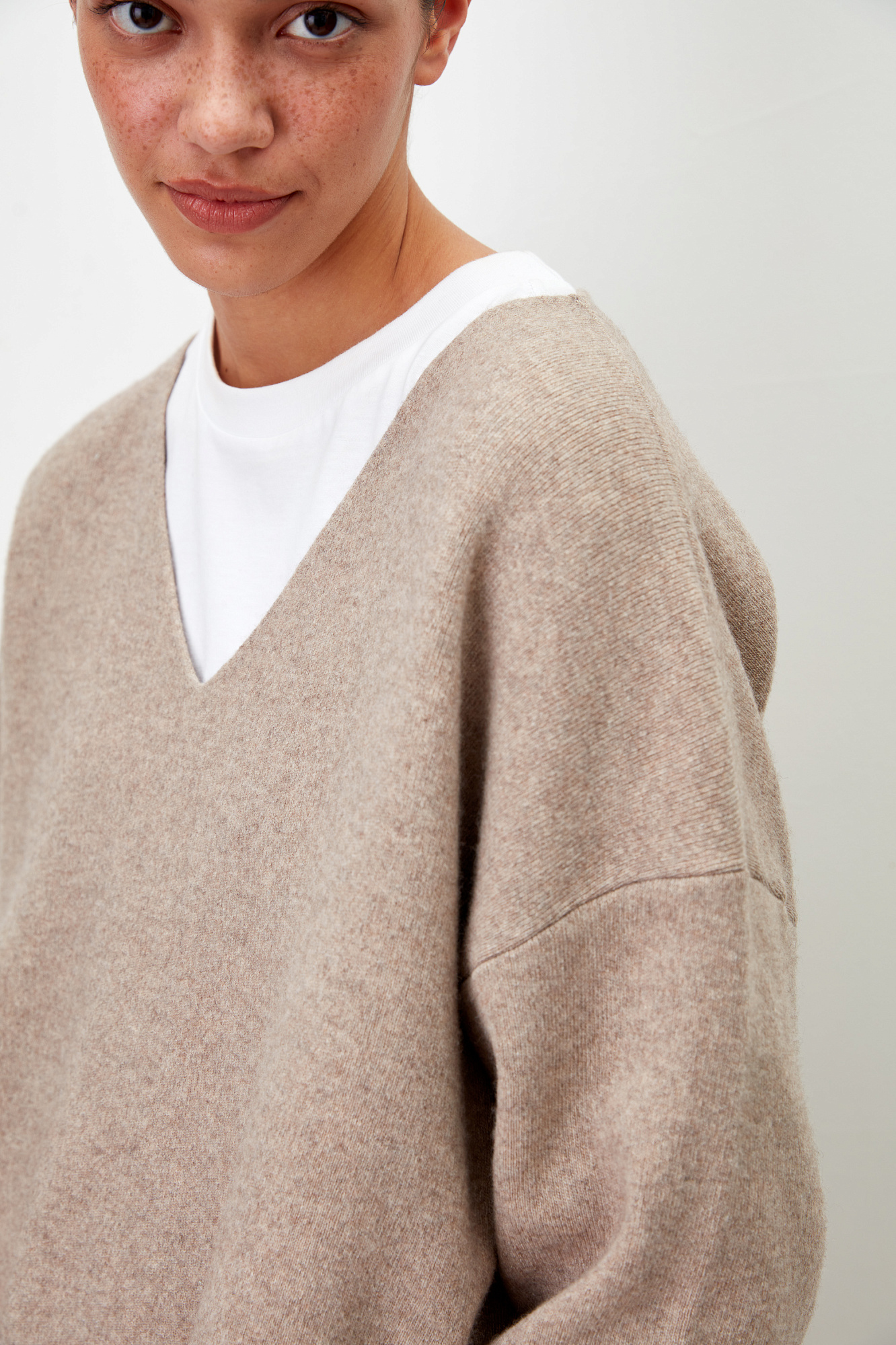 Кашемировый джемпер с V-образным вырезом и спущенным плечом.