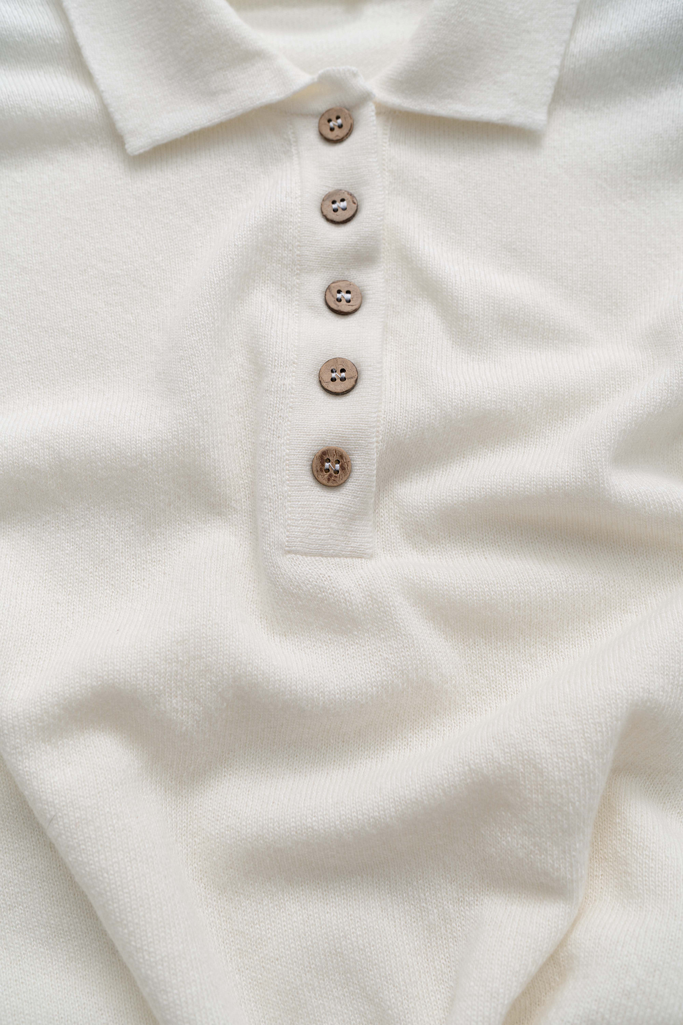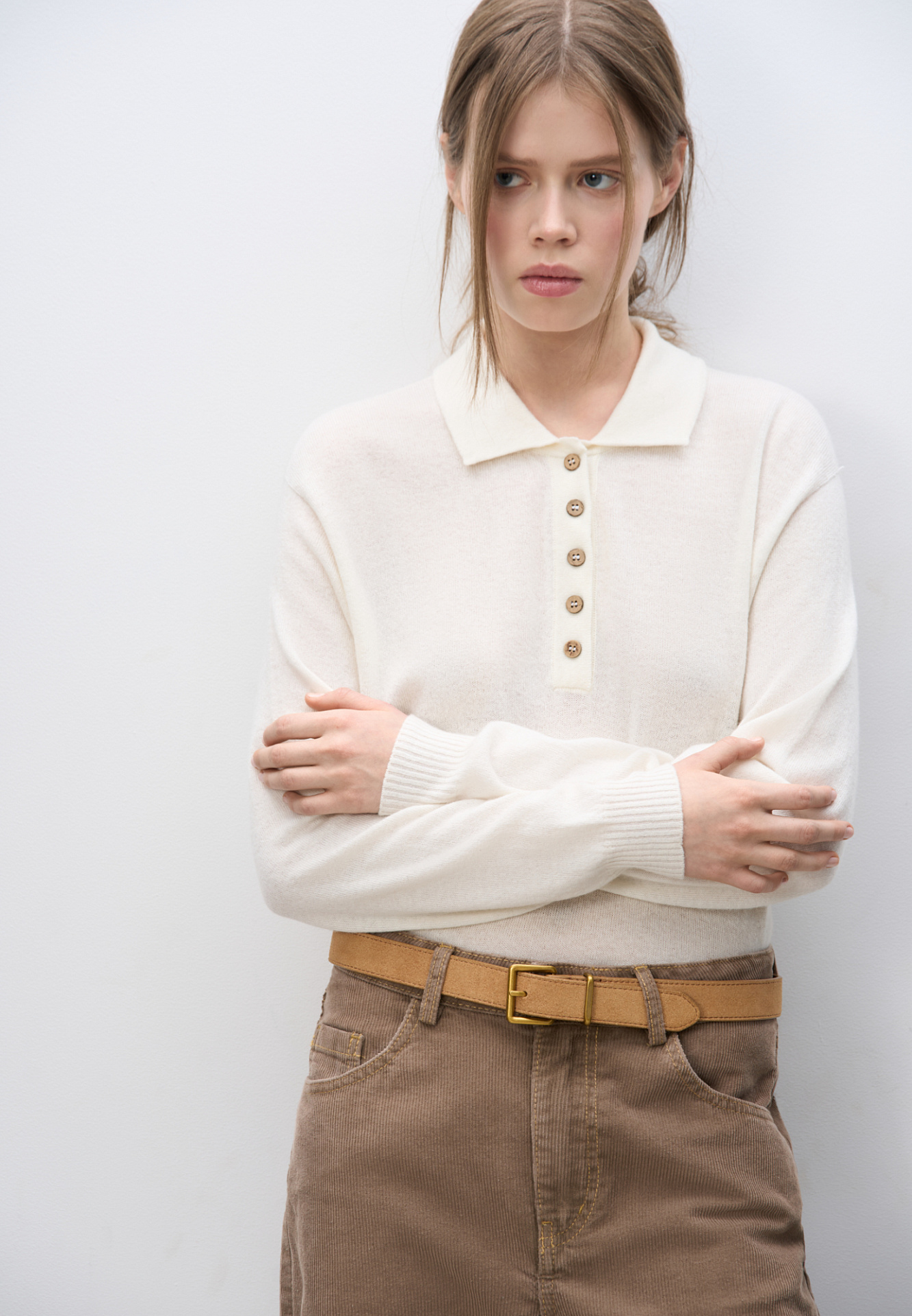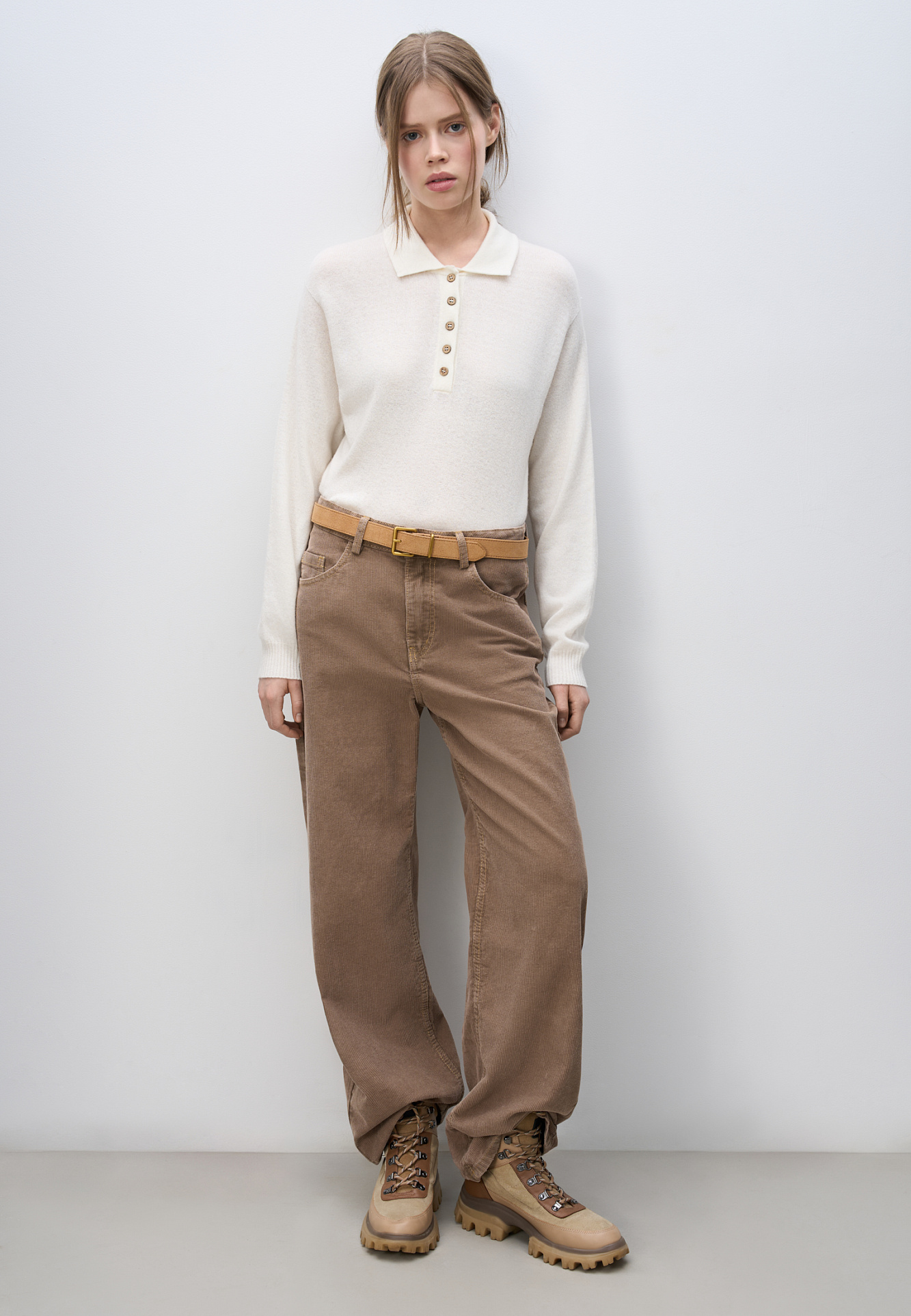 Трикотажный джемпер из кашемира и шерсти. Модель прямого силуэта со спущенной линией плеча и воротником поло на пуговицах. Манжеты рукавов и низ изделия выполнен в рубчик.