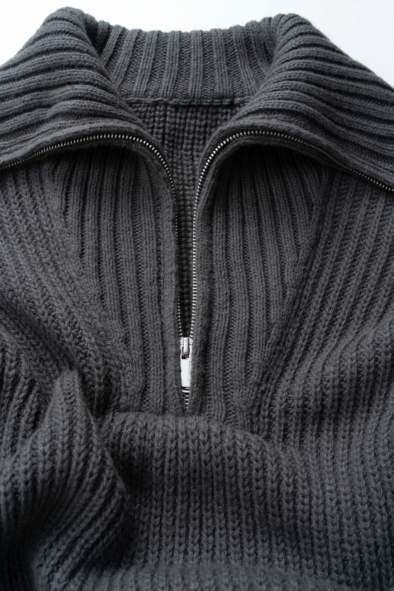 Трикотажный джемпер с шерстью альпака. Модель свободного силуэта со спущенной линией плеча и высоким воротом. Застежка на молнию, края изделия в рубчик.