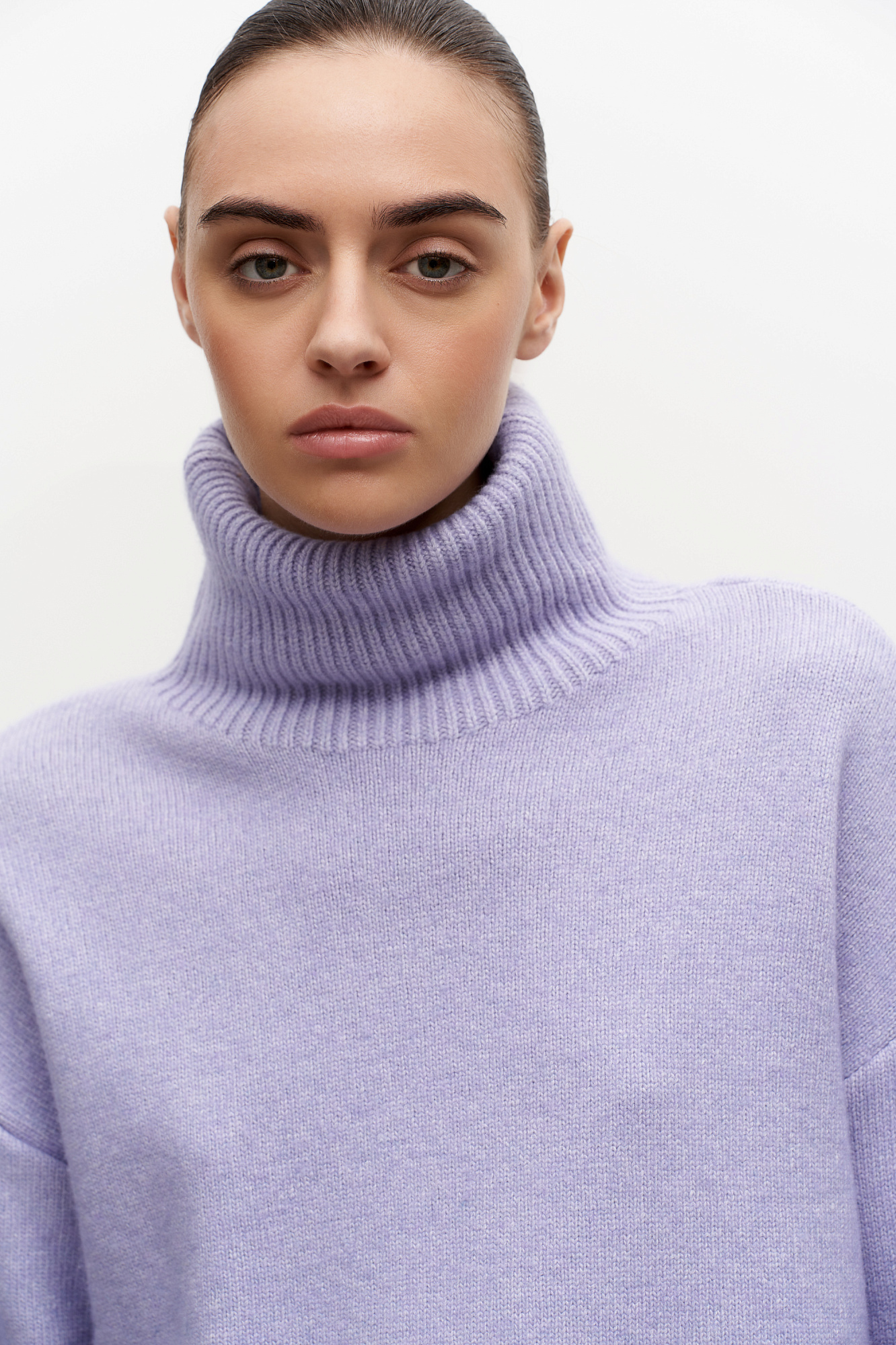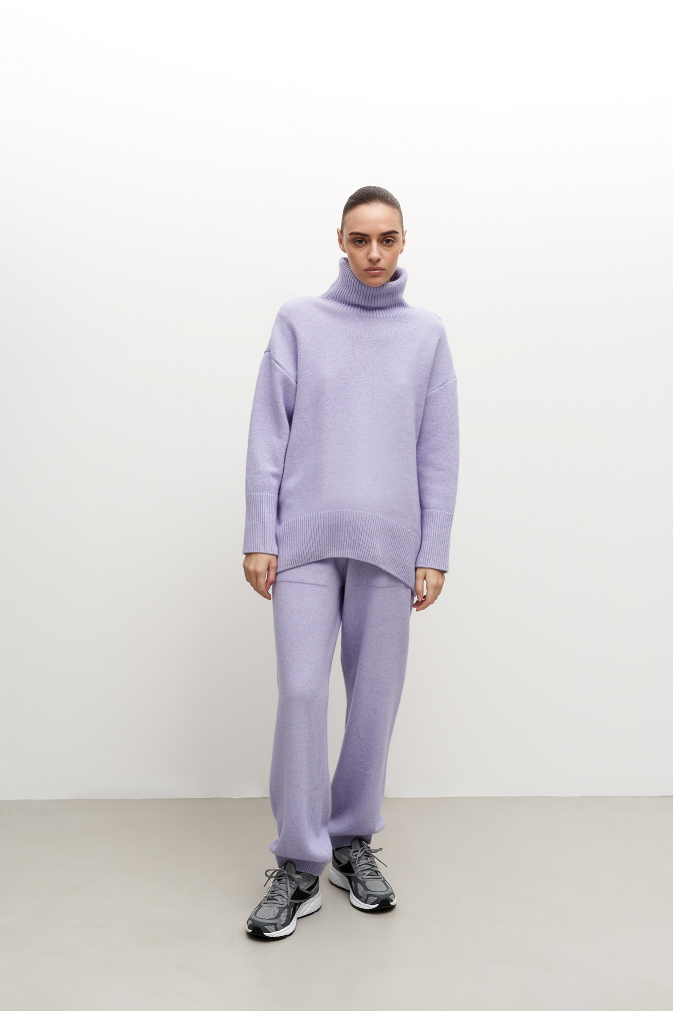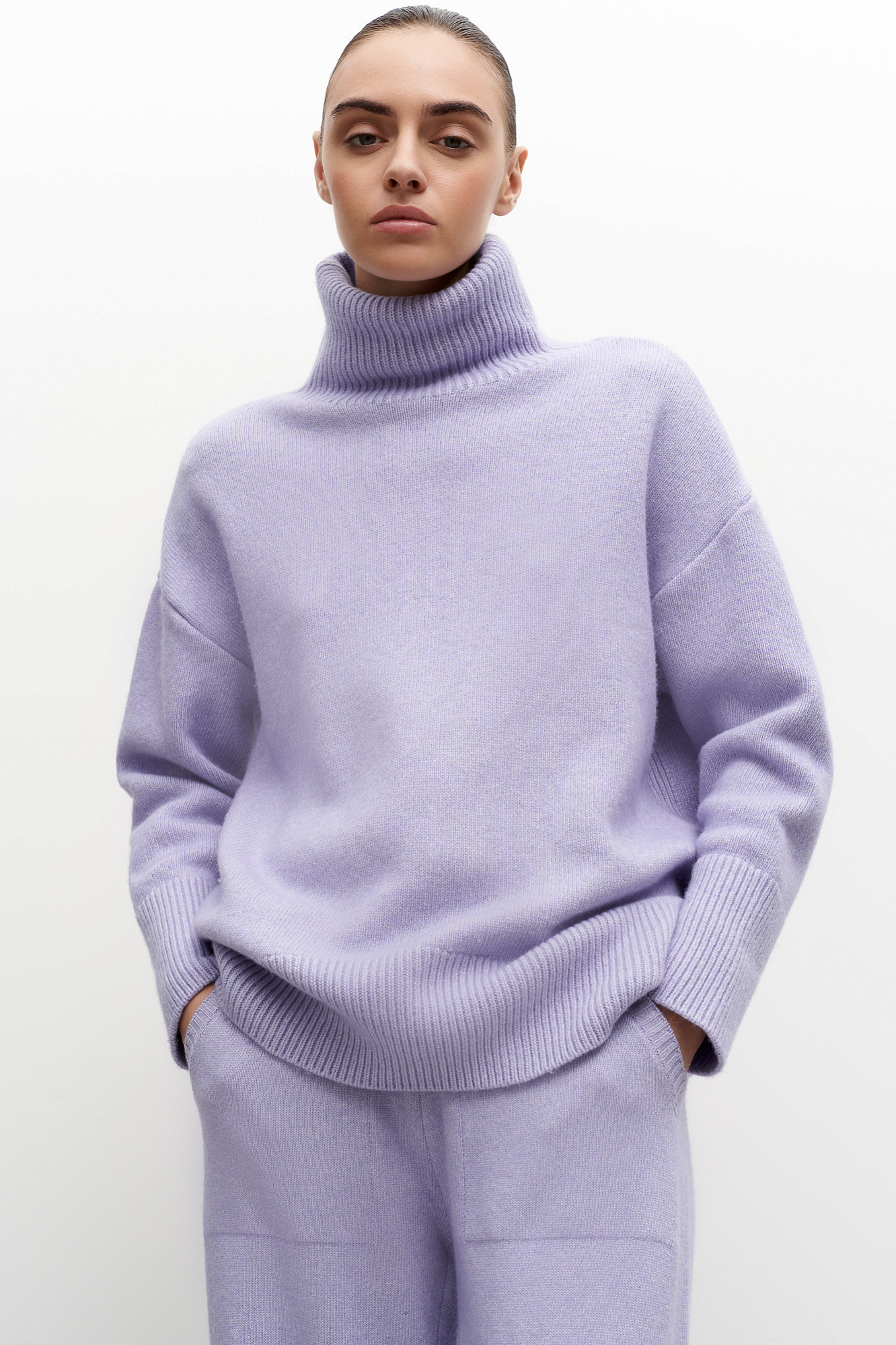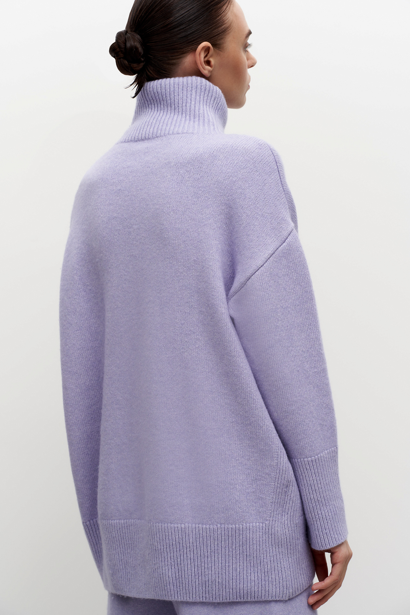 Трикотажный джемпер из мягкой шерсти с добавлением кашемира. Высокий ворот, заниженная линия плеч, удлиненная спинка. Края изделия сделаны в широкий рубчик. Можно дополнить комплектными брюками.