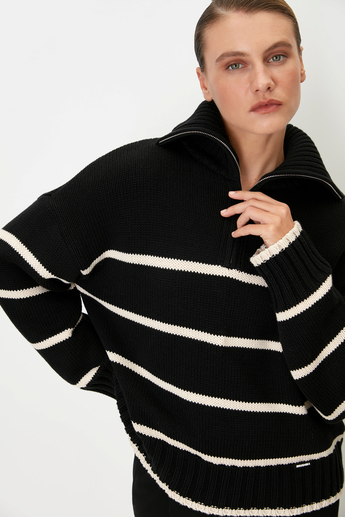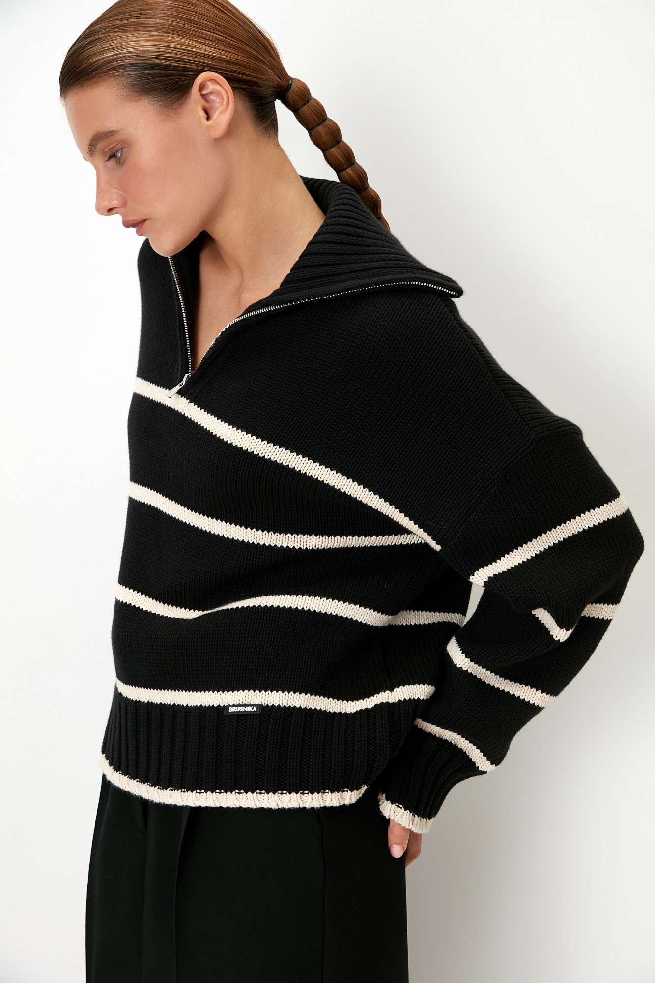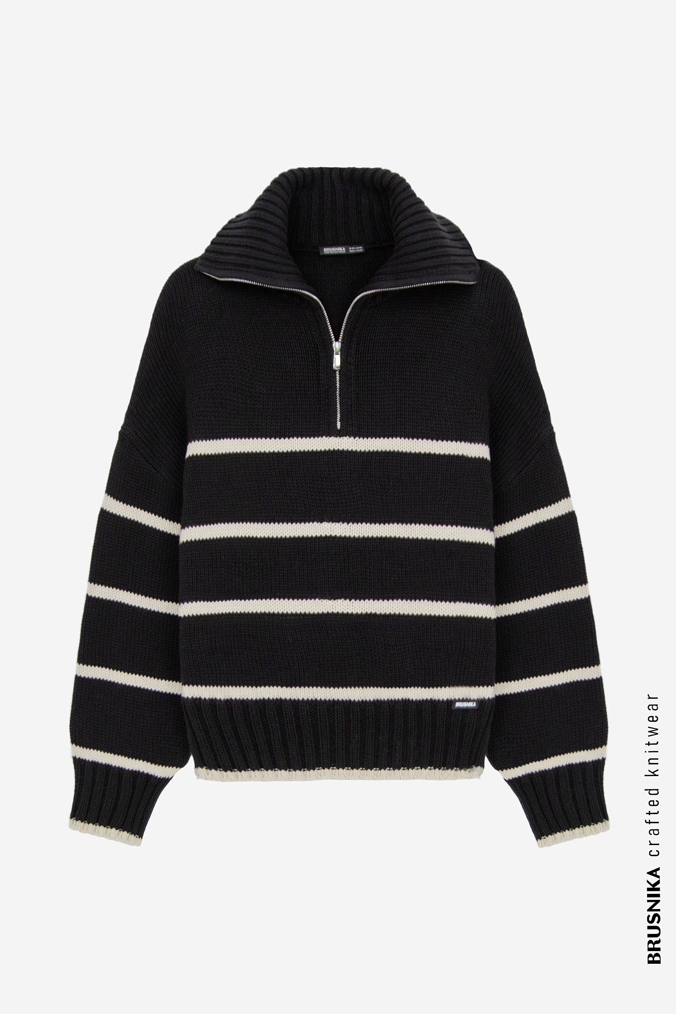 Трикотажный джемпер в полоску из 100% хлопка. Воротник-стойка на молнии. Низ изделия с брендированным ярлыком. Дополнить образ можно длинной юбкой.