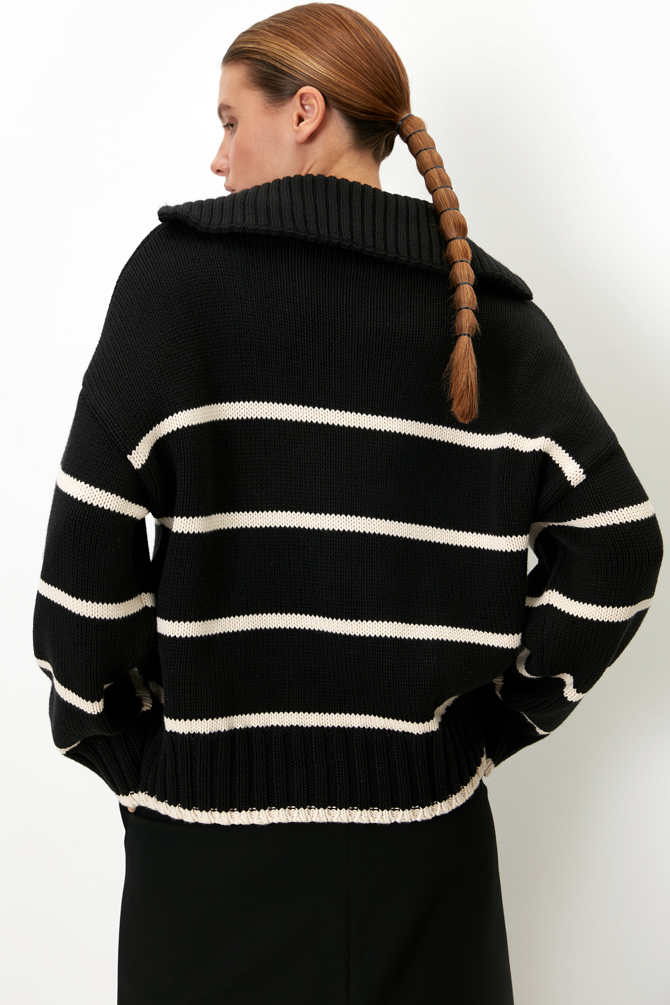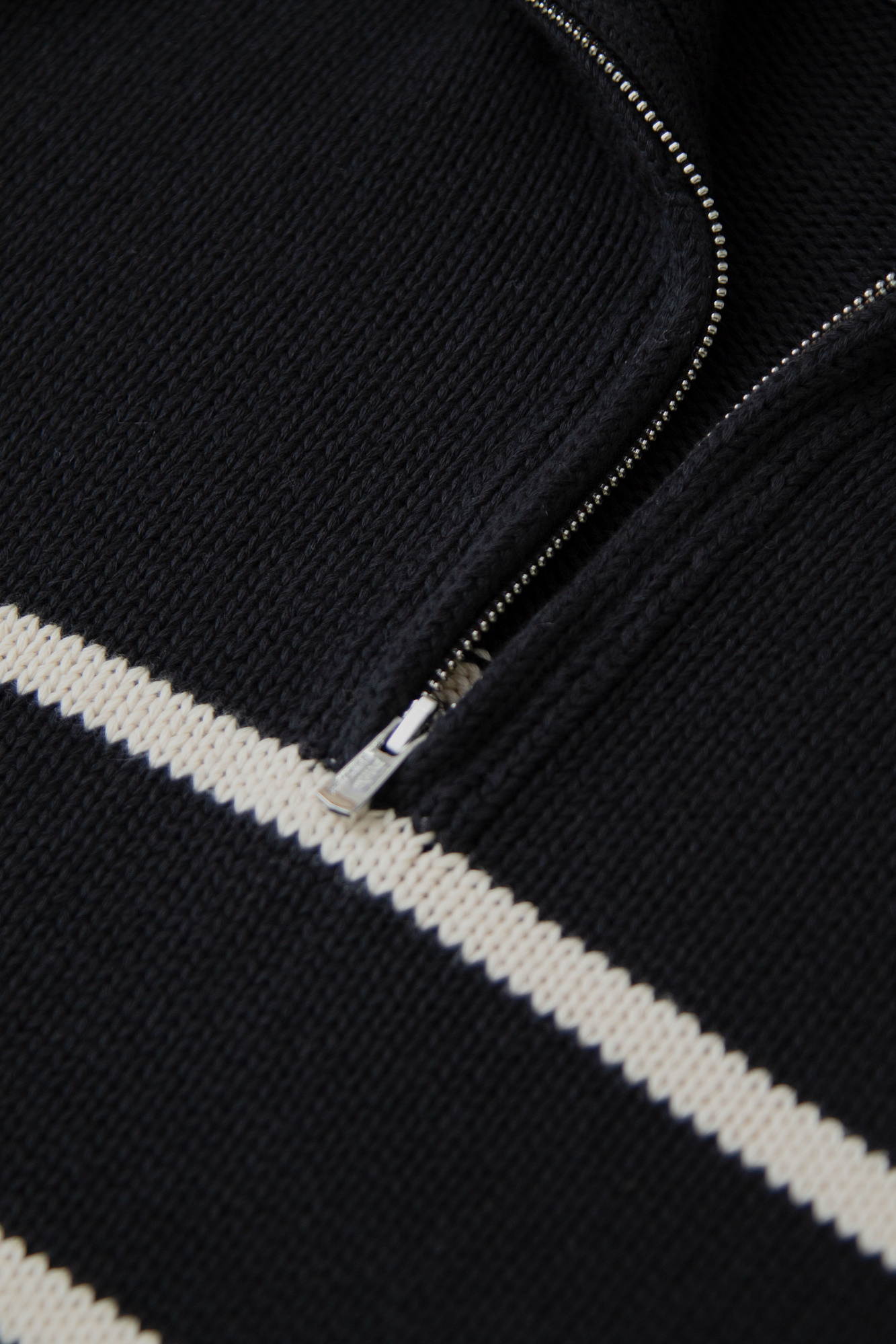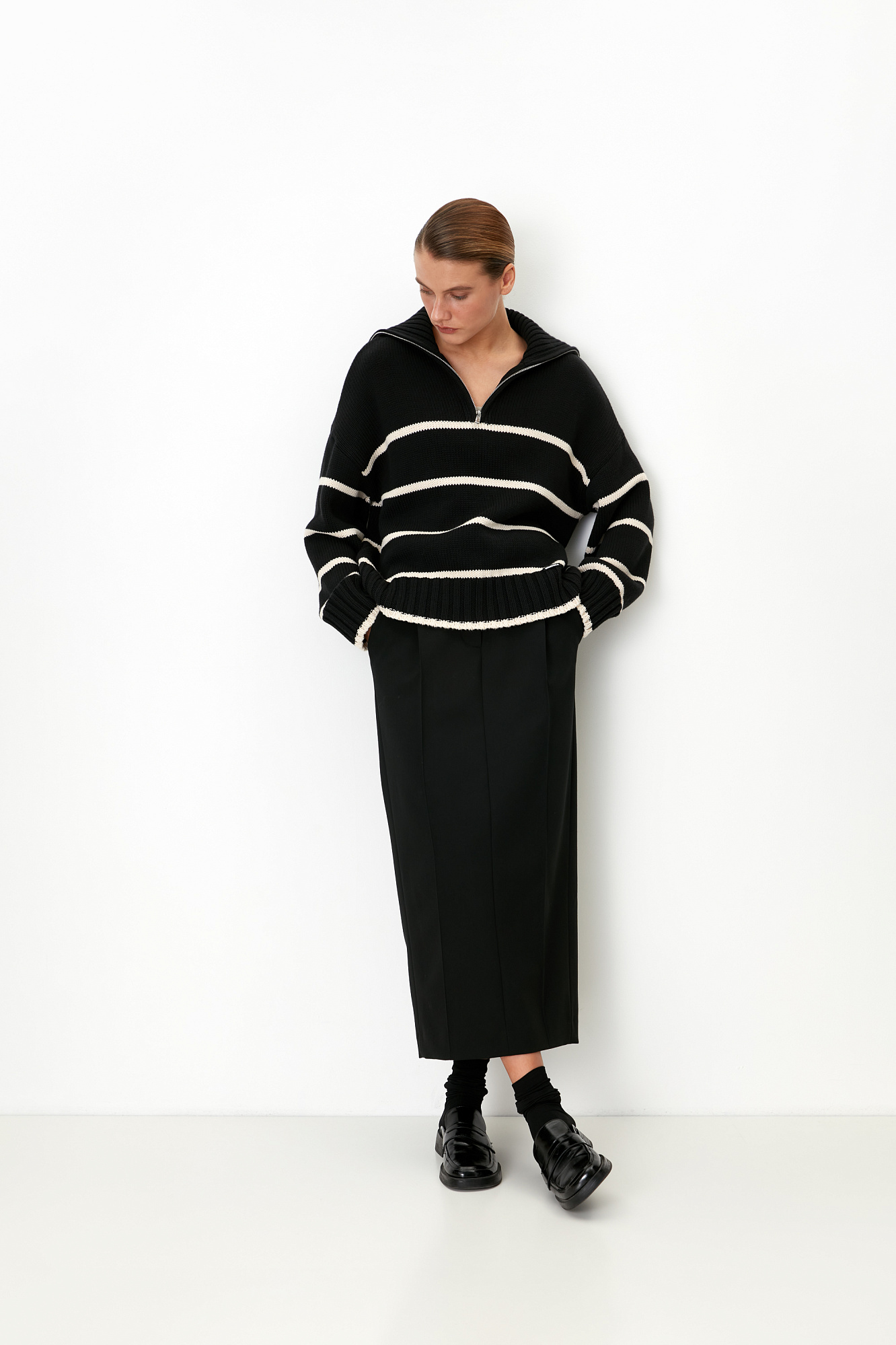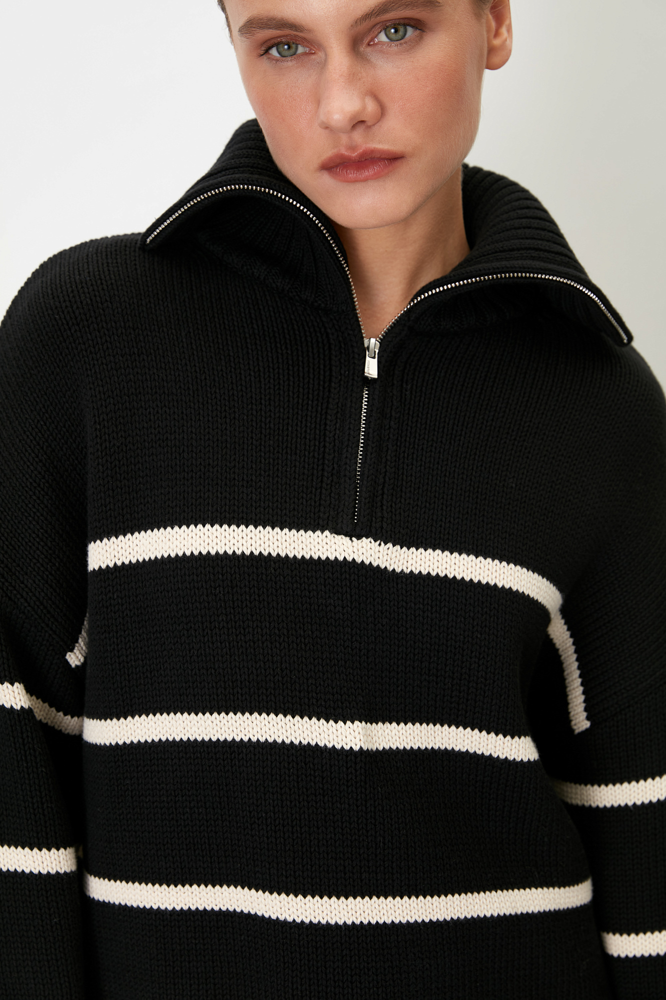 Трикотажный джемпер в полоску из 100% хлопка. Воротник-стойка на молнии. Низ изделия с брендированным ярлыком. Дополнить образ можно длинной юбкой.