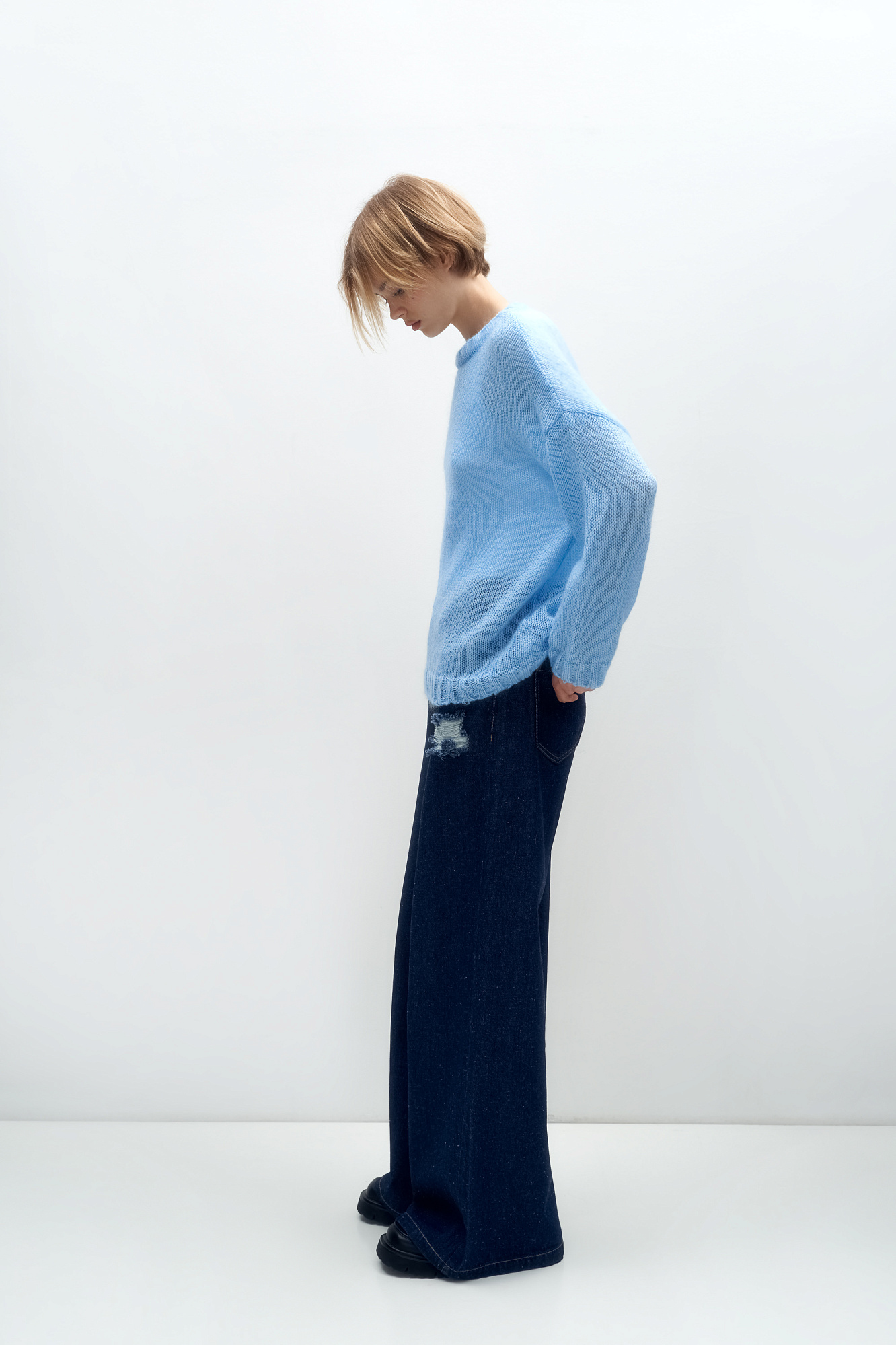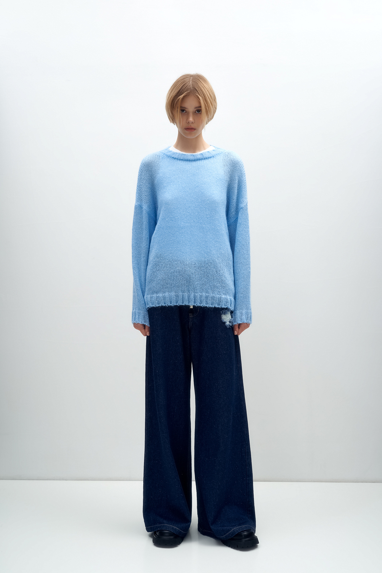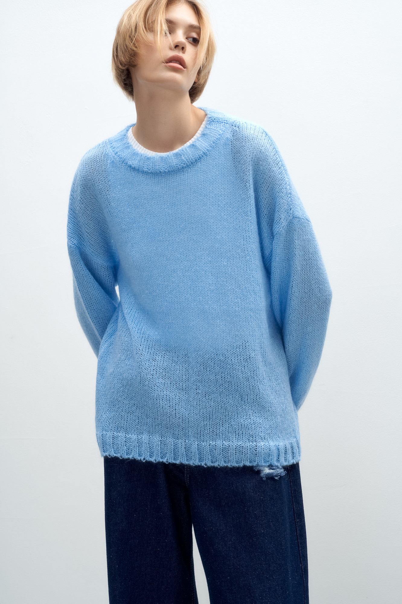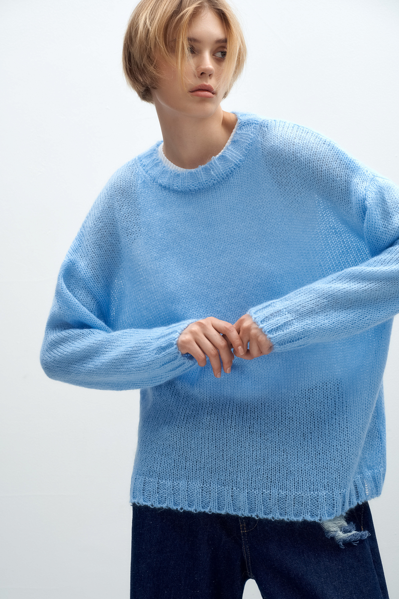 Трикотажный полупрозрачный джемпер из смесовой шерсти с добавлением мохера. Модель свободного силуэта со спущенной линией плеч и круглым вырезом горловины. Манжеты и низ изделия выполнены в широкий рубчик.