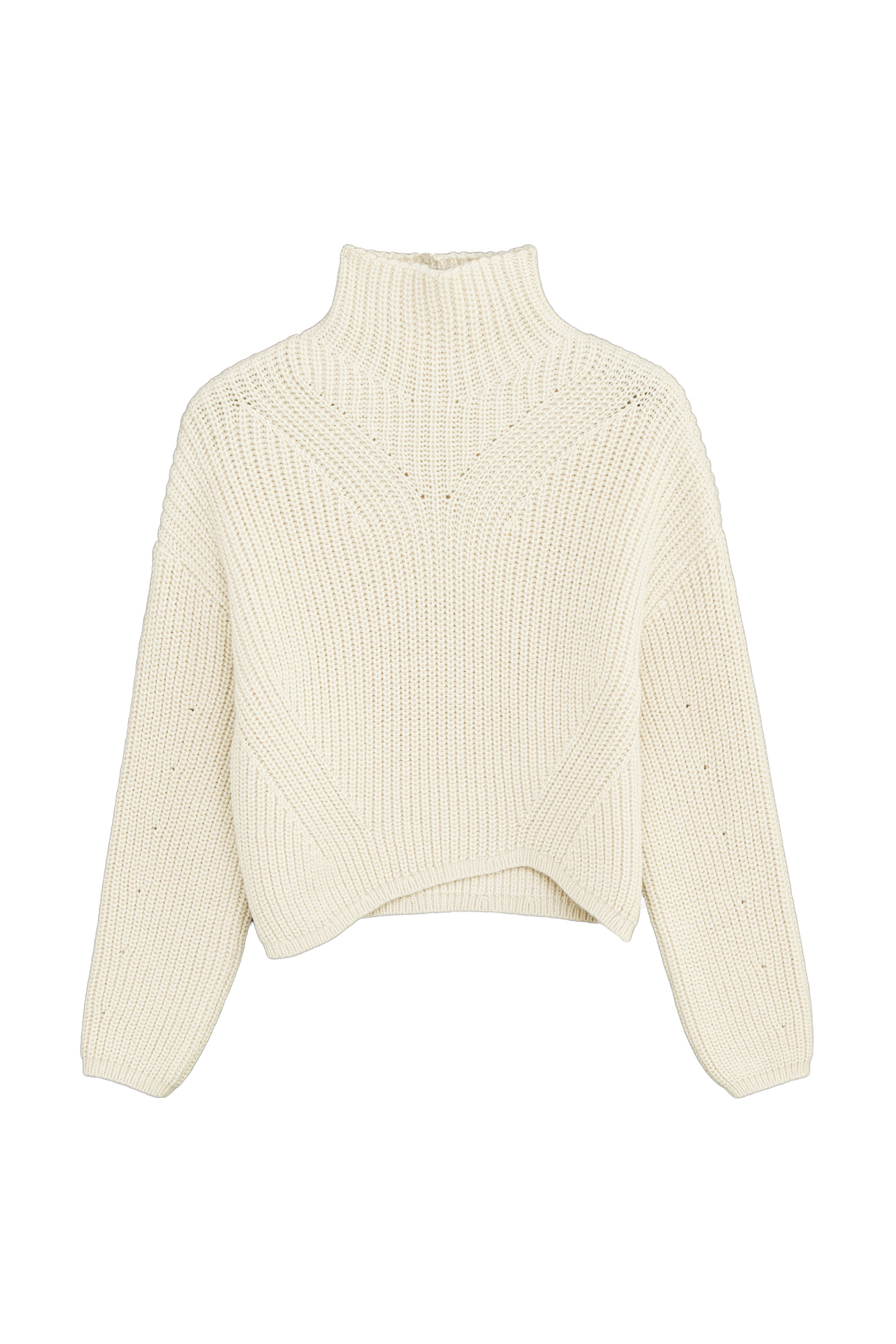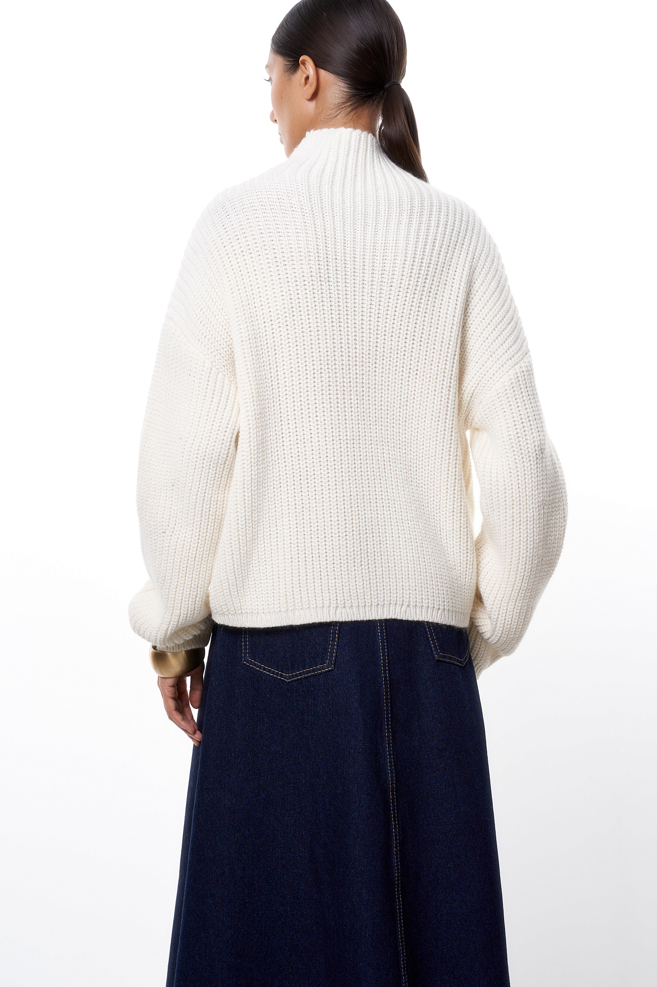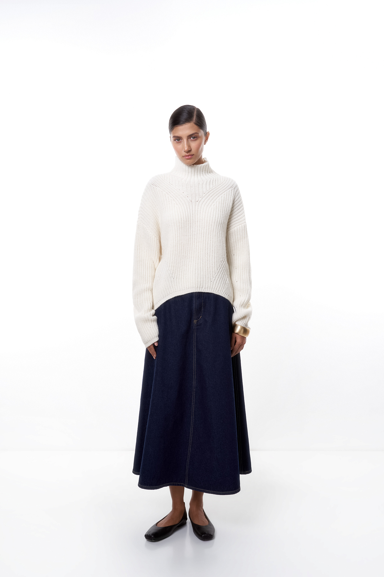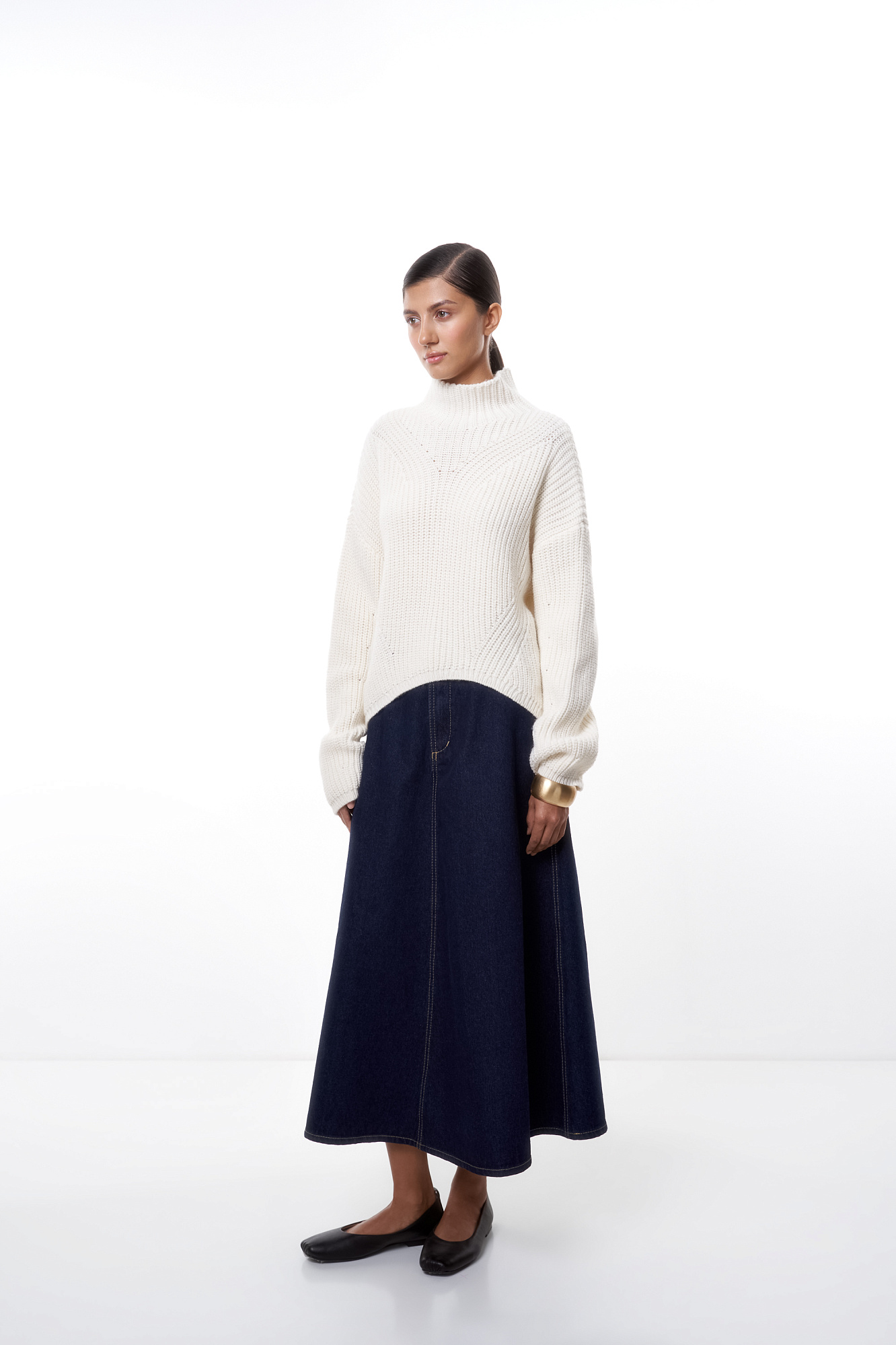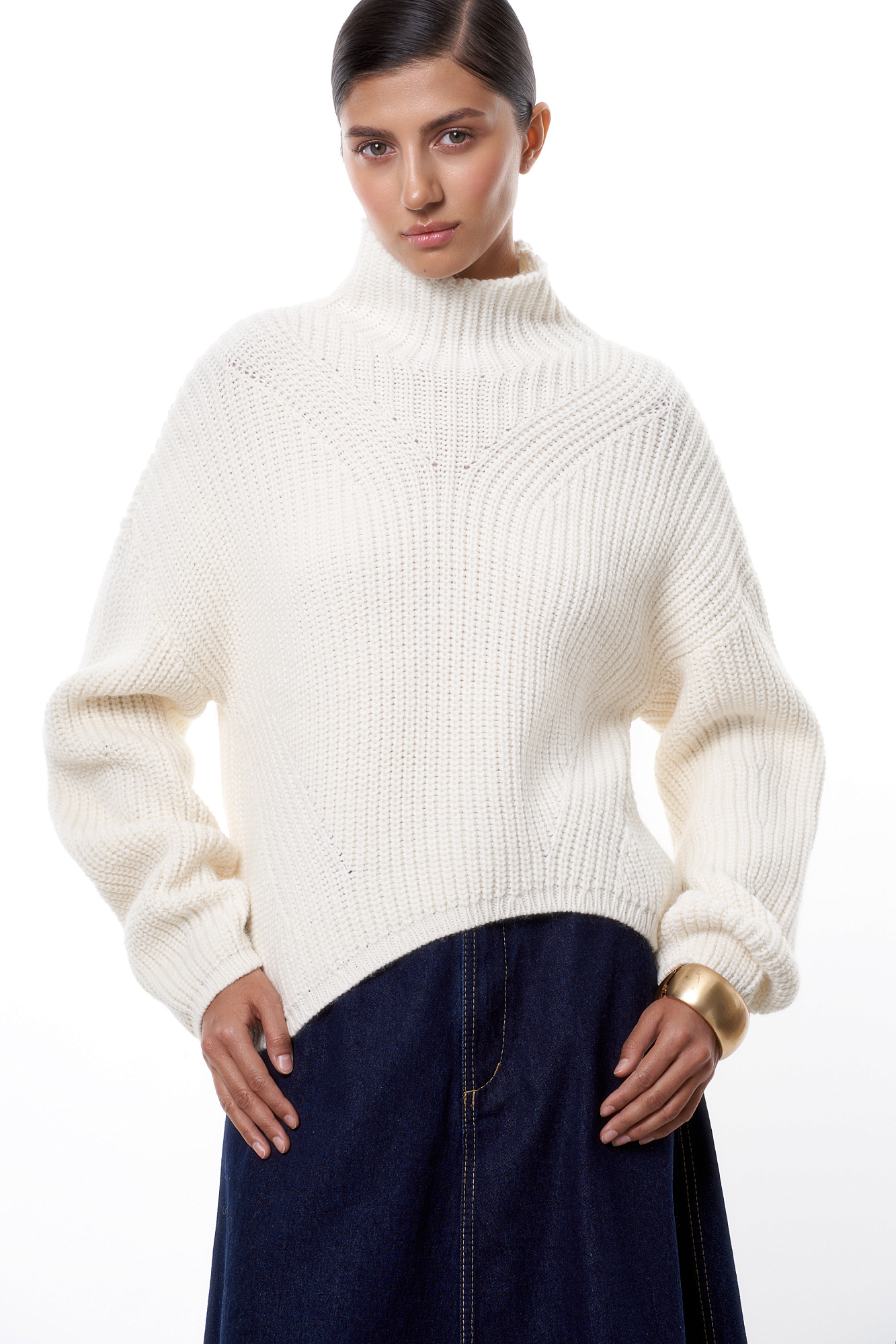 Трикотажный джемпер из шерсти Альпака с асимметричным нижним краем и декоративными дорожками. Модель свободного силуэта со спущенным плечом.