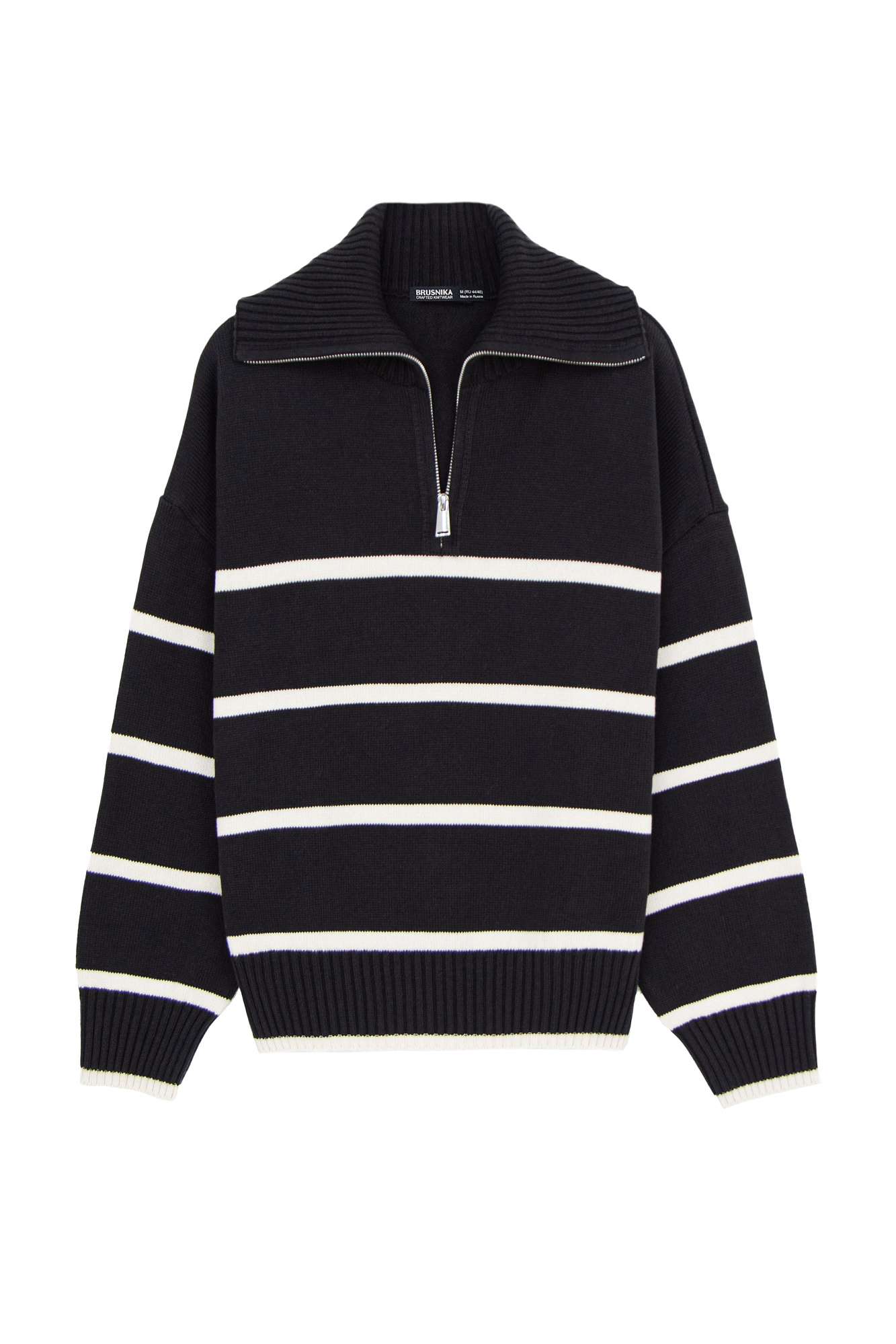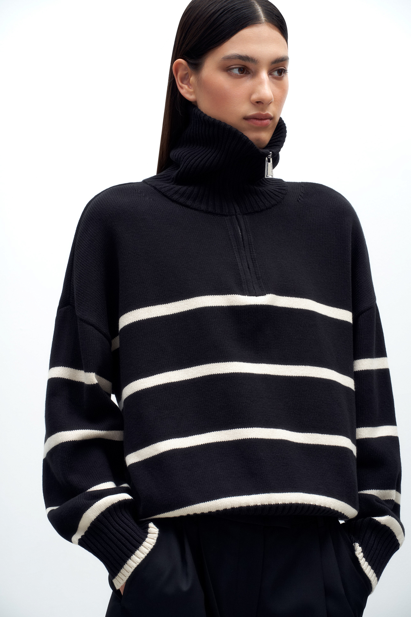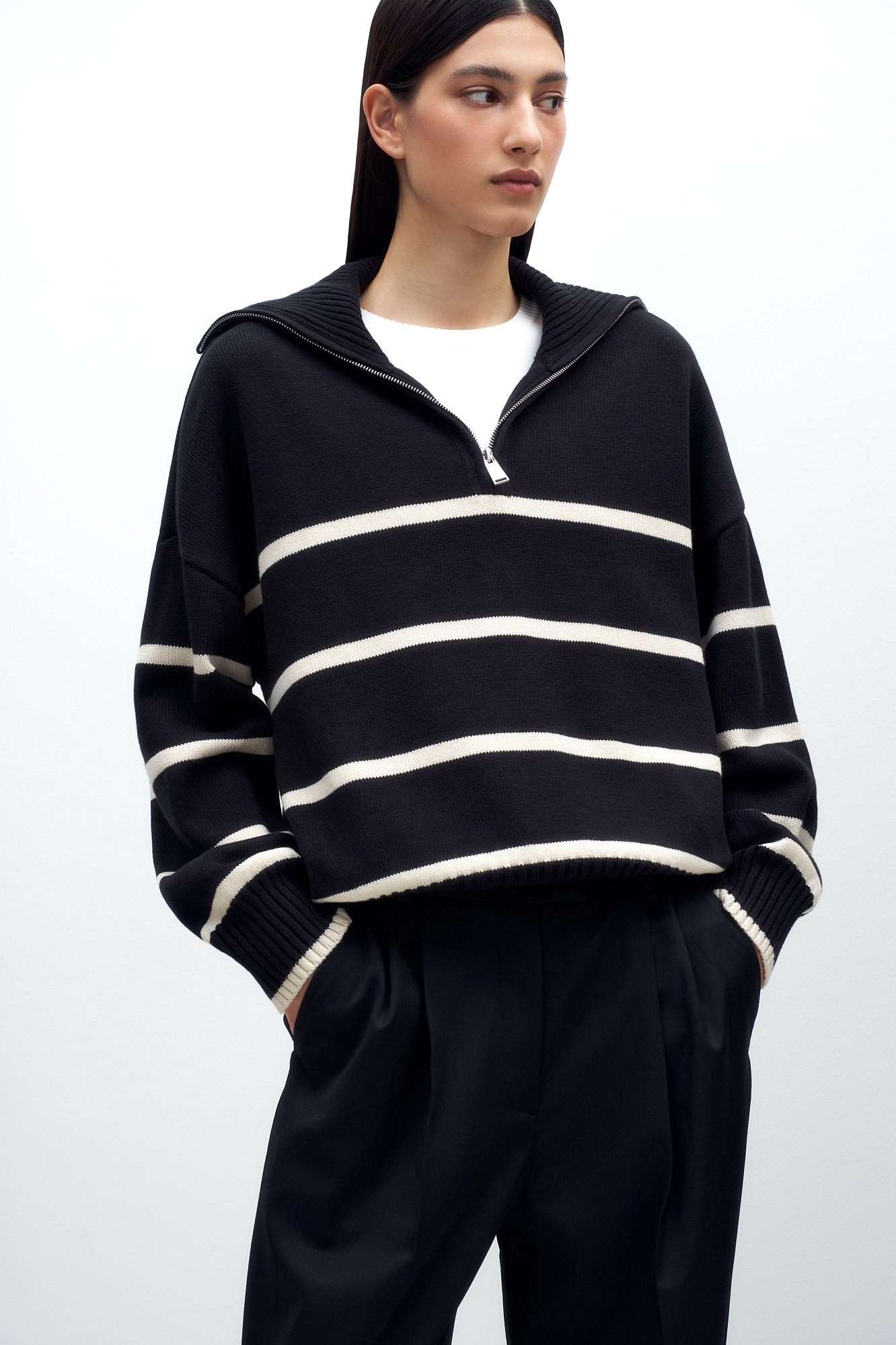Трикотажный джемпер из 100% хлопка в полоску. Модель свободного силуэта со спущенной линией плеча и воротником-стойкой на молнии.