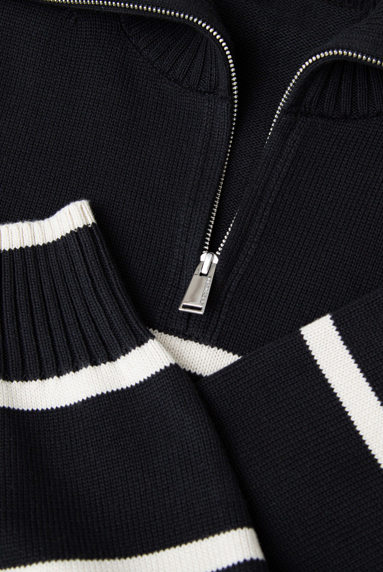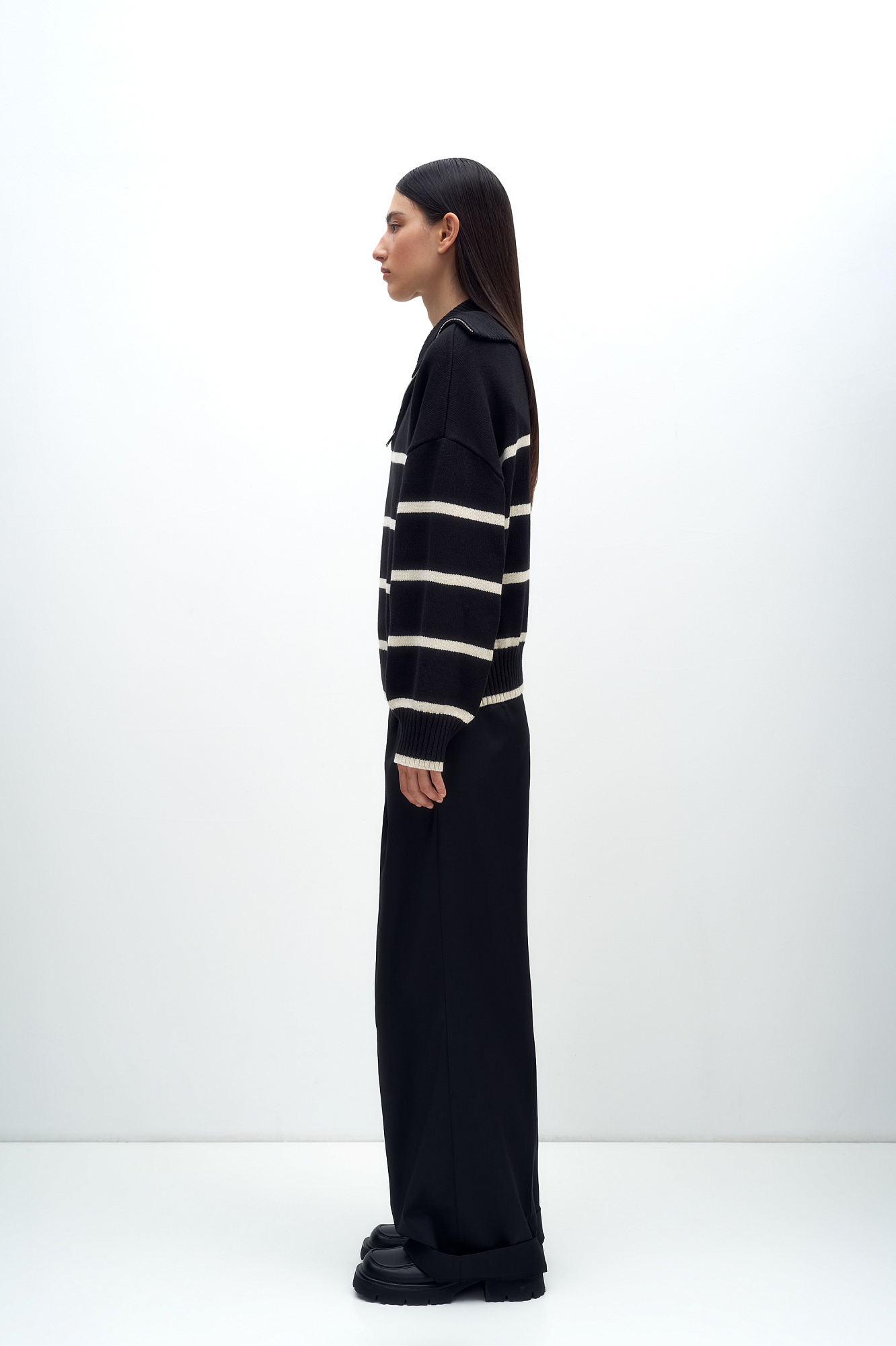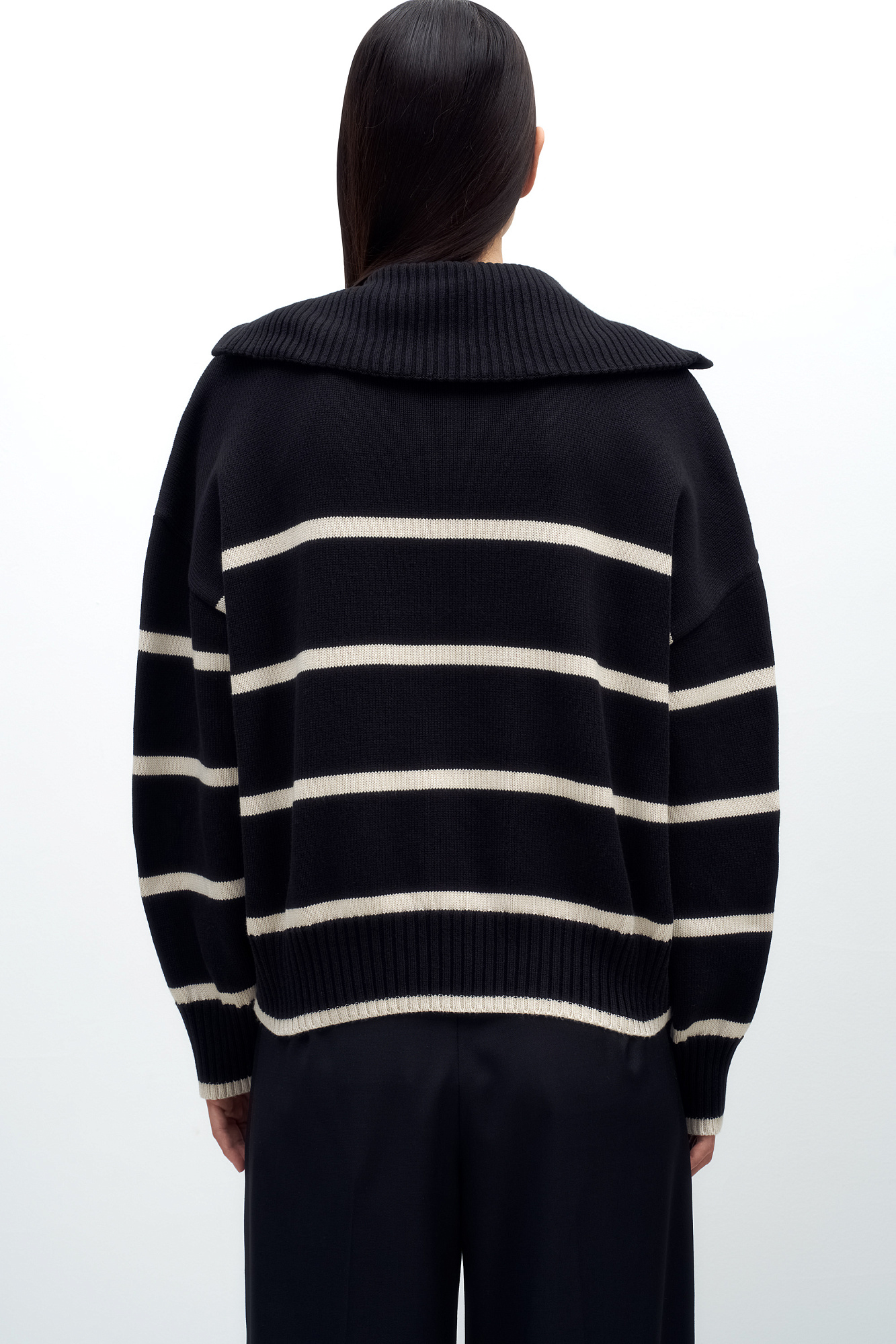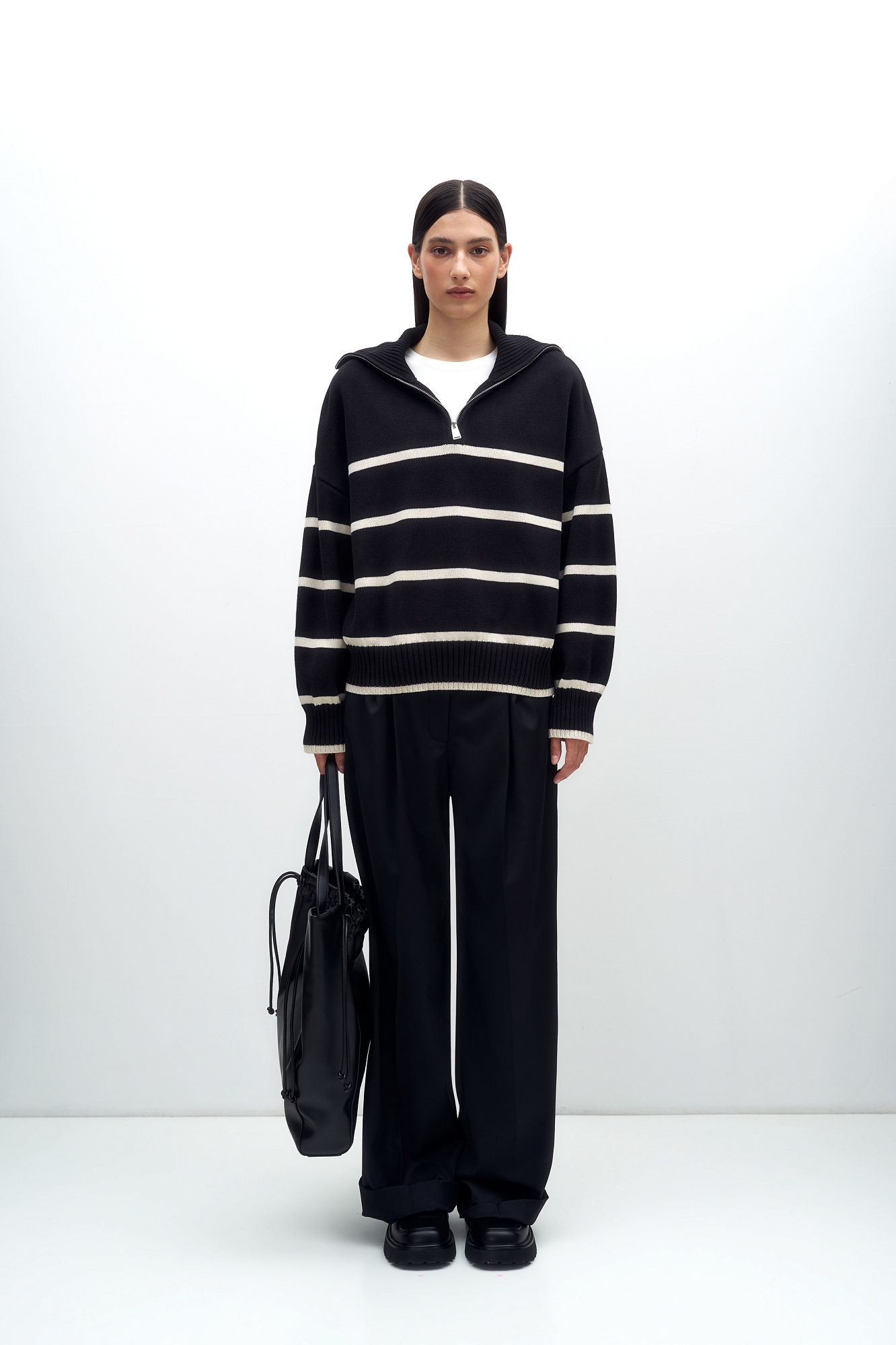 Трикотажный джемпер из 100% хлопка в полоску. Модель свободного силуэта со спущенной линией плеча и воротником-стойкой на молнии.