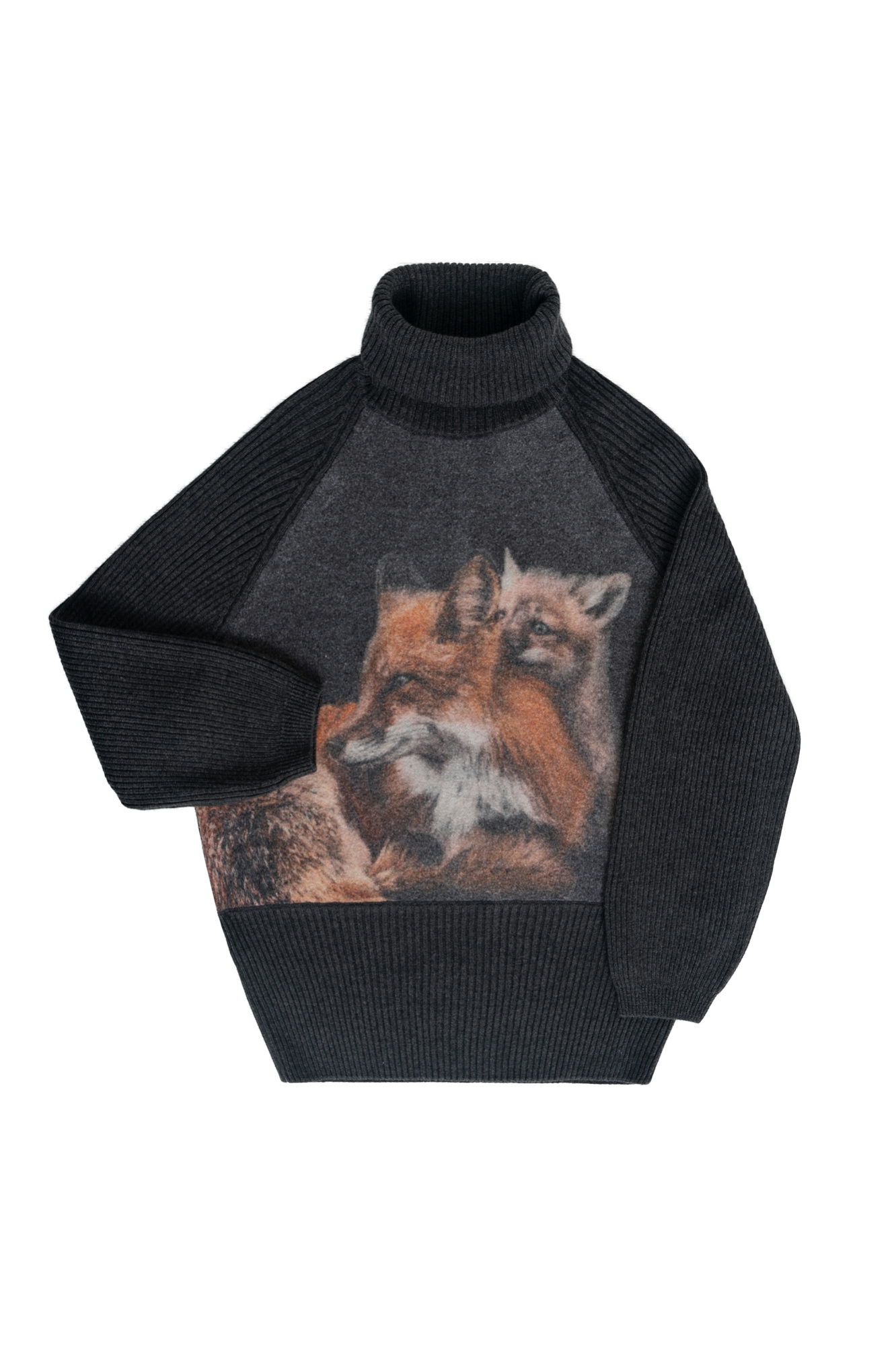 Трикотажный принтованный джемпер из смесовой шерсти. Модель свободного силуэта с высокоим воротом и спущенным плечом.