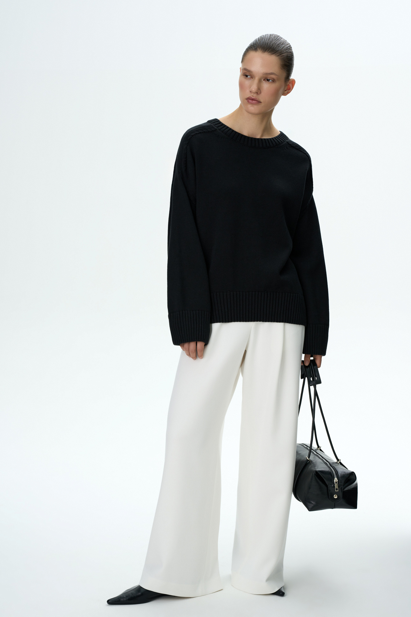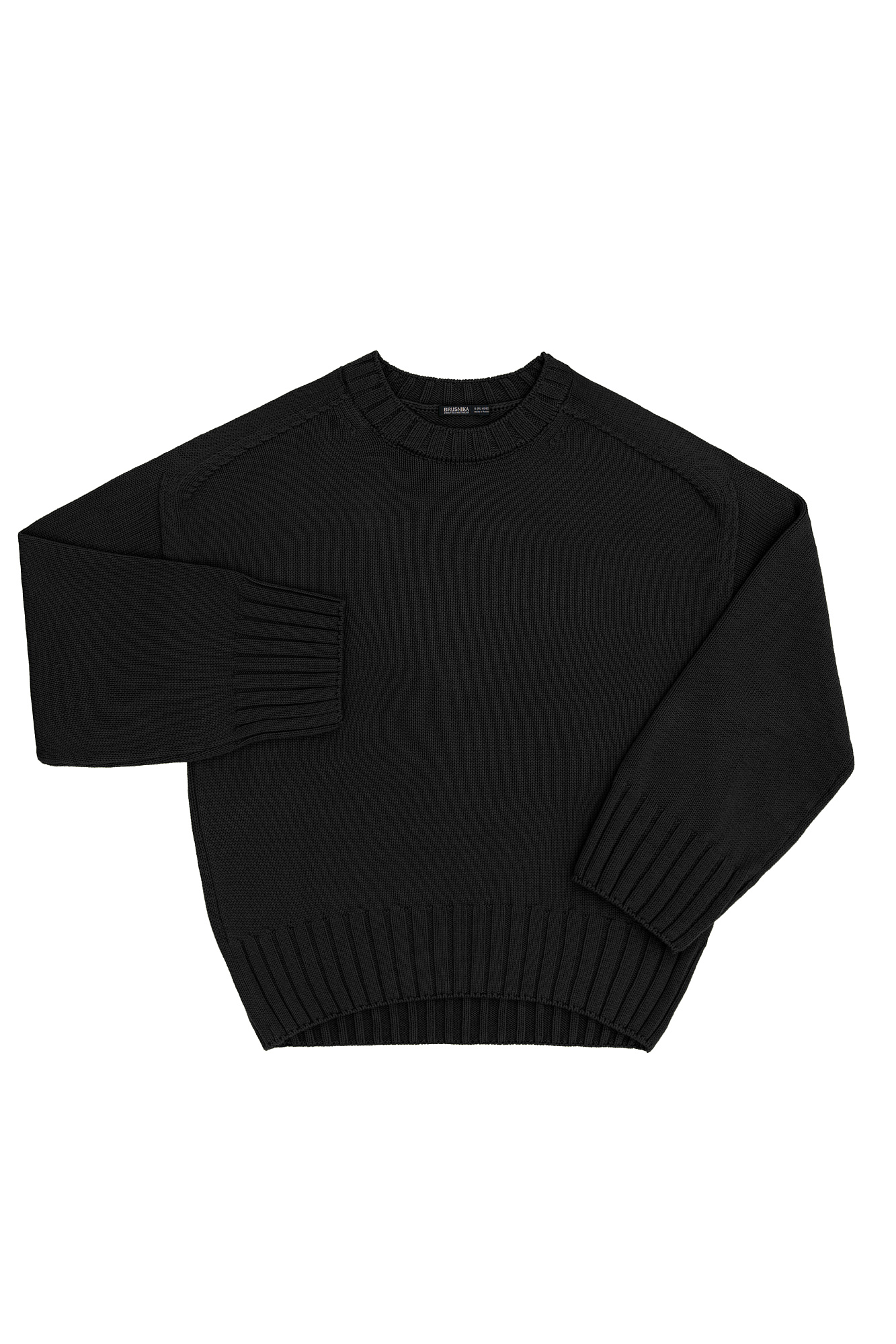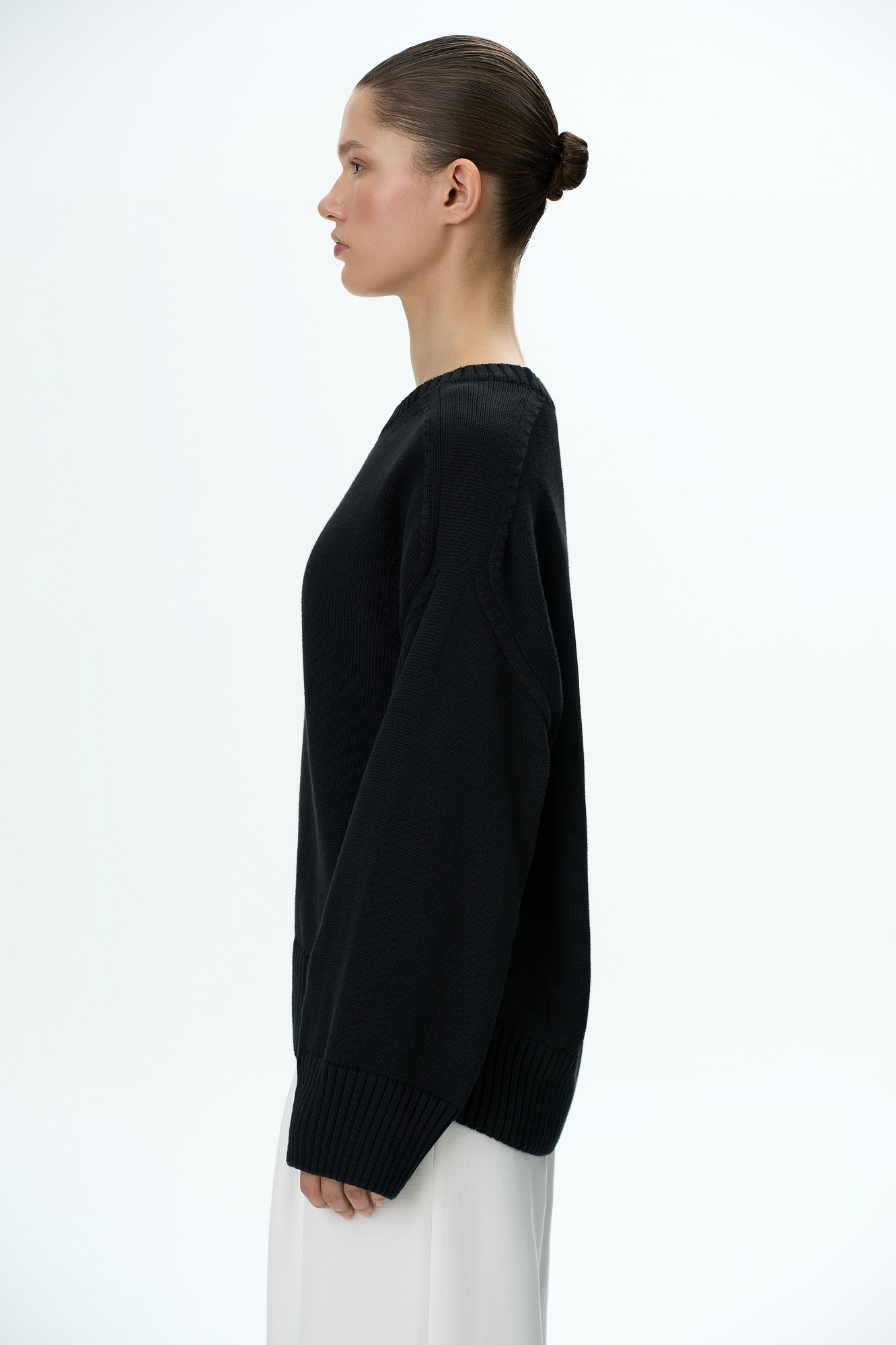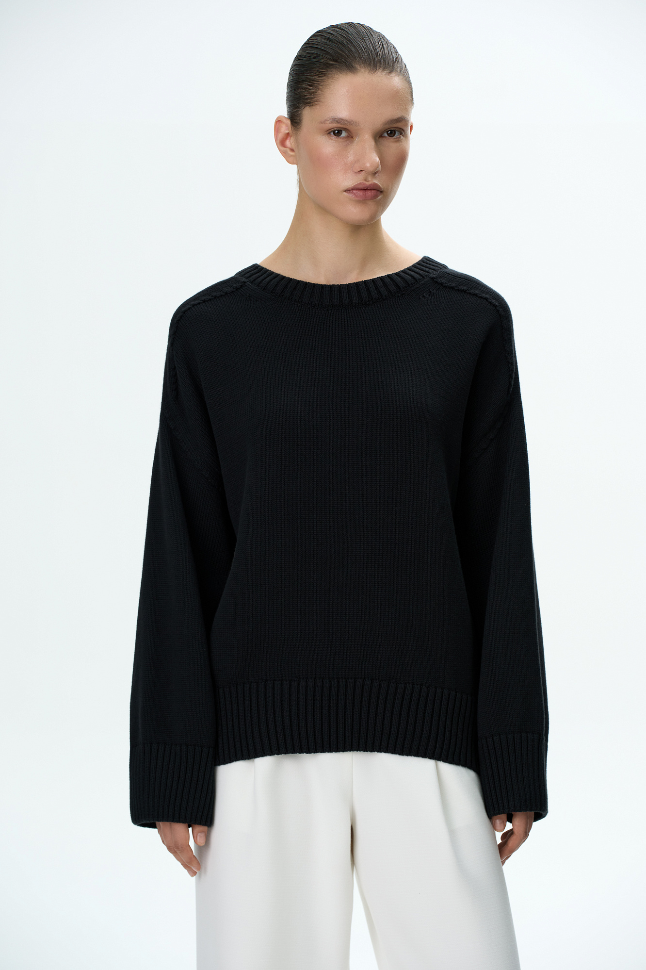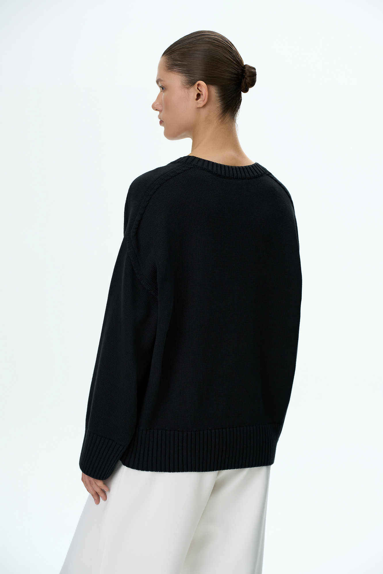 Трикотажный джемпер из 100% хлопка. Модель свободного силуэта со спущенной линией плеча и удлиненной спинкой.