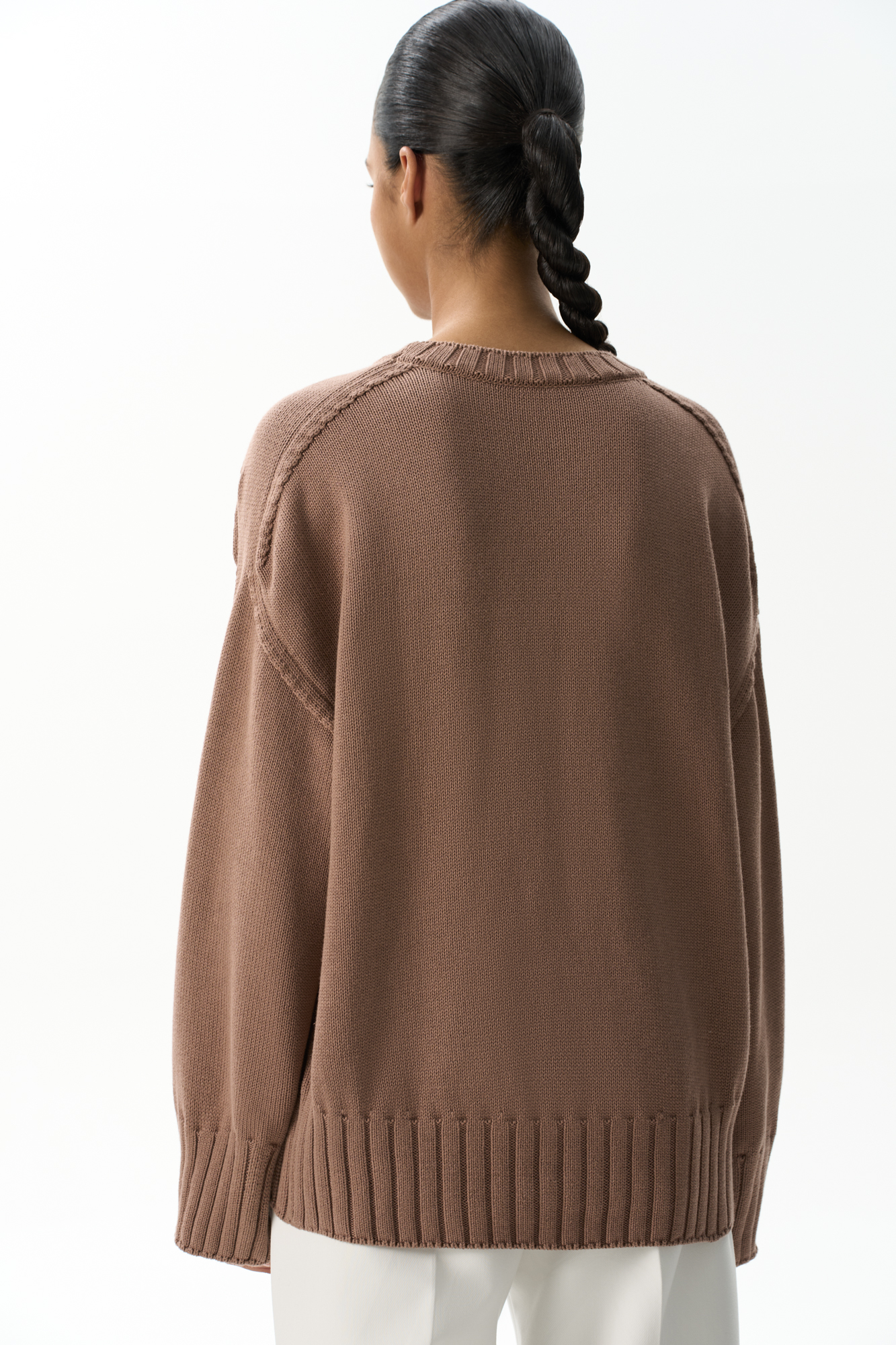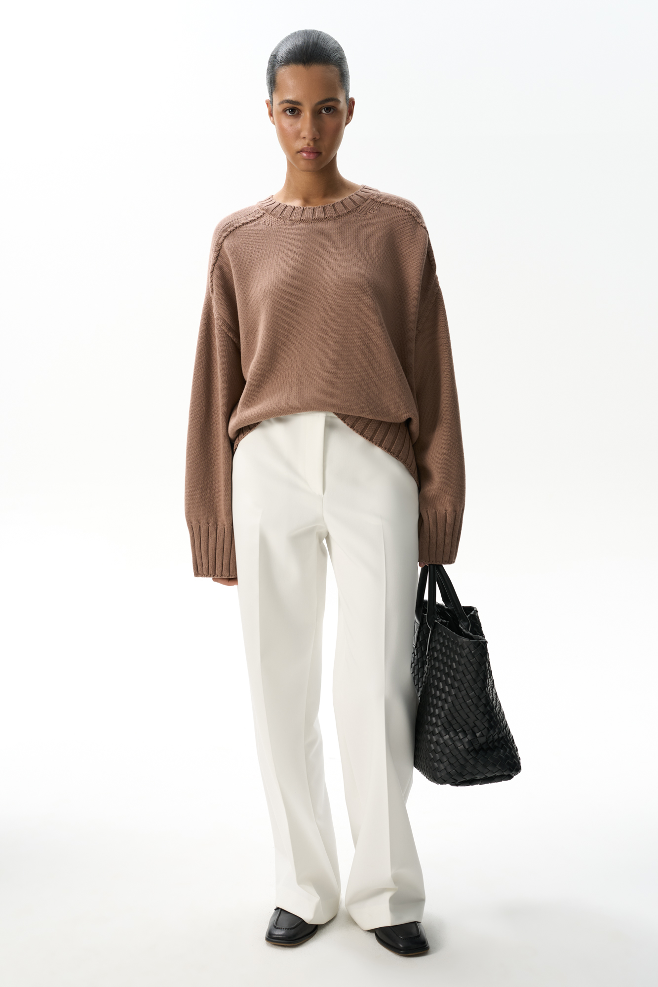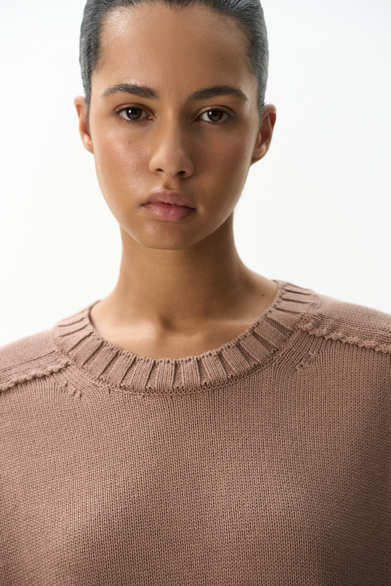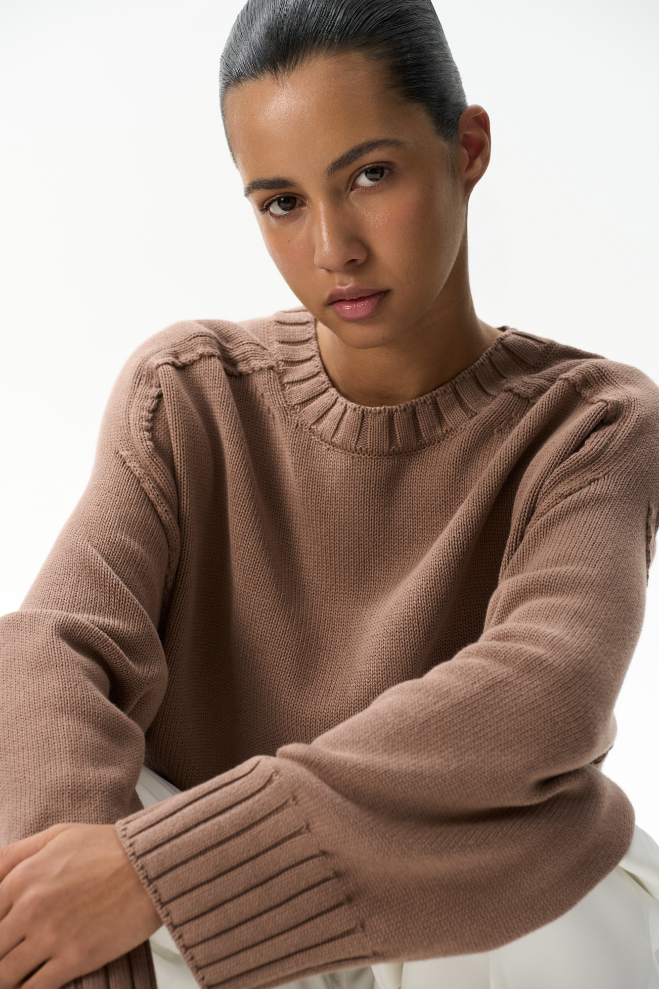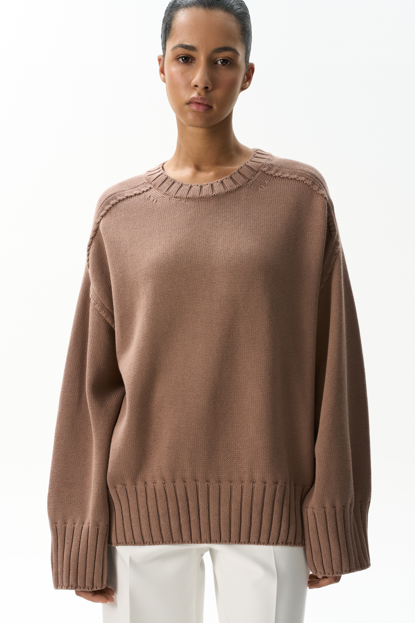 Трикотажный джемпер из 100% хлопка. Модель свободного силуэта со спущенной линией плеча и удлиненной спинкой.