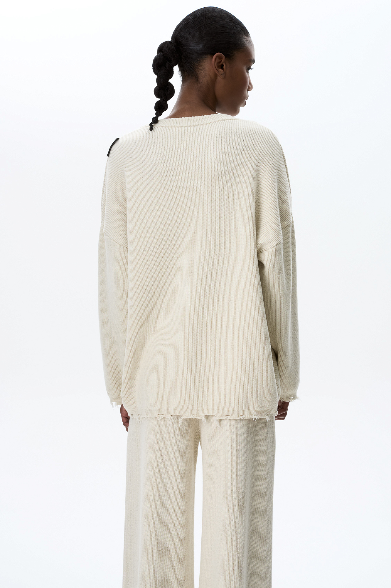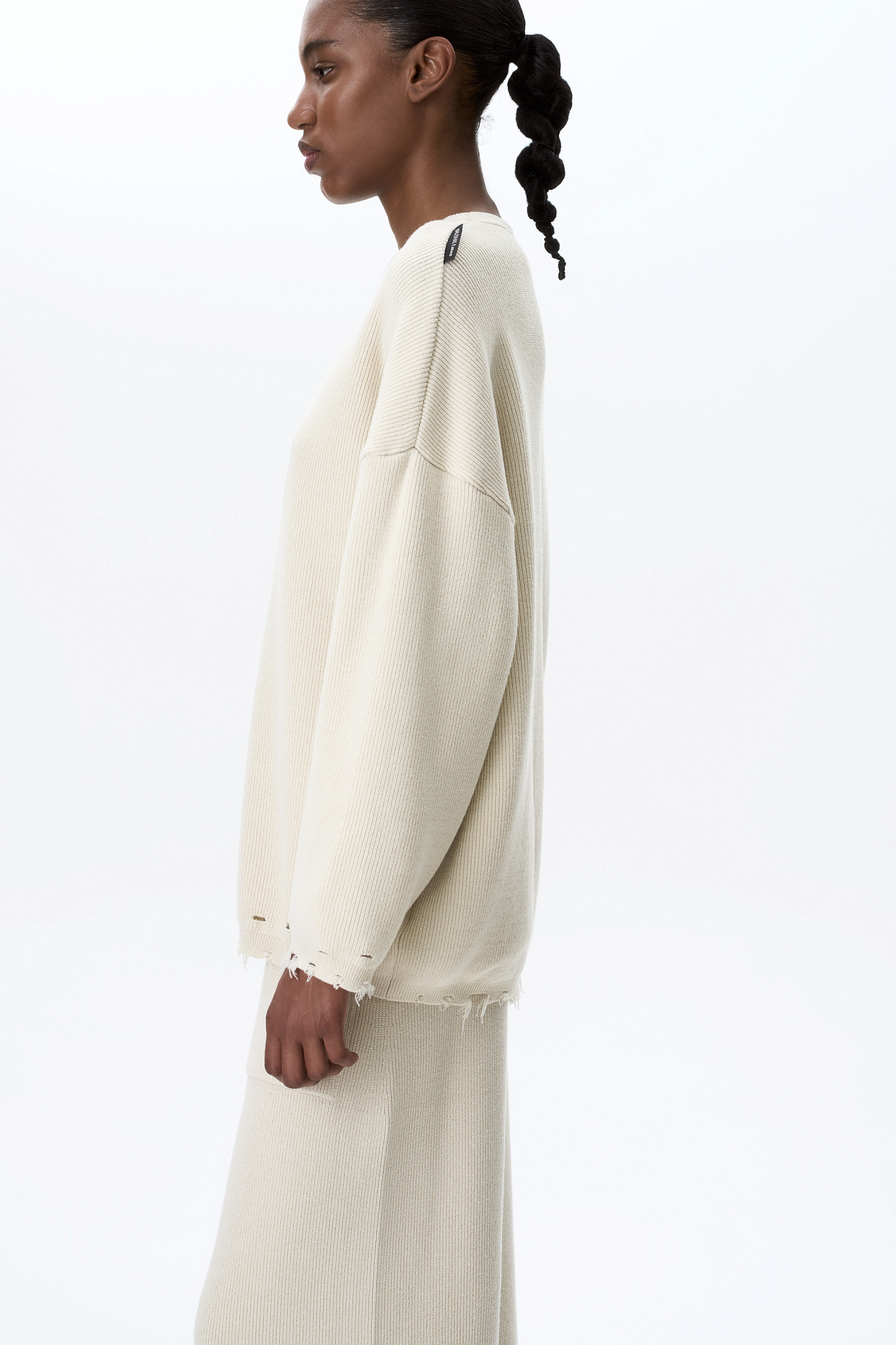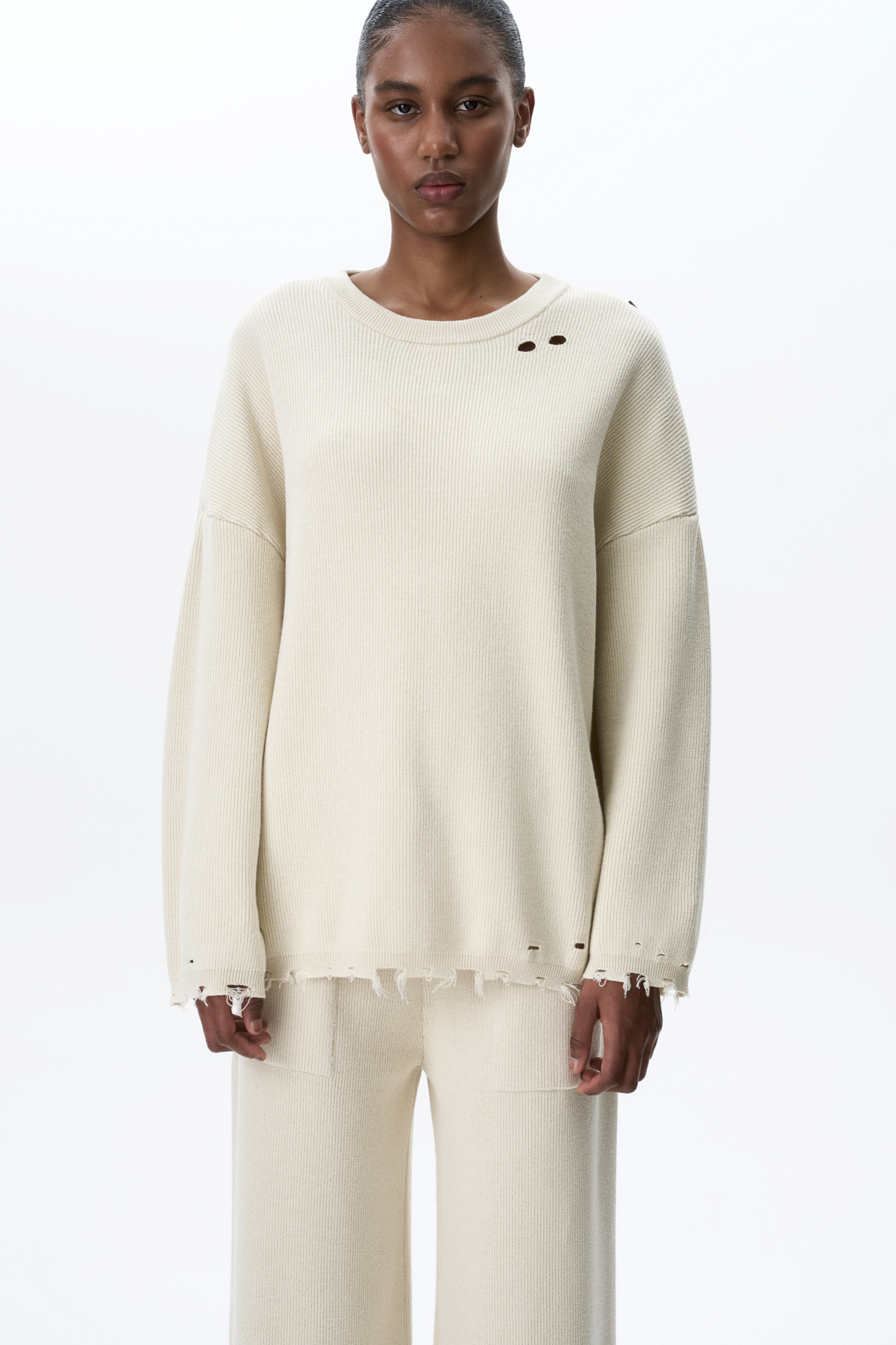 Трикотажный джемпер из хлопка с добавлением вискоза. Модель свободного силуэта со спущенной линией плеча и круглым вырезом горловины. Изделие декорировано имитацией драни и необработанным краем.