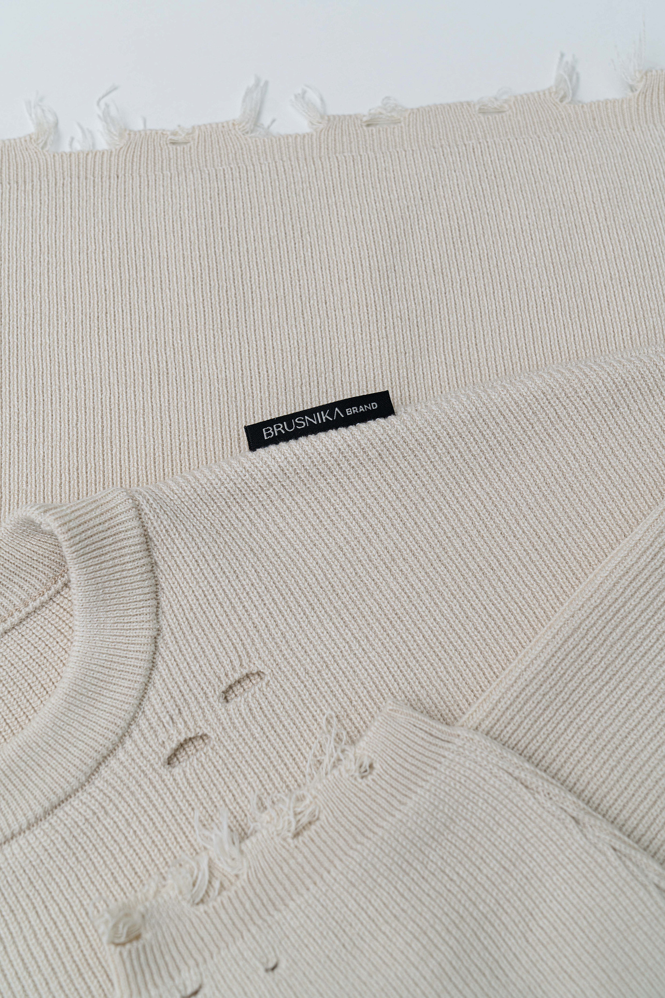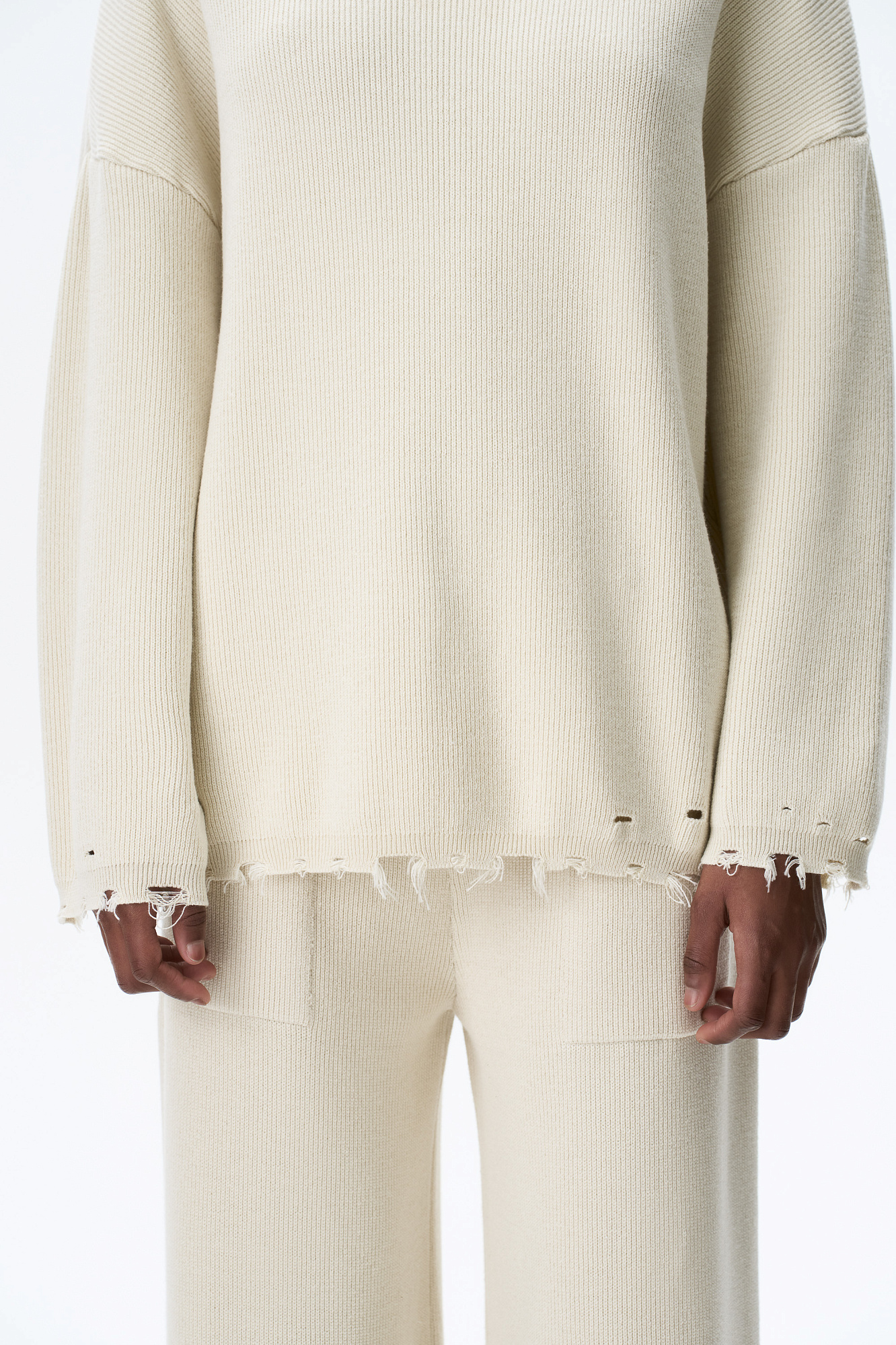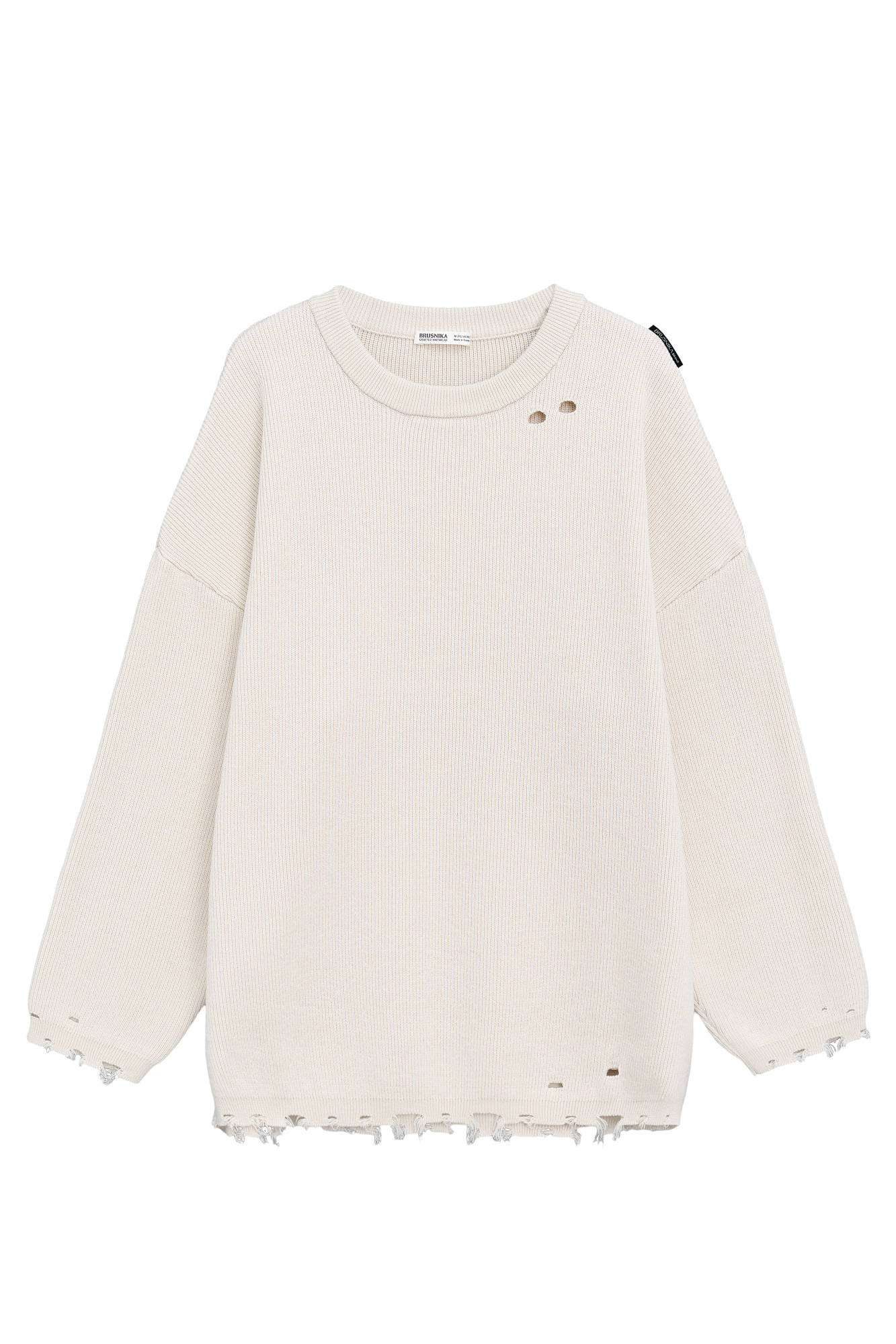 Трикотажный джемпер из хлопка с добавлением вискоза. Модель свободного силуэта со спущенной линией плеча и круглым вырезом горловины. Изделие декорировано имитацией драни и необработанным краем.