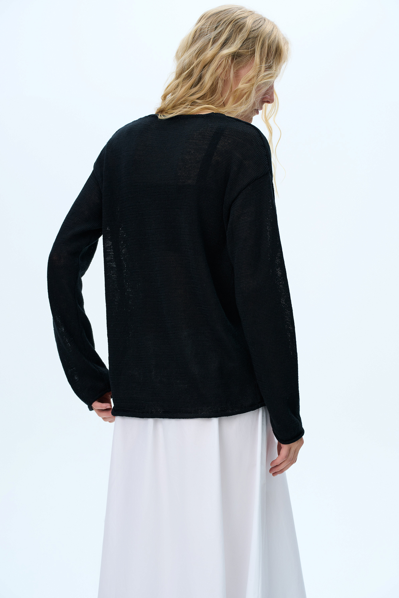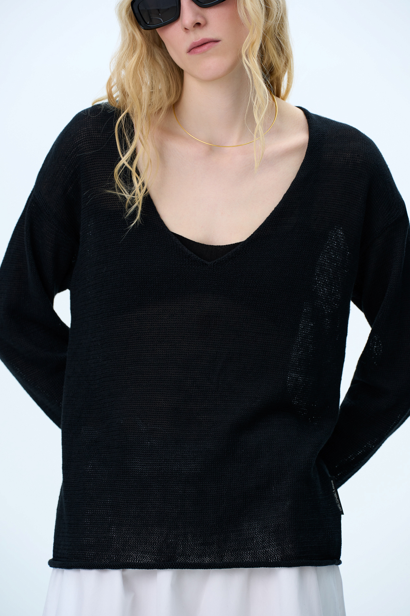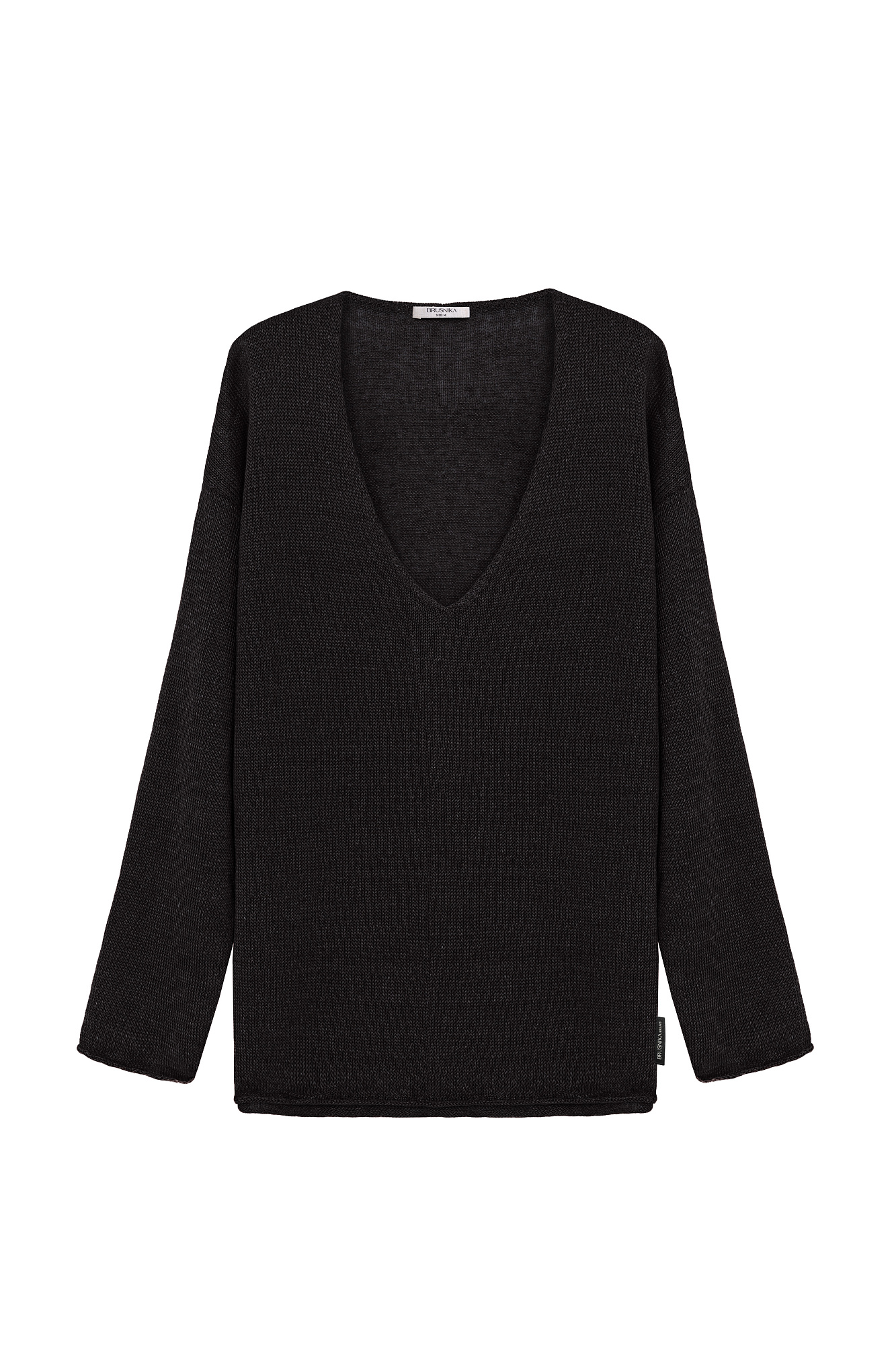 Трикотажный джемпер из 100% льна. Модель свободного силуэта с длинным рукавом и с V-образным вырезом горловины. Изделие декорировано брендированным ярлыком сбоку и валиками по низу.